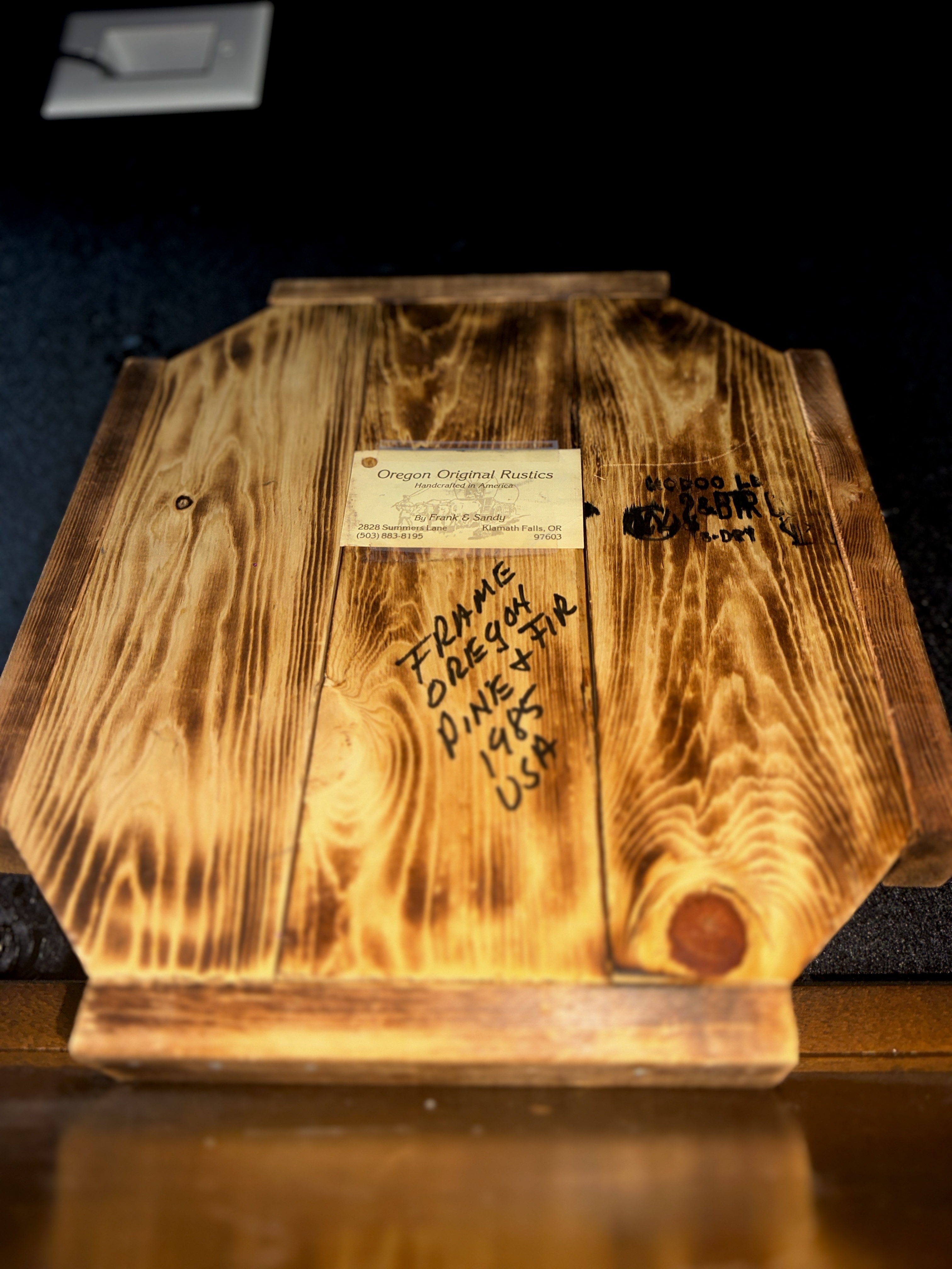 This appraisal covers a rustic woodburned portrait wall plaque featuring John Wayne, crafted by Oregon Original Rustics in 1985. The piece is executed using pyrography on solid wood, specifically Oregon pine and fir, and is framed with a hand-assembled wood surround.