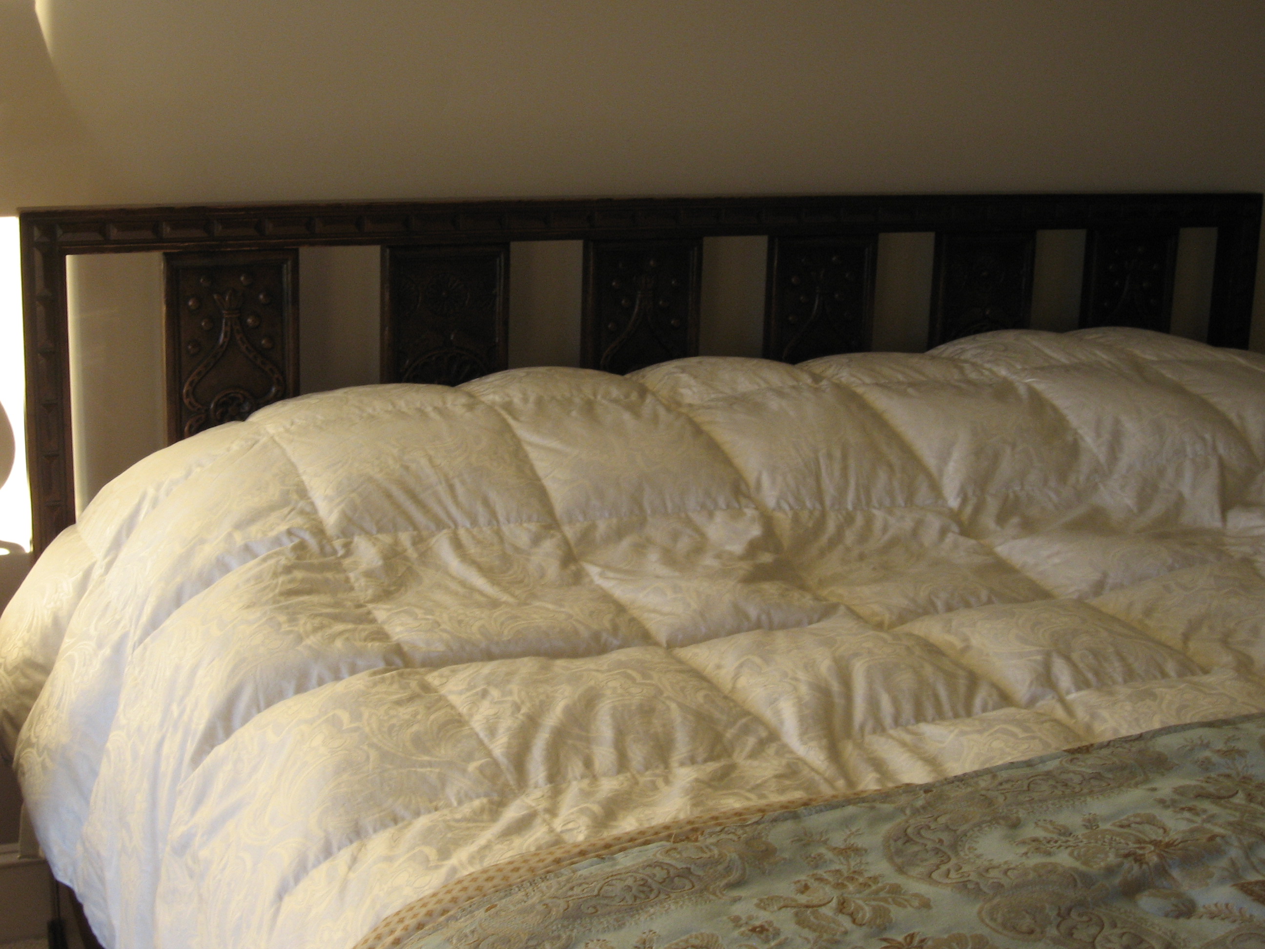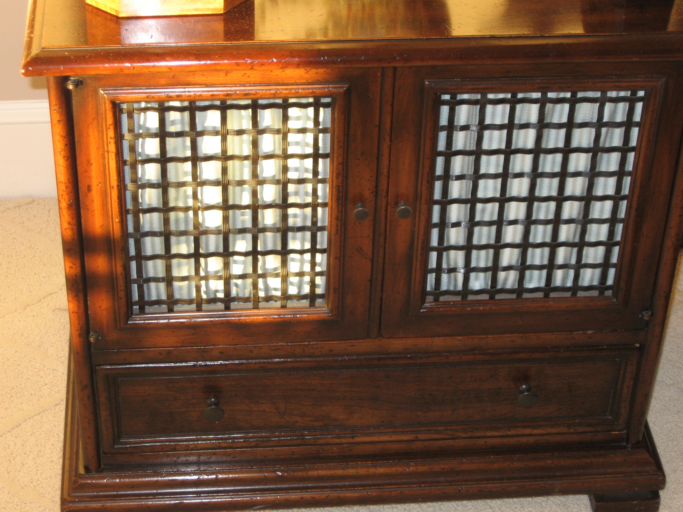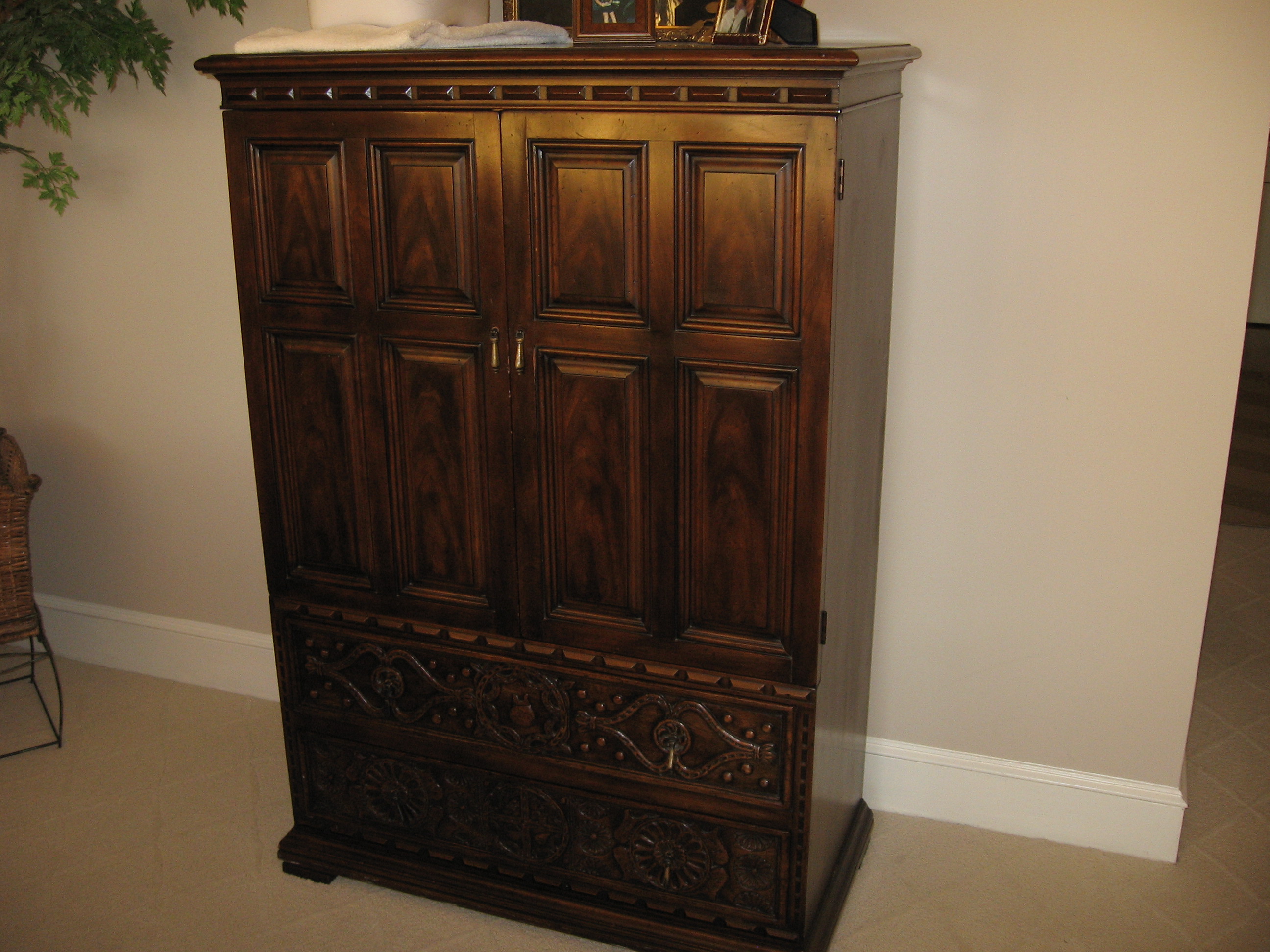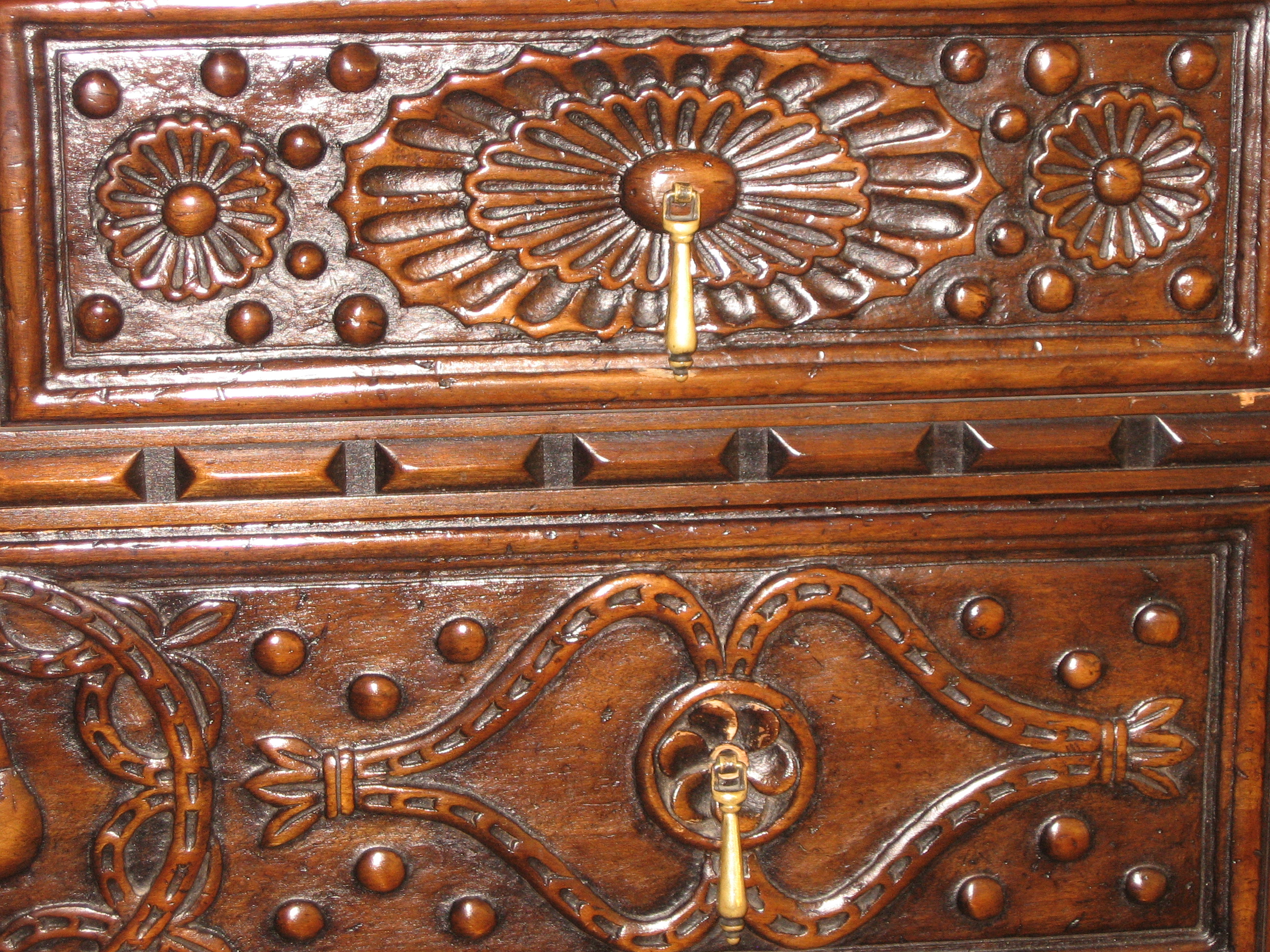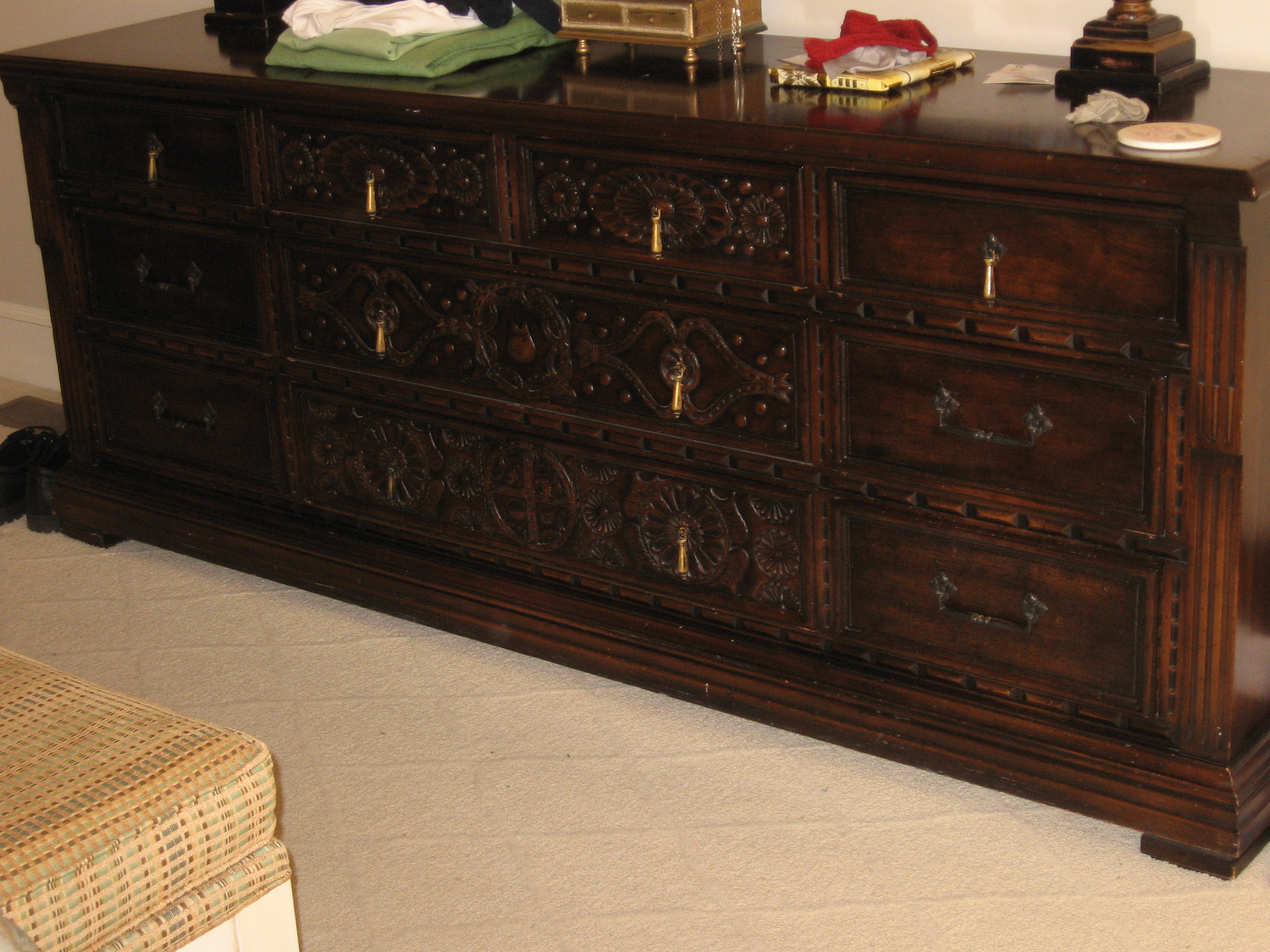 This set was purchased in 1996 in NYC at a designer show. It is in excellent condition. As you can see by the photo labeled Triple Close up, it has beautifull carvings with tear drop handles. The be is for a king size but does not handle the new length mattresses but changes were made to allow this. I am not sure which Widdecomb designer did this set.