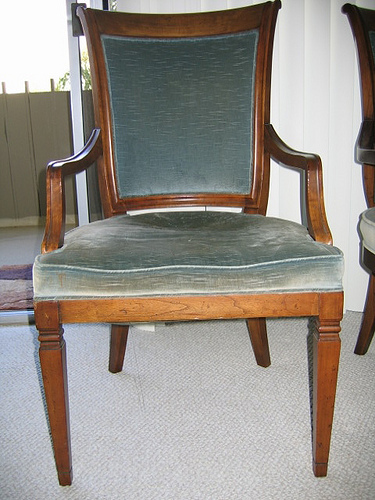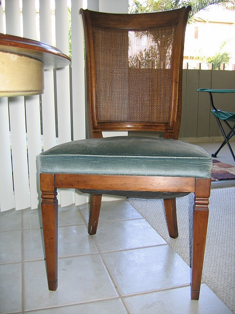 It is a beautiful piece, its got 6 chairs where 2 have arm rests and are the end chairs and they are all velour, the seating part and the back rest. The other 4 chairs are velour on the sitting area and the back rest is weaved and they do not have the arm rests.