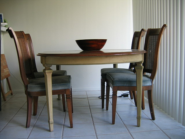 It is in good condition, but chairs need to be re upholstered and the table now has a piece on the round edge under the top that is unglued a bit. I assume it is a simple restauration process.