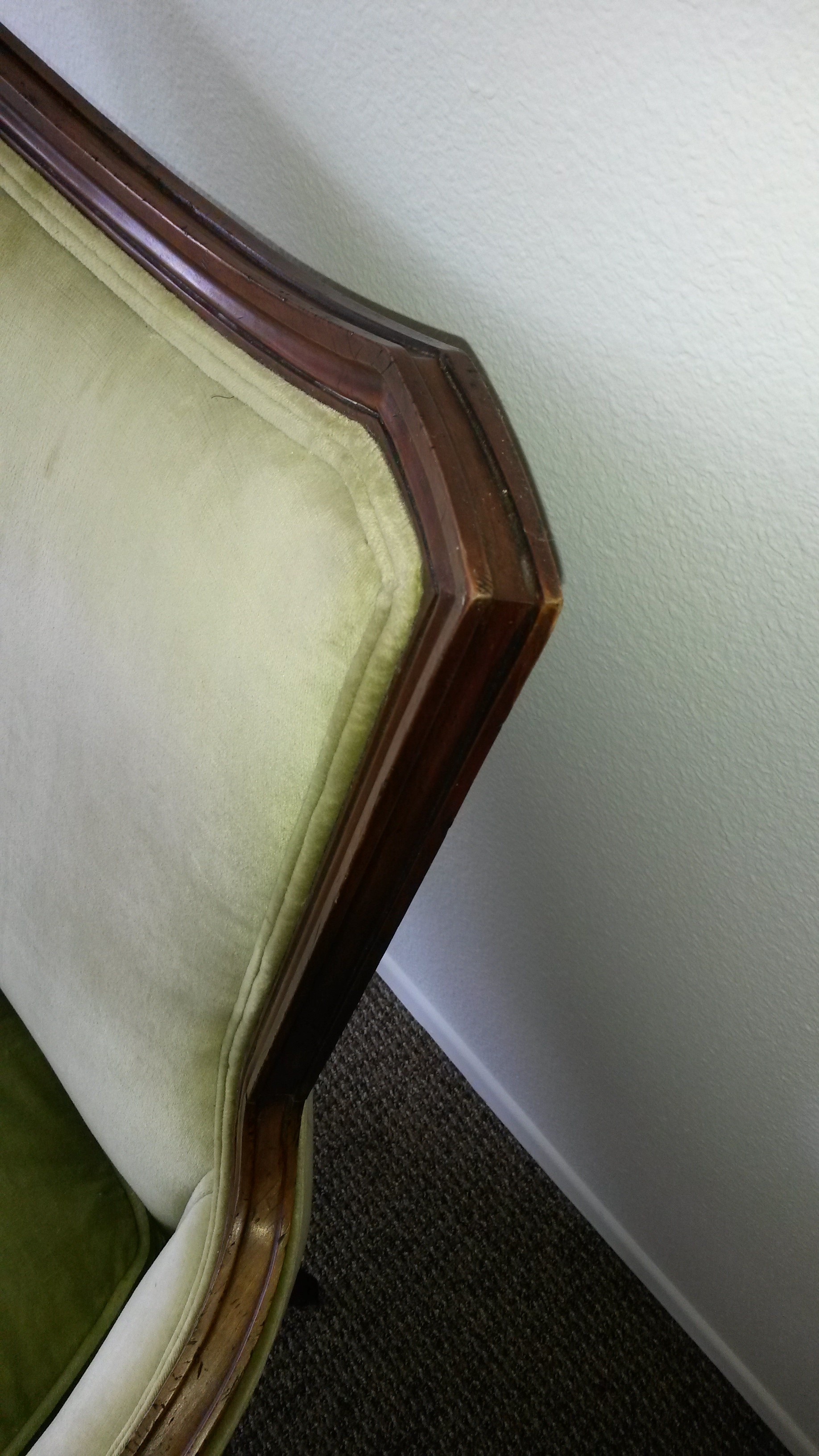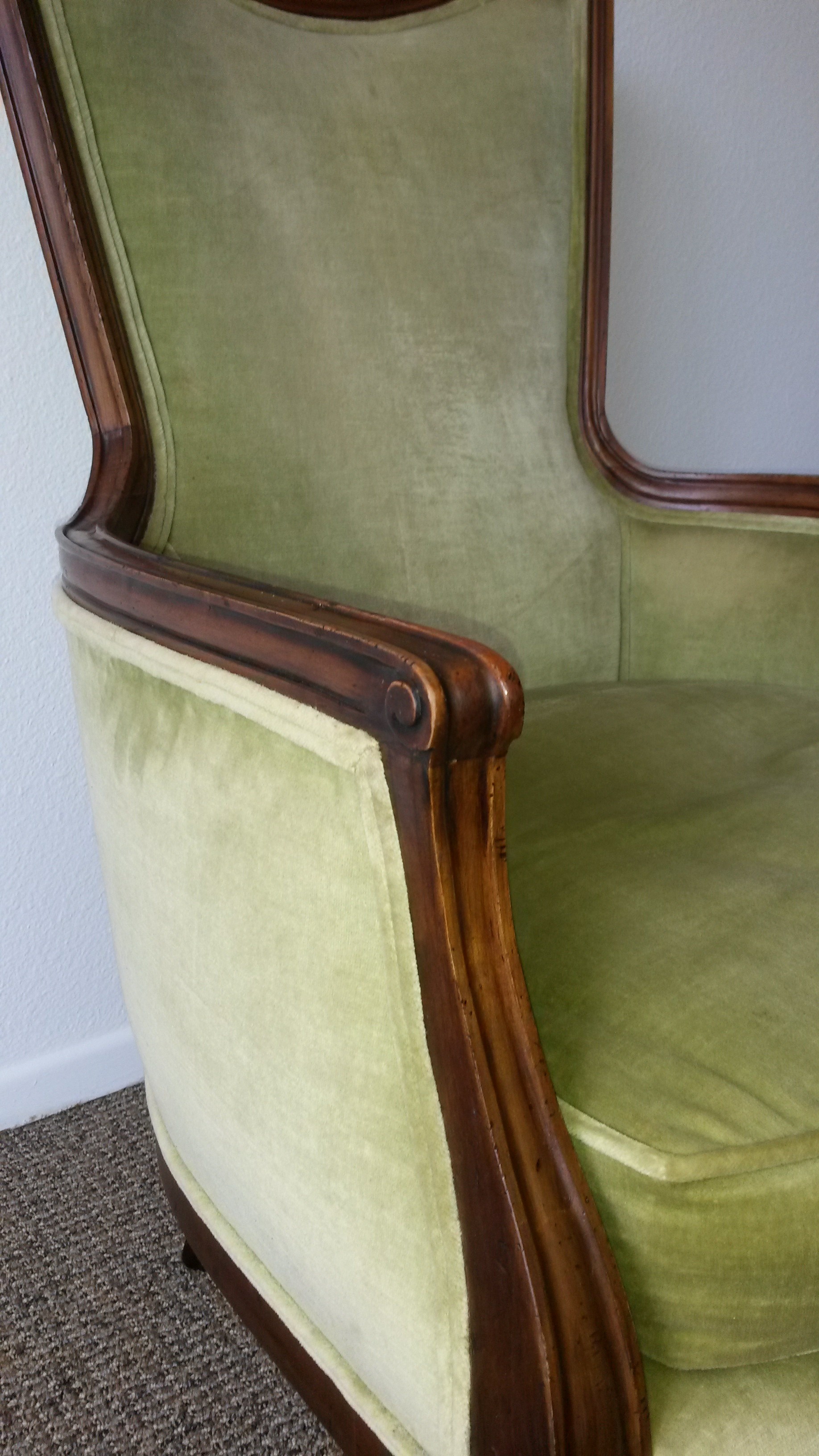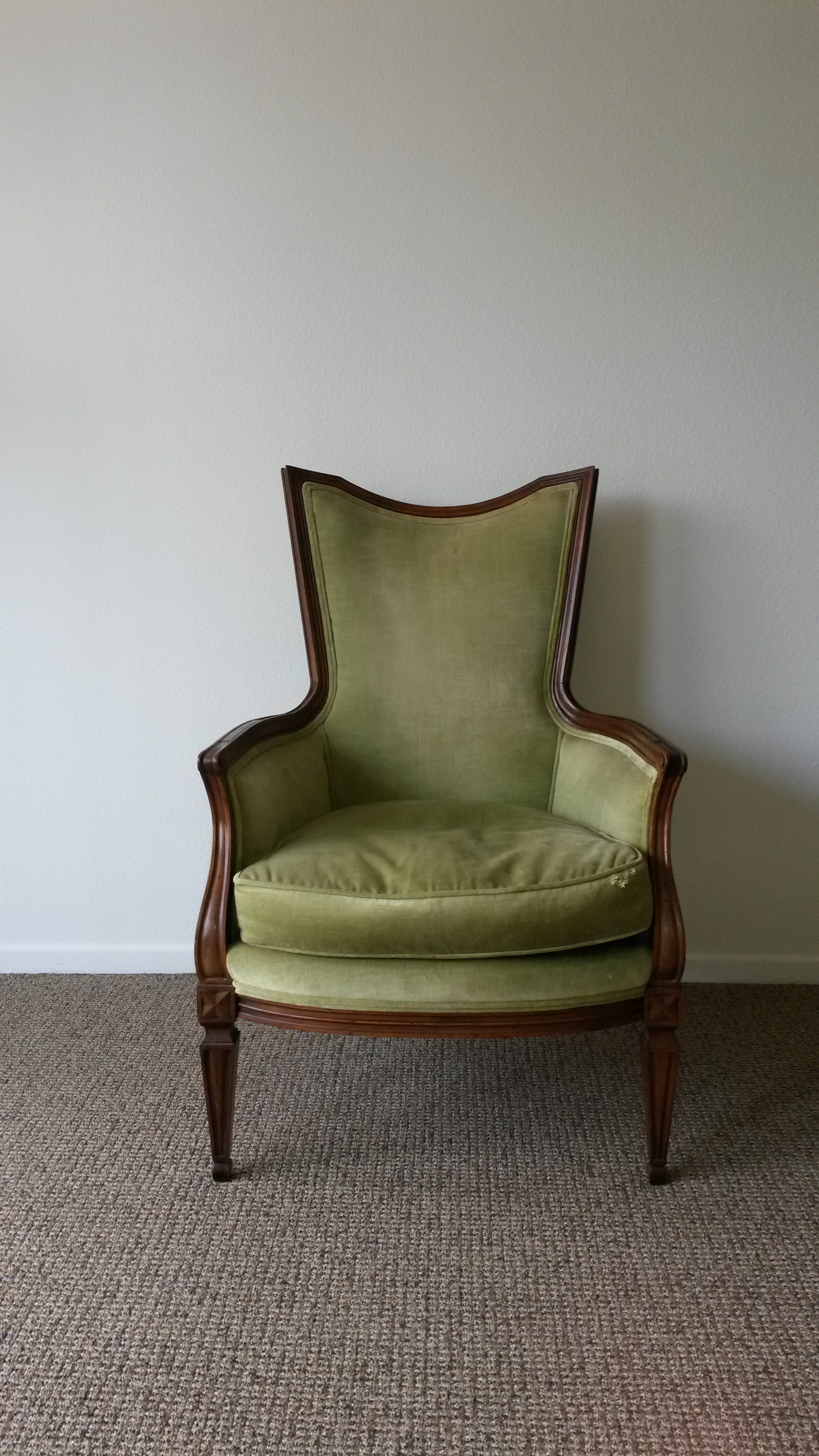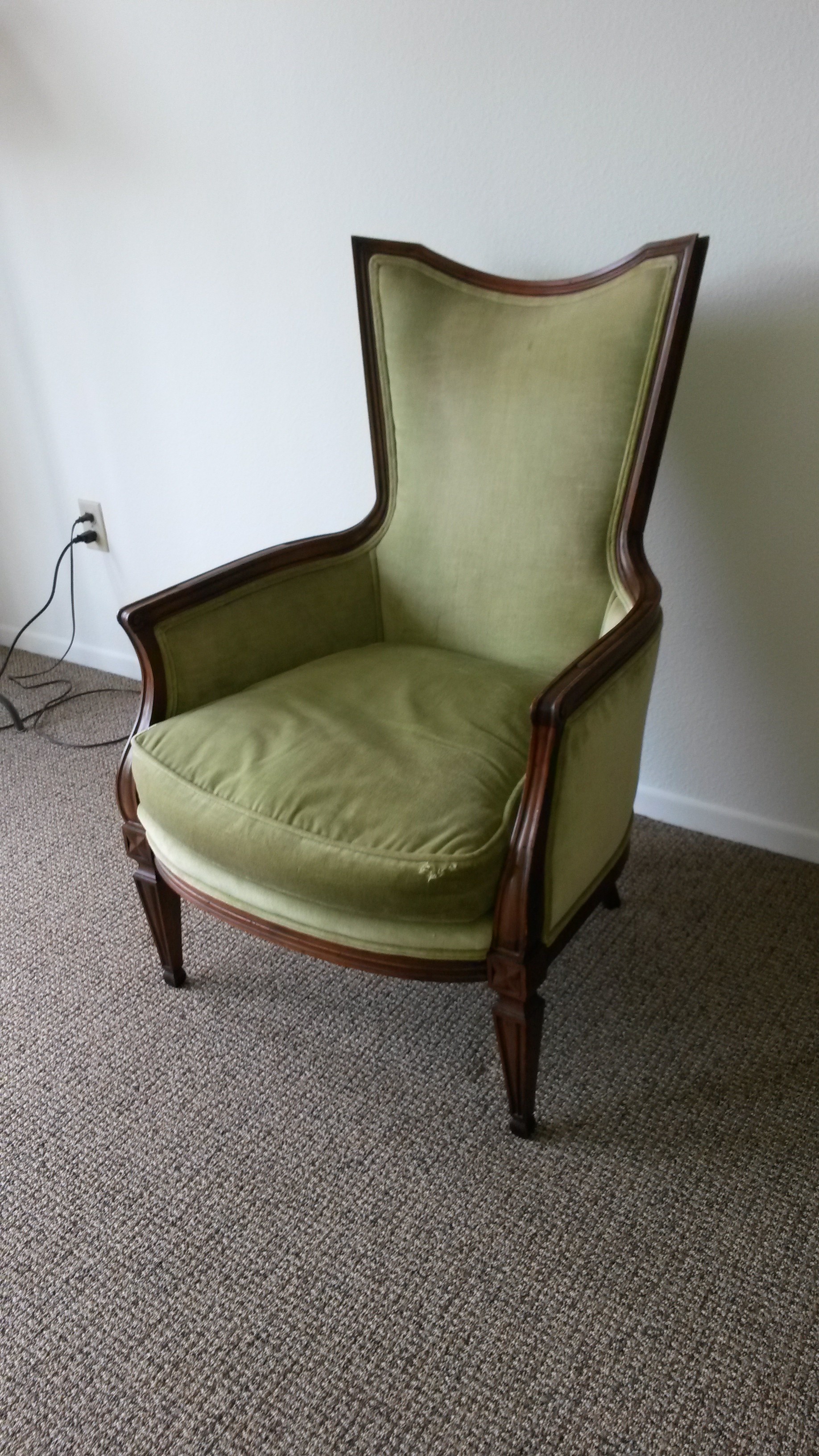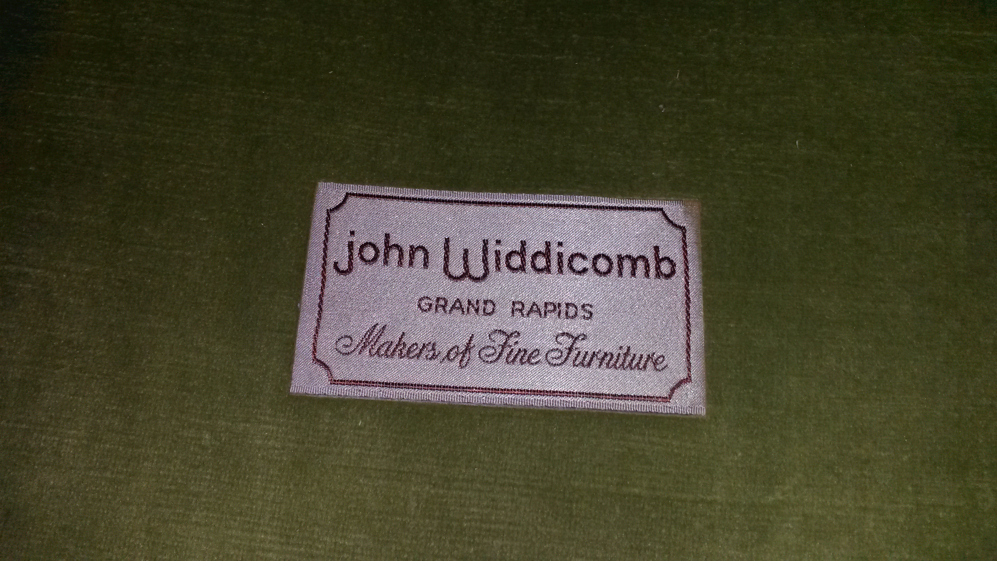John Widdicom lounge chair. My guess would be that it is from the 1950's based on the design of the logo. Frame is mahogany or teak and fabric is light green velvet. It is in pretty good condition. Only known damage are the little holes on the front of the seat cushion.
