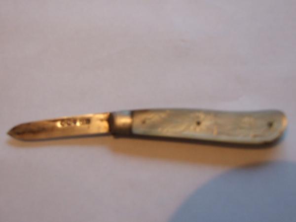 beautifull fruit knife. pearl handle with flowers inlaid. silver knife with crown, lion and old style letter g all surrounded by a shield. and J.Y.C next to it