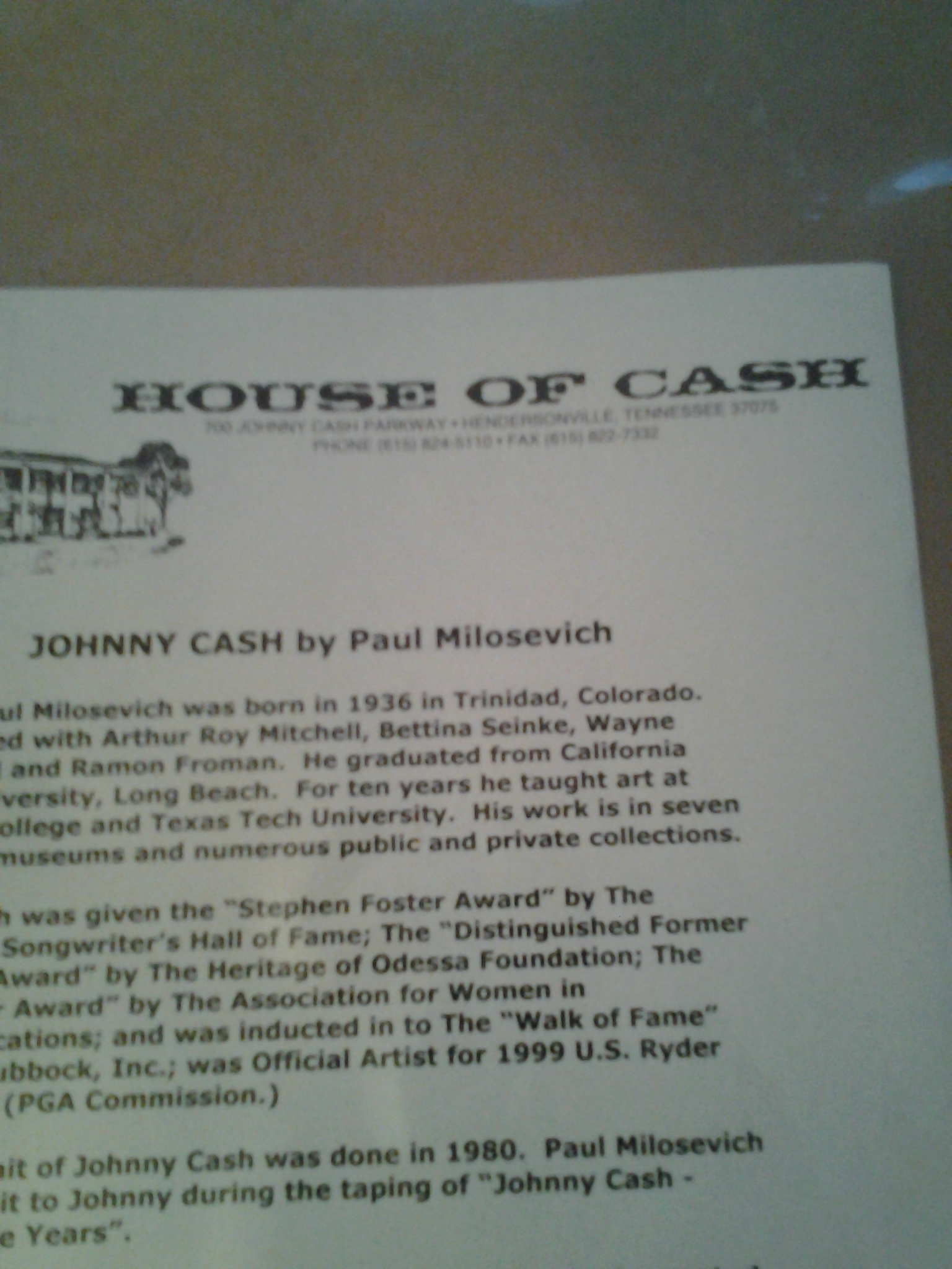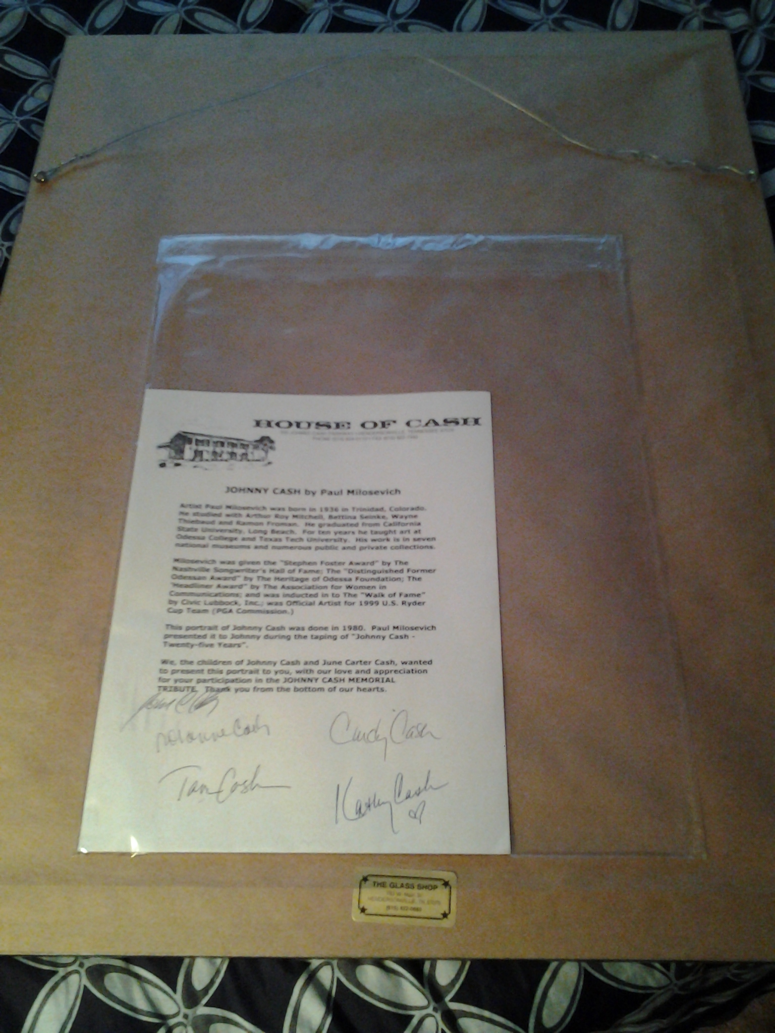 Johnny Cash hand drawn by Paul Milosevich. Numbered 427/1000. It is signed by all of his children - Roseanne, John, Tara, Kathy, and Cindy on a House of Cash paper. It measures in the frame 26 1/2" height by 20 1/2" length. It is framed by The Glass Shop.