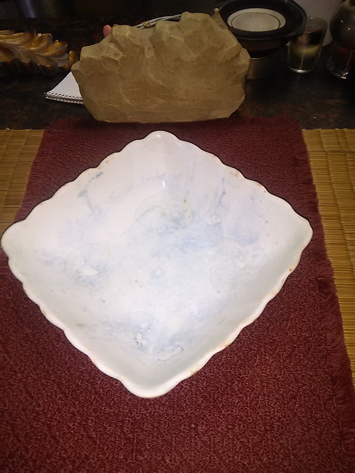 I have a nine inch square Bowl Its top side is roundish square with rounded corners. It is blue pastel in color with seemingly watermark inlay. that looks like its the pattern look at manufacturing.