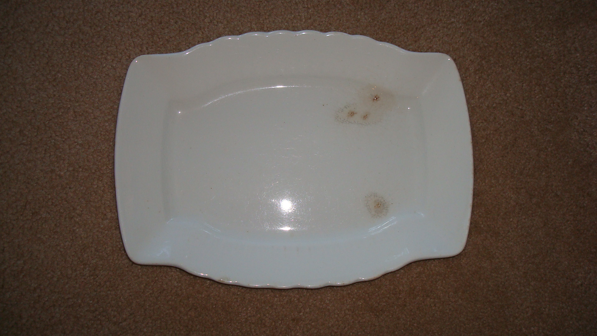This platter has scalloped edges all along the long part of this platter with indentations from those scallops going down th the flat part. It measures 14" long and 10" wide. It has the mark of Johnson Brothers Royal Ironstone England on the bottom. I have looked up the marking and it is dated 1883-1913. I cannot find this platter anywhere and all I have done is search. If you can find some information on it for me please email me at: [email protected]. I have been looking for days and this seems to be a very unusual patterned platter. I did click that it was for sale but I am still not certain if I want to sell it. If the price is right; maybe. Please help me. I don't know what or where else to look. Thank you so very much. I just hate not knowing.