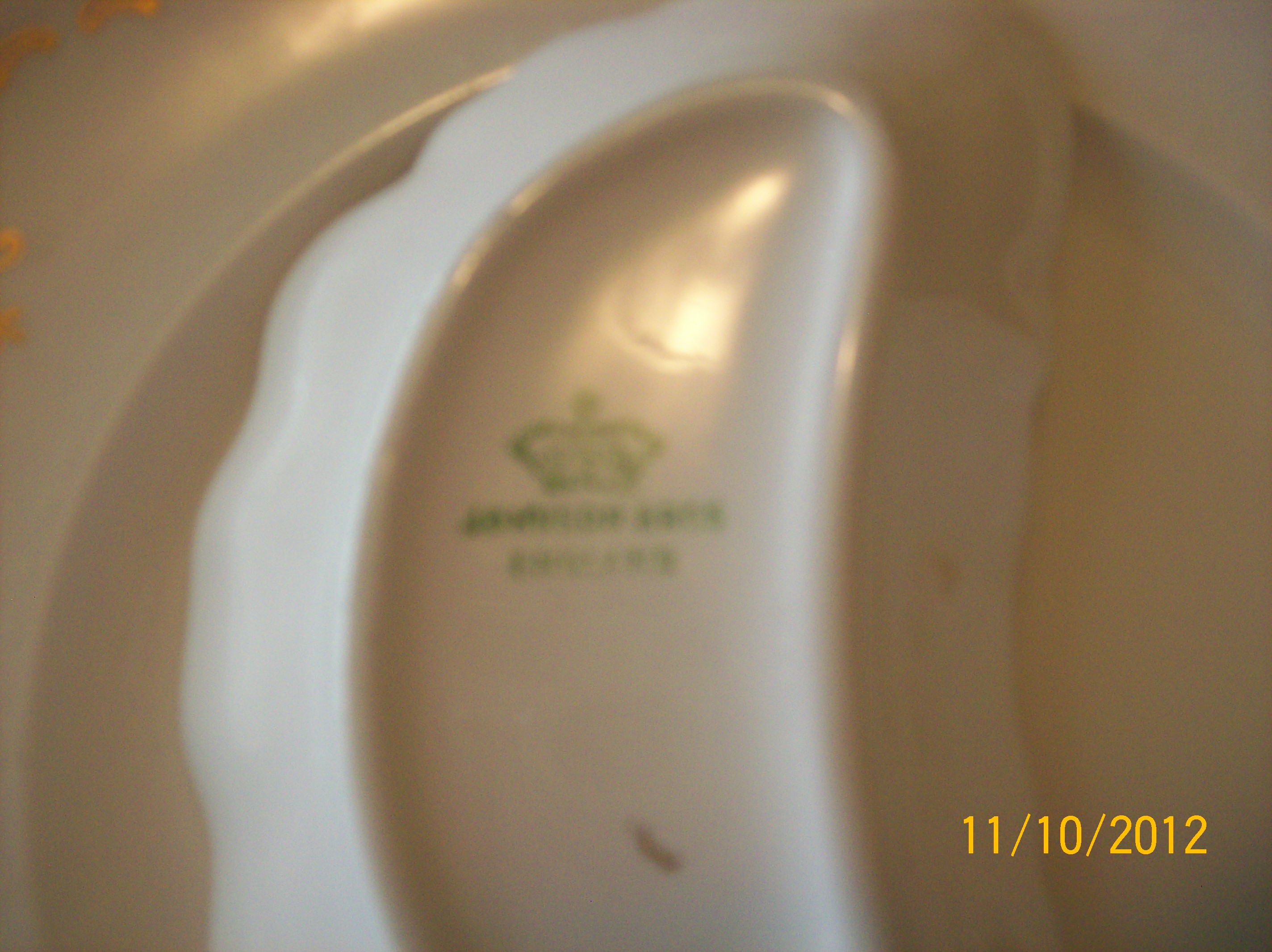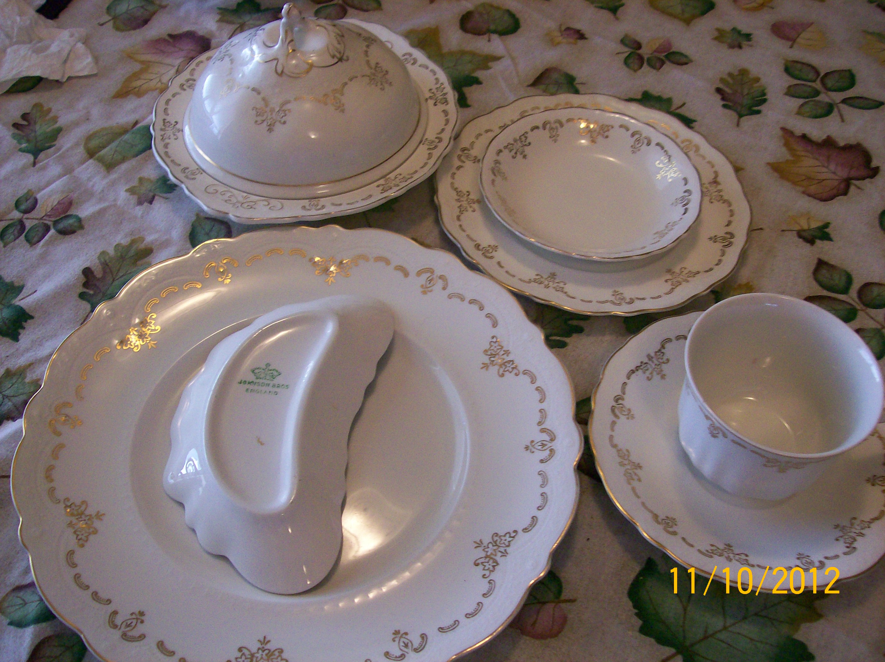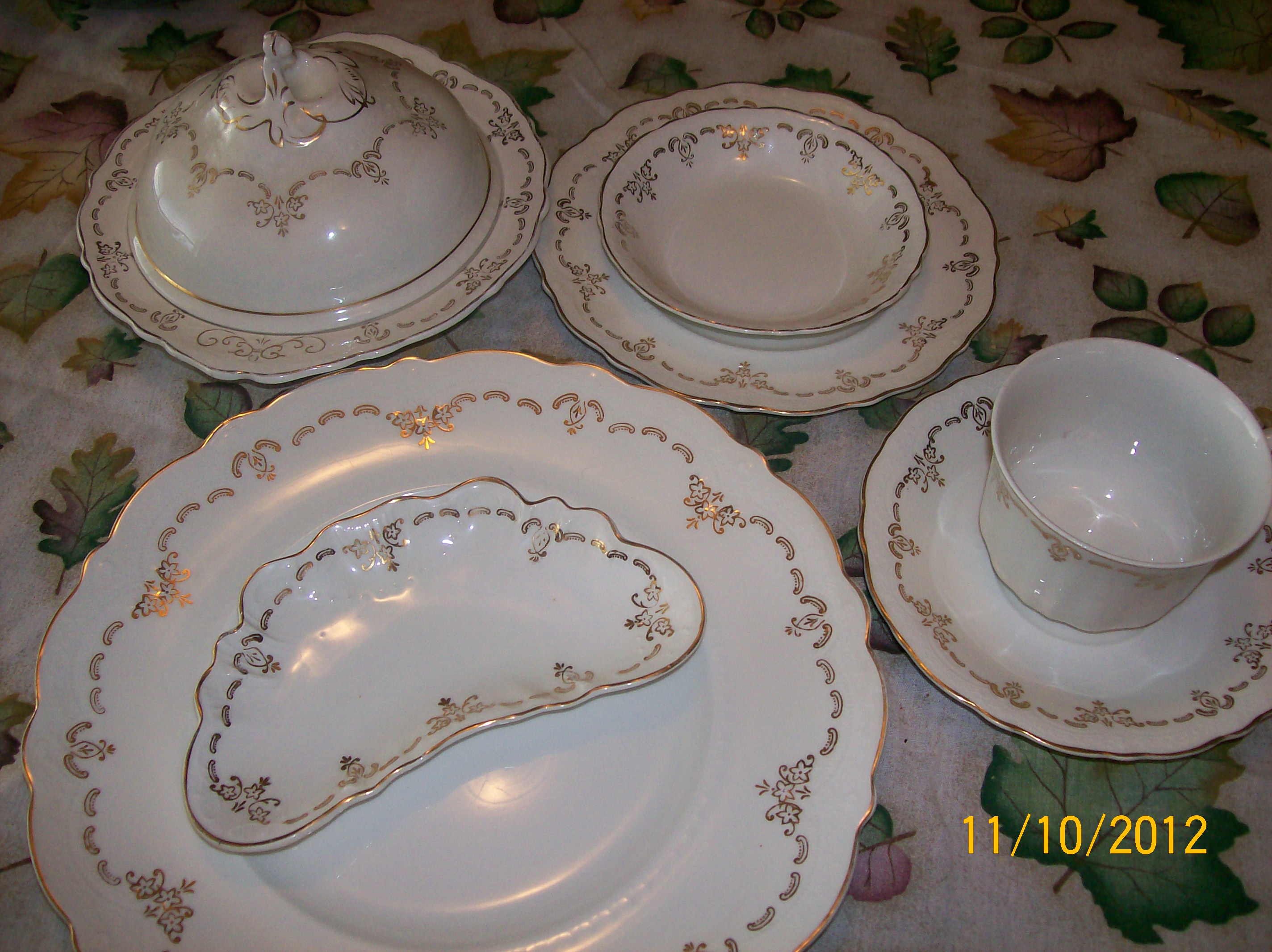 10 piece place setting of china; very old, has a floral design in gold that goes around the plates, and platers, bone dishes, cups, and tea sets. The background is all white, though with age appears to have turned slightly ivory. Stunning set, I haven't seen anything like them