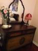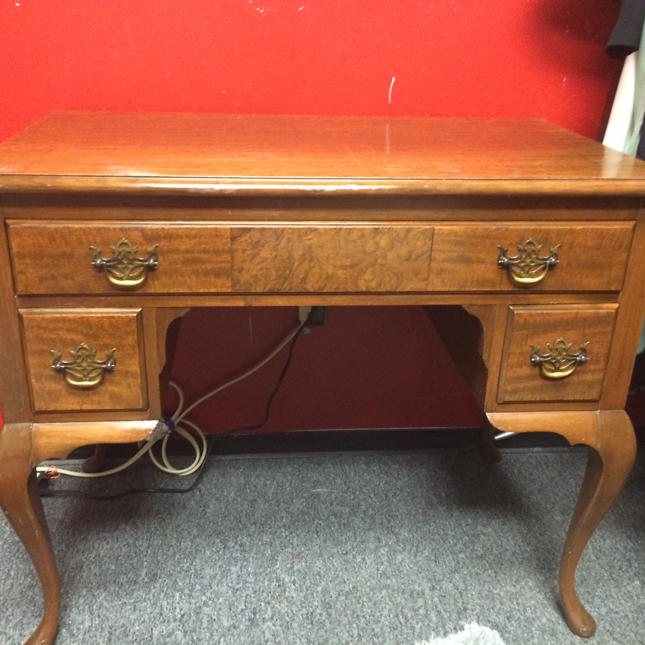 It's in very good condition . Has one large drawer and two small drawers, one on each side,