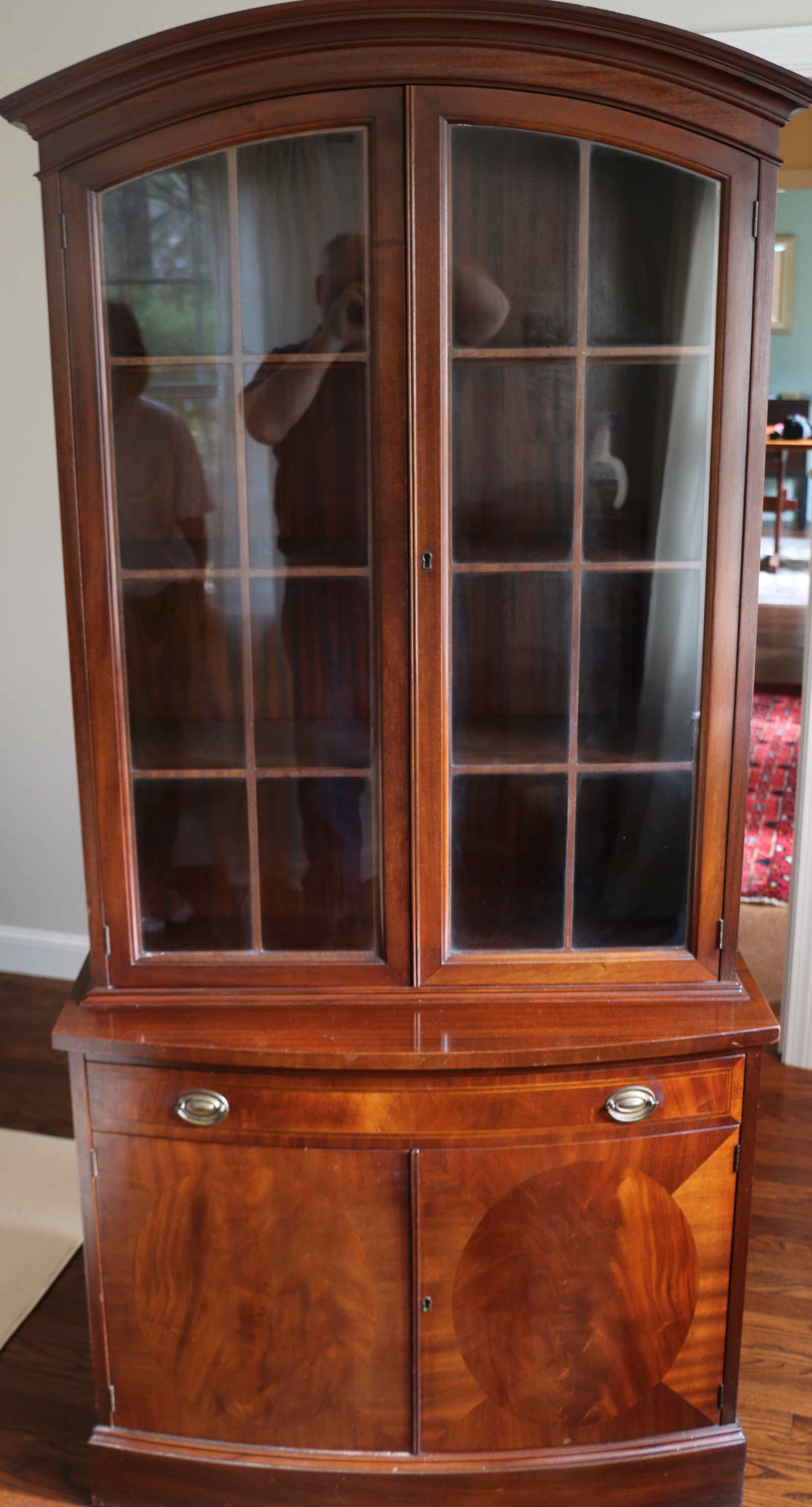 Johnson-Handley-Johnson hutch with upper glass door, four shelves; two middle drawers and wood vener lower doors. Circa 1930s.