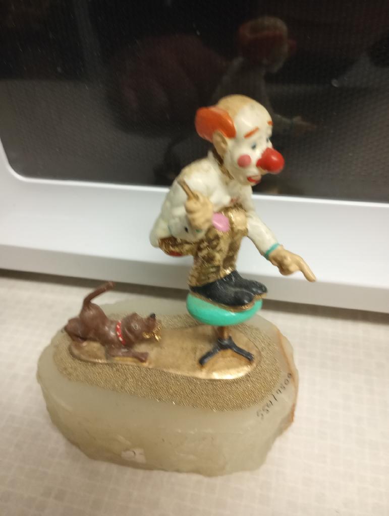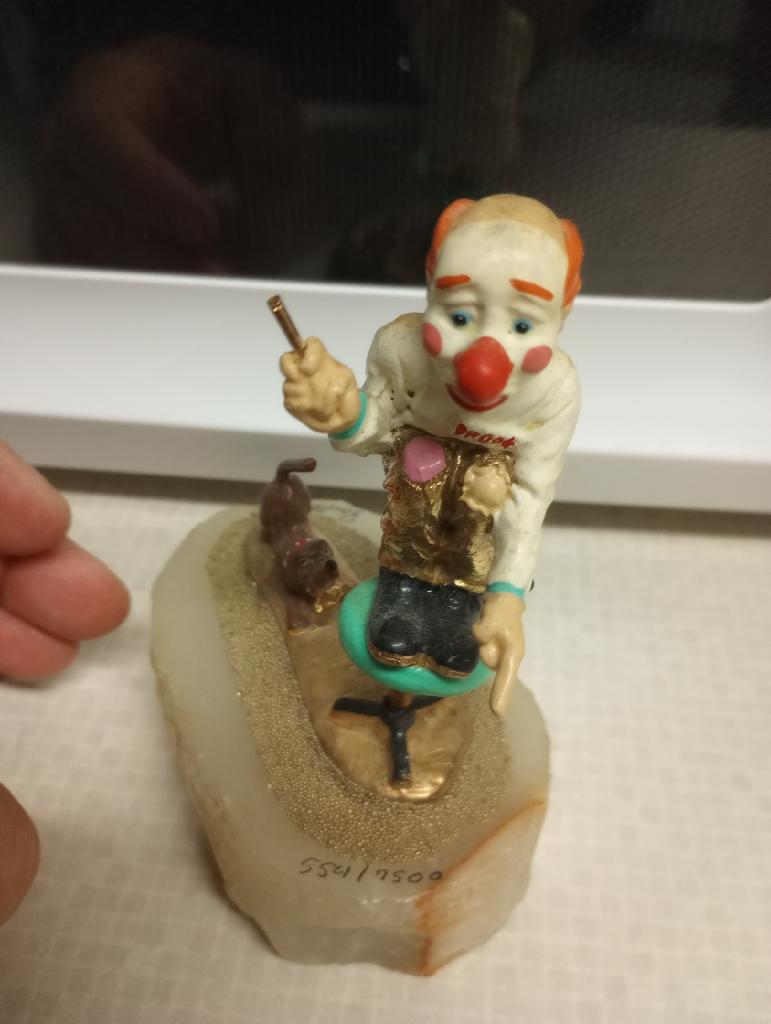 John Lee Clown Sculpture, I don’t have too much information on the item but I do know that the name mentioned is imprinted on the piece, as well as the code “554/7500” written in black ink on the front. The sculpture seems a bit dirty but there is not much visible wear other than that.