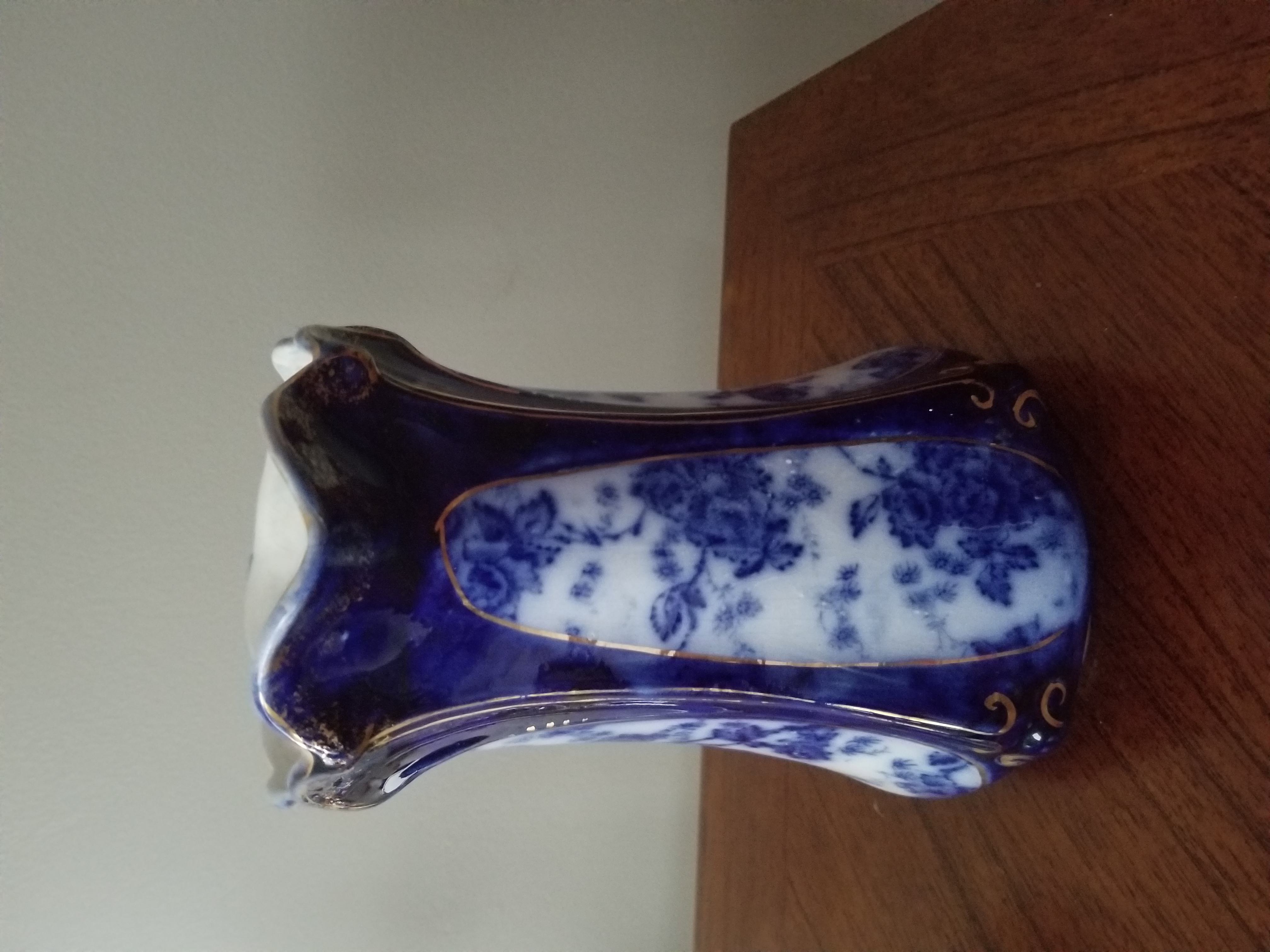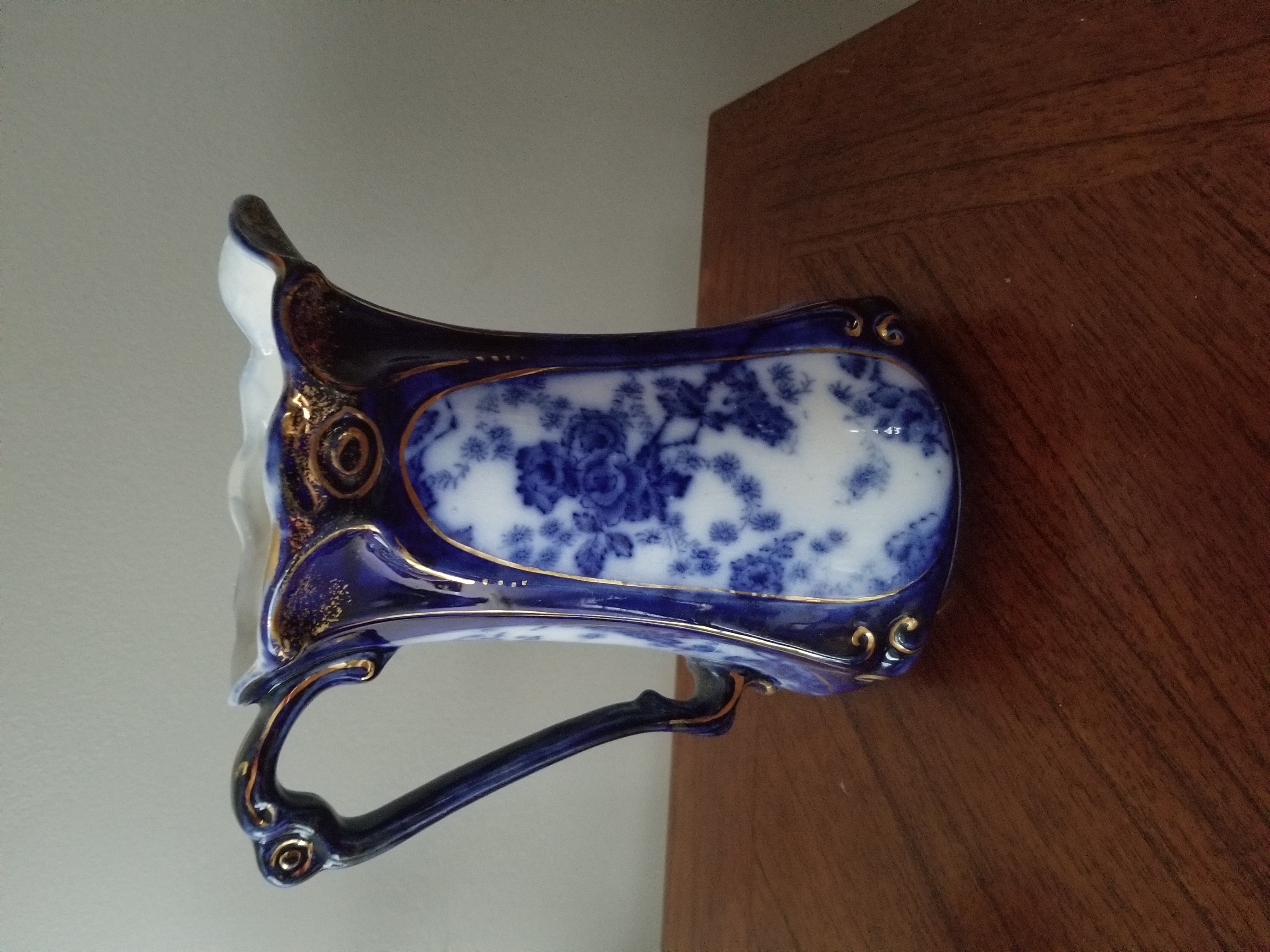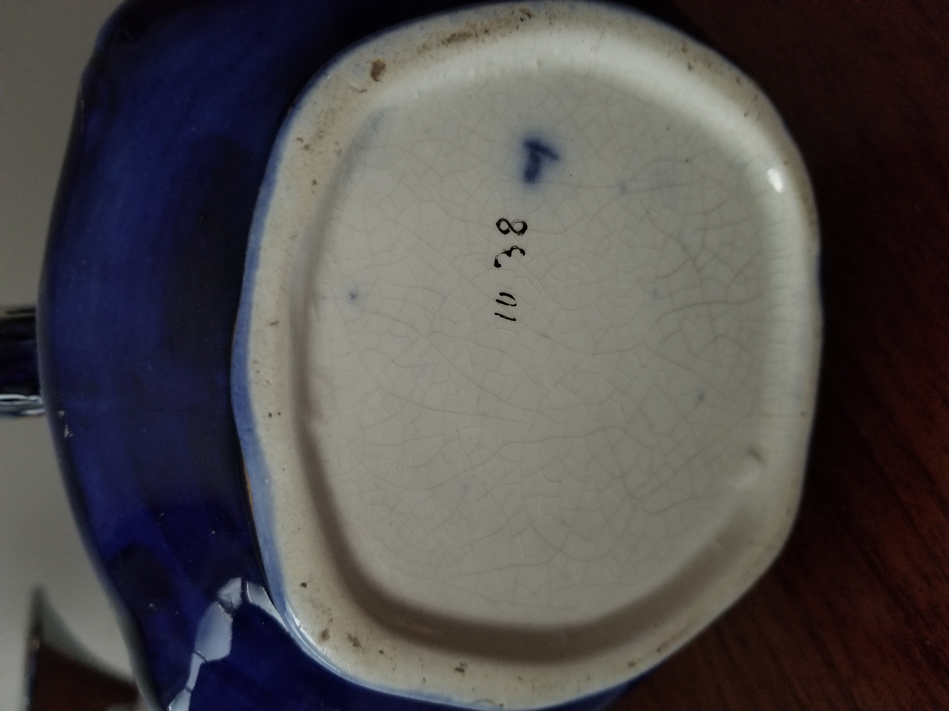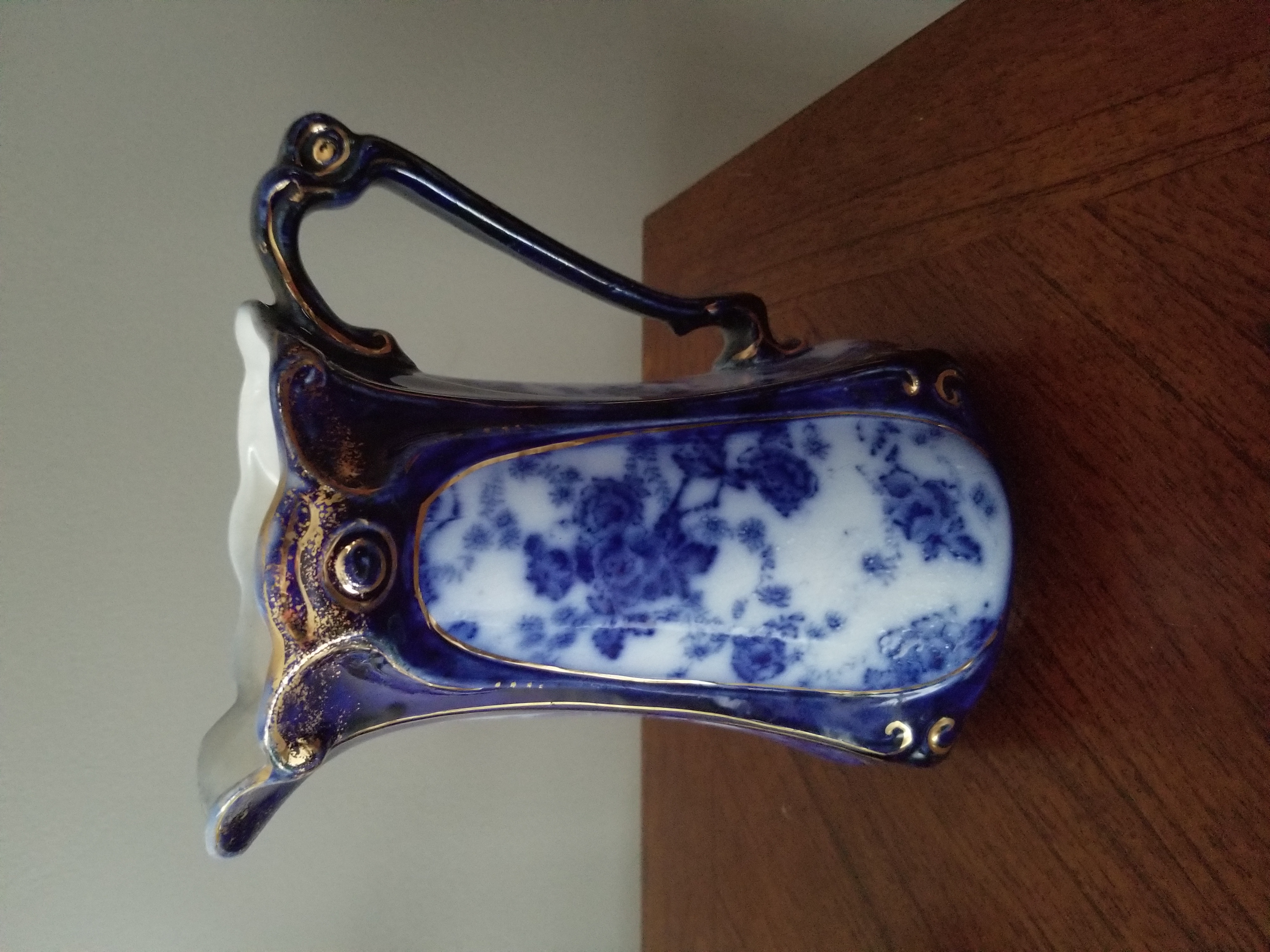 Blue and gold jug about 13 inches tall and 5 and a half inches wide at the base. Has markings on the base I am unable to identify in any literature. I believe it was made in England.