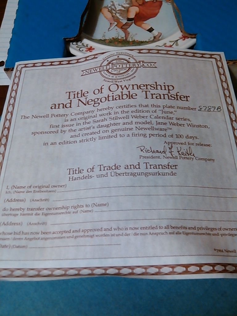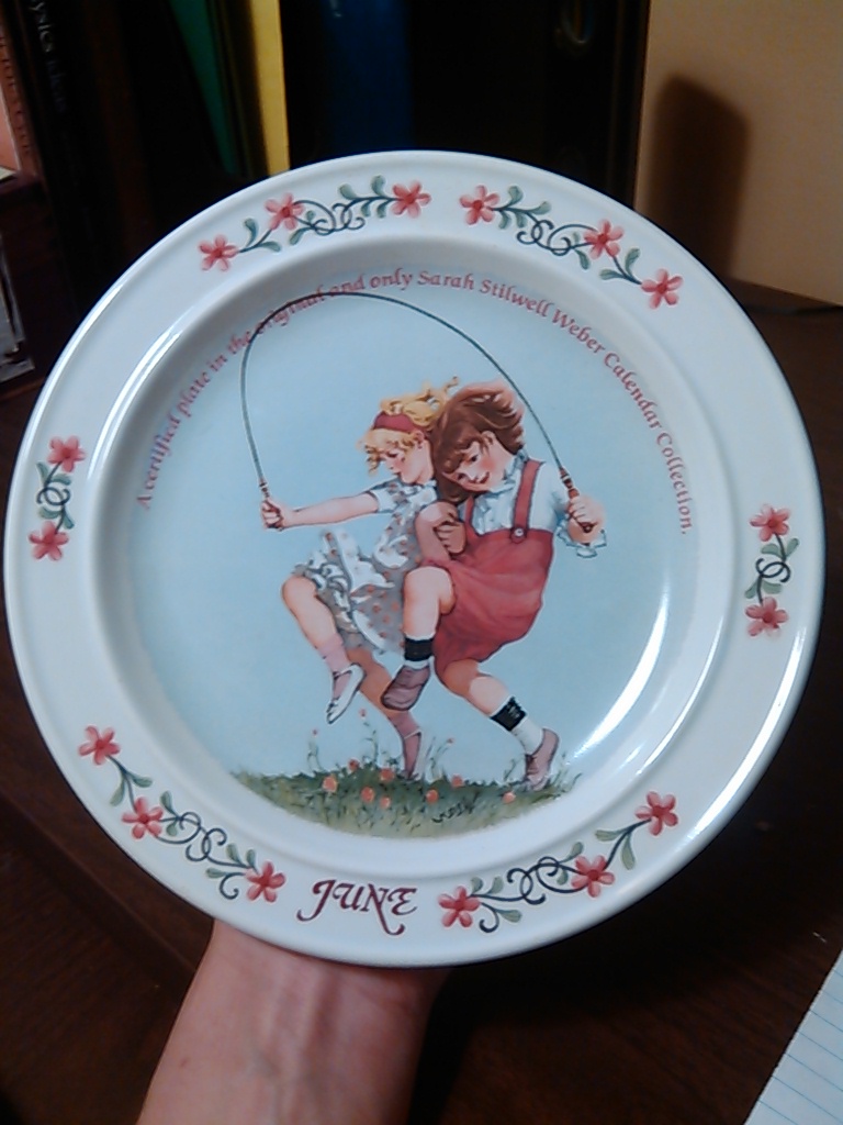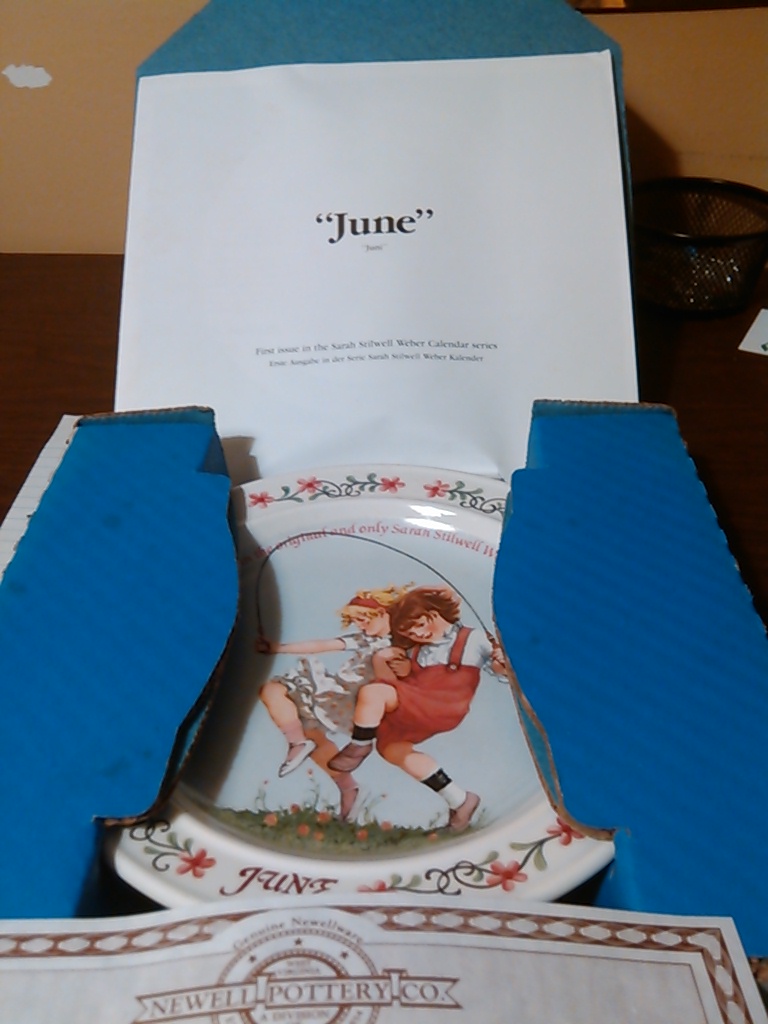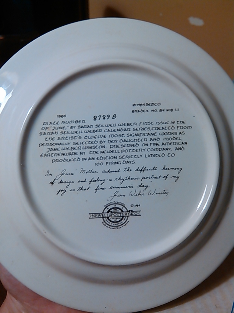 1984 Plate number 8789B of "June" by Sarah Stilwell Weber calendar series, created from the artists twelve most significant works as personally selected by her daughter and model, Jane Weber Winston. Preserved on fine American Earthenware by The Newell Pottery Company, and produced in an edition strictly limited to 100 firing days.