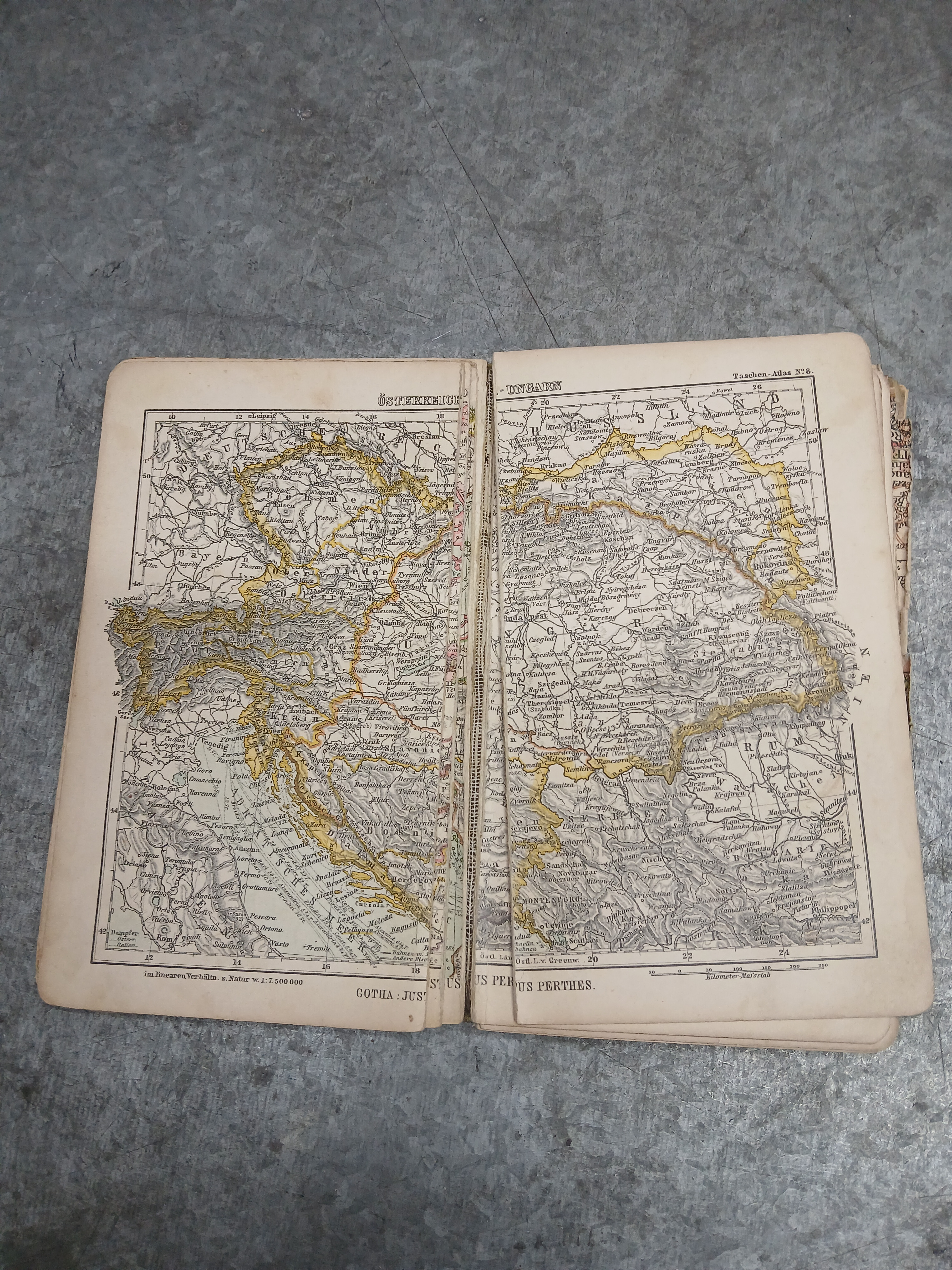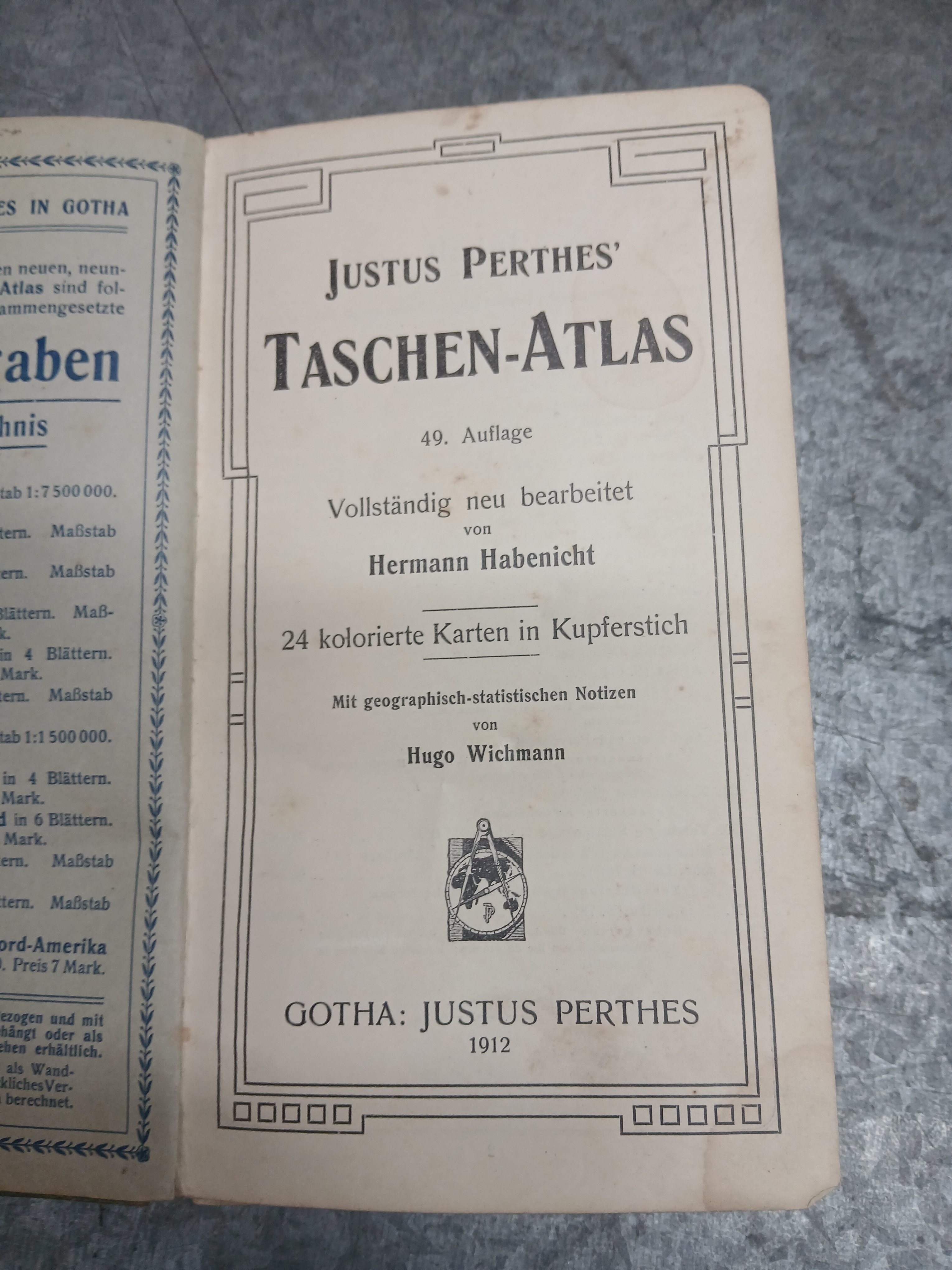 Justus Perthes' Taschen-Atlas. Made by Justus Perthes. Dating to 1912. Materials: Paper, ink. Estimated value: $50 – $100. Condition: Good. The market for historical atlases is currently stable, with moderate demand among collectors and historians.