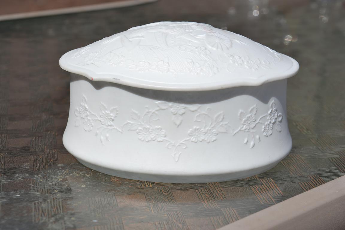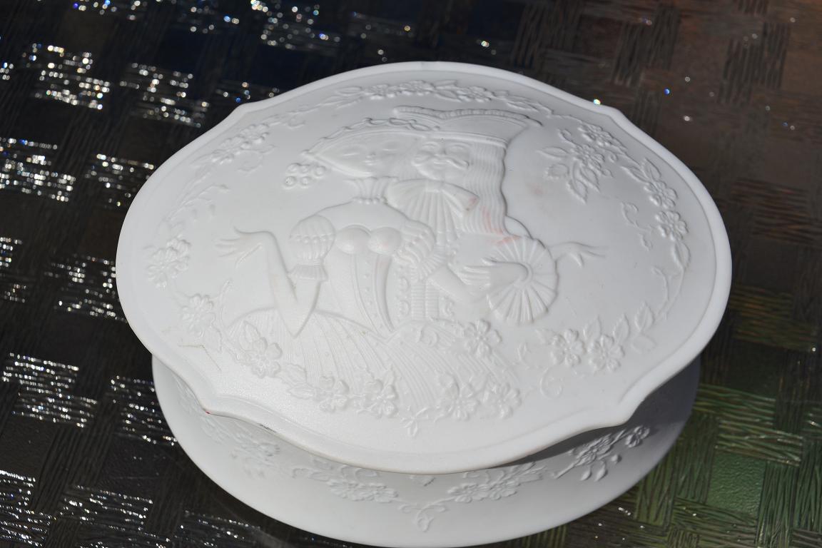 White porcelain dish with top. Has a stencil of  a man and a woman dancing with a flower boarder. On the bottom in blue writing is Kaiser Germany. I would like to know an estimated price to this item if possible. I might be interested in selling it as well.