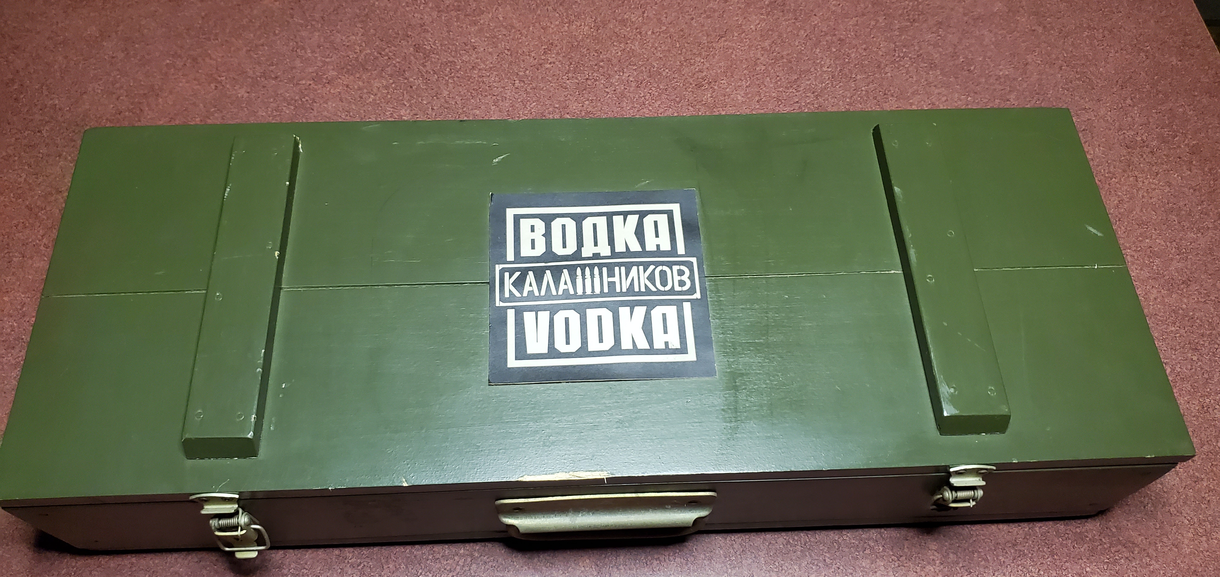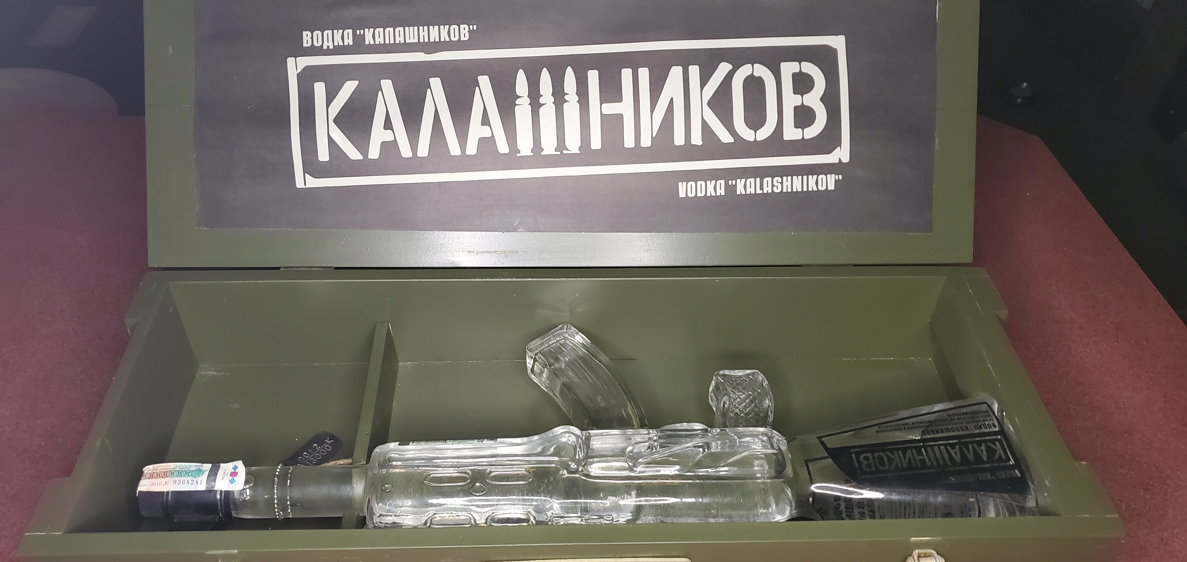 Kalashnikov AK-47 Vodka Bottle. Sealed. Comes in military style wooden crate with pamphlet. Serial Number 12/13,000. Minimal cosmetic damage on crate.