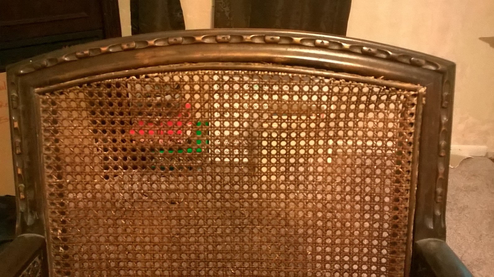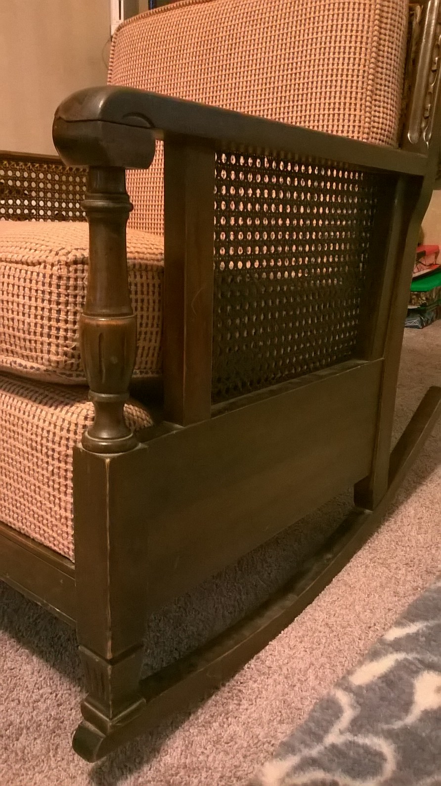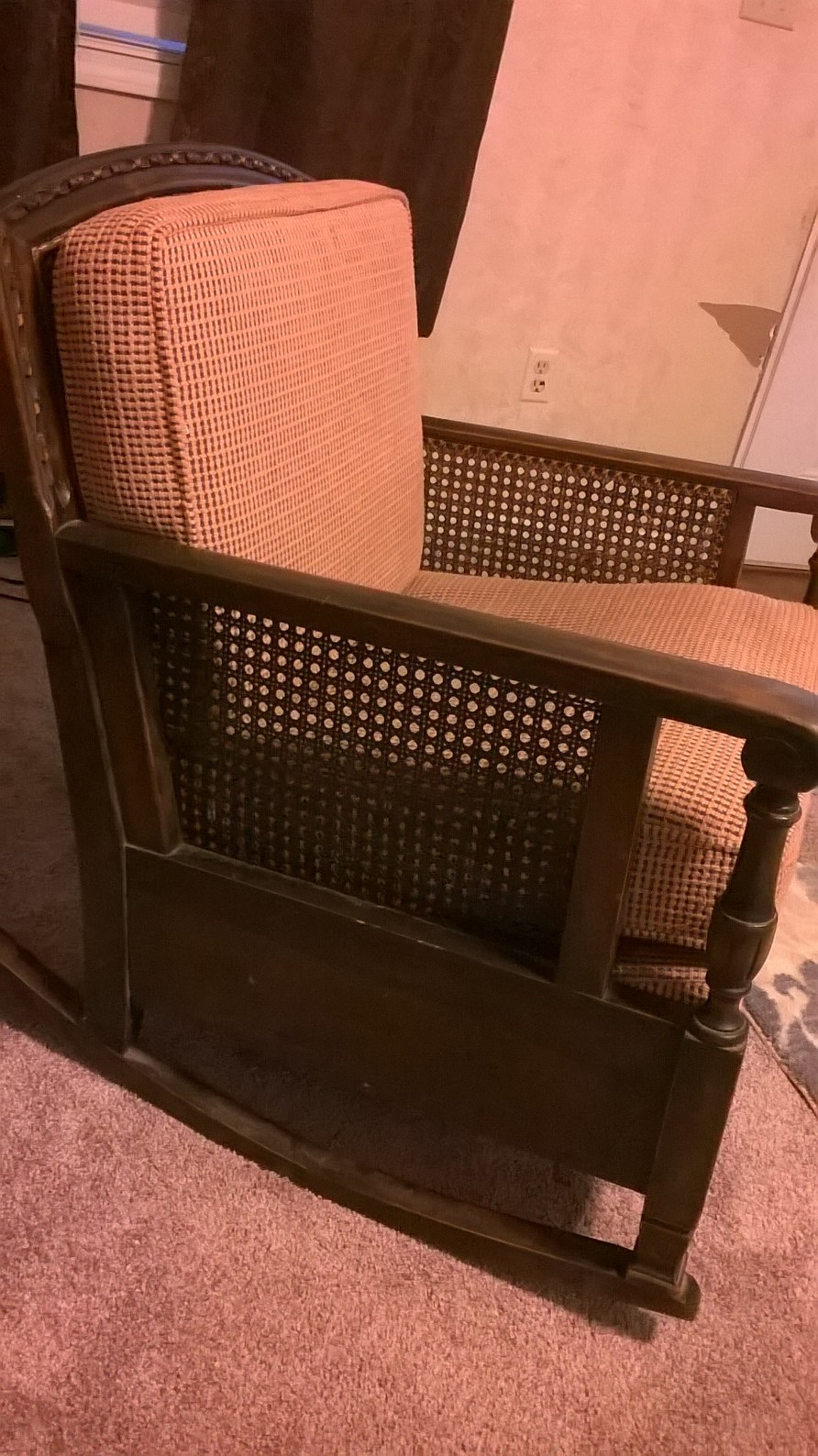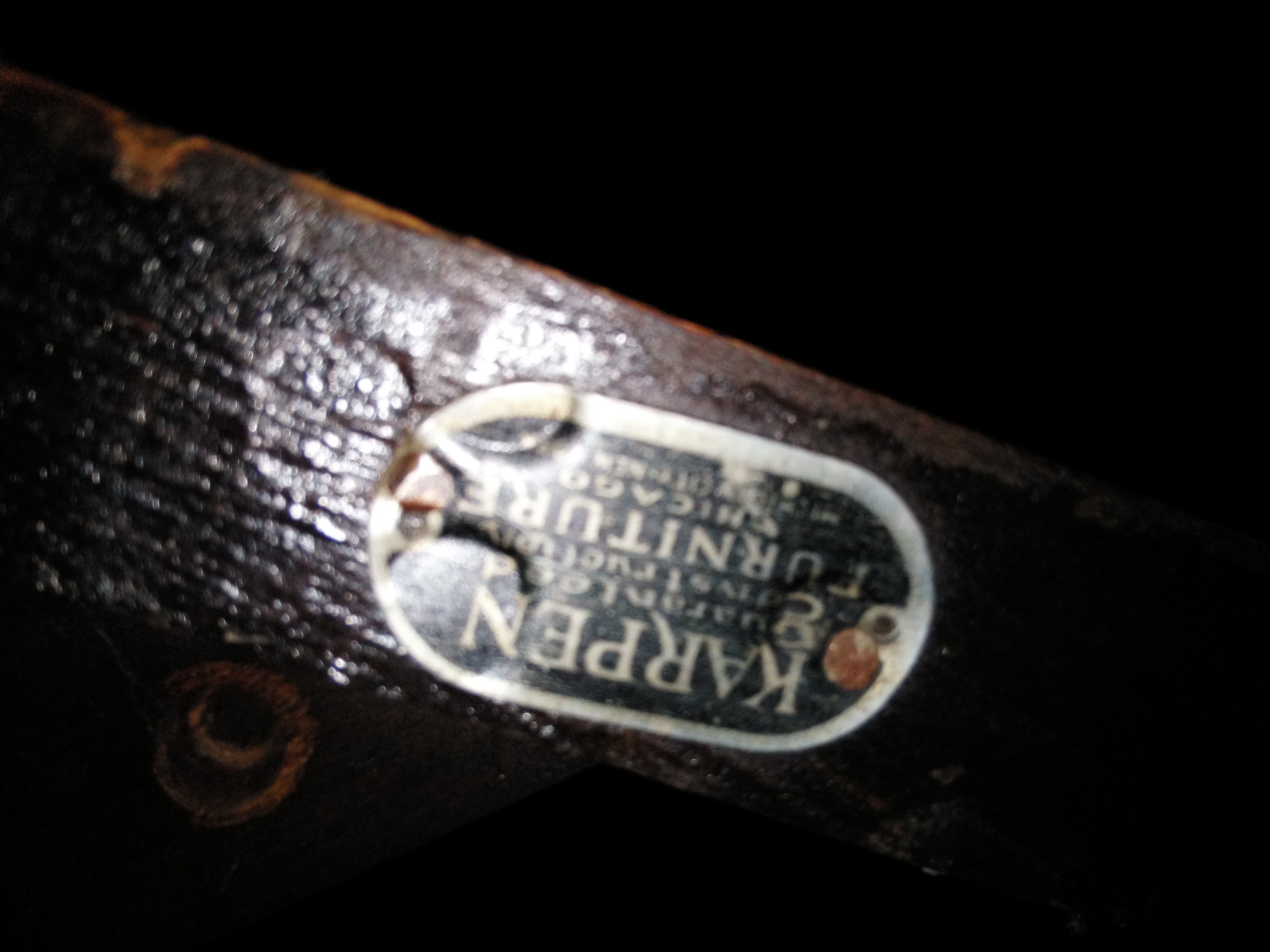 Short back rocking chair. Very heavy. Has a Karpen tag nailed to bottom. Has what appears to be original cushions on seat and back. Cushions are very thick and heavy. Maybe 4-5in thick.