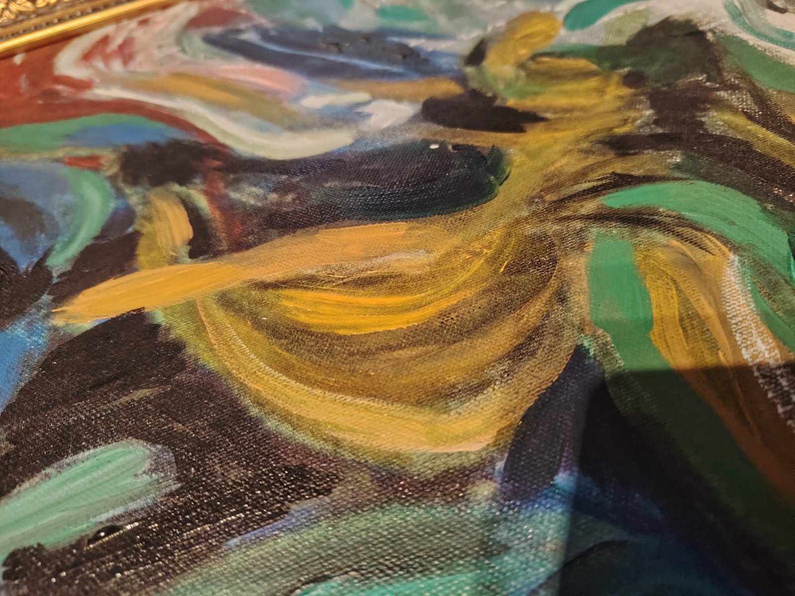 The painting is complete with no missing parts. The frame appears intact, enhancing its presentation.