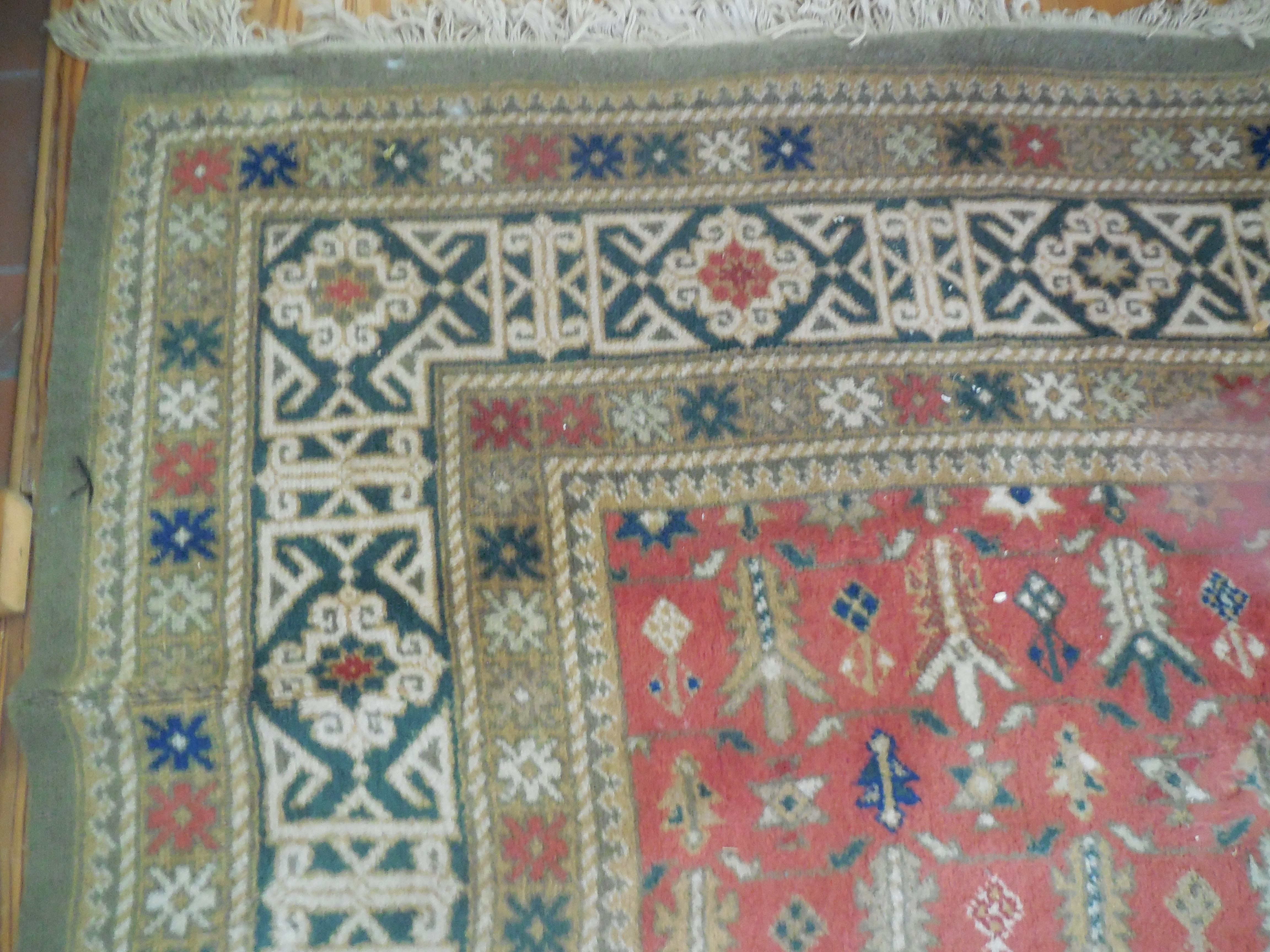 It has a worn spot where a chair was and one on the side. Its 8'3"x12' including fringes. made in Holland. color rose Kabistan 34844.