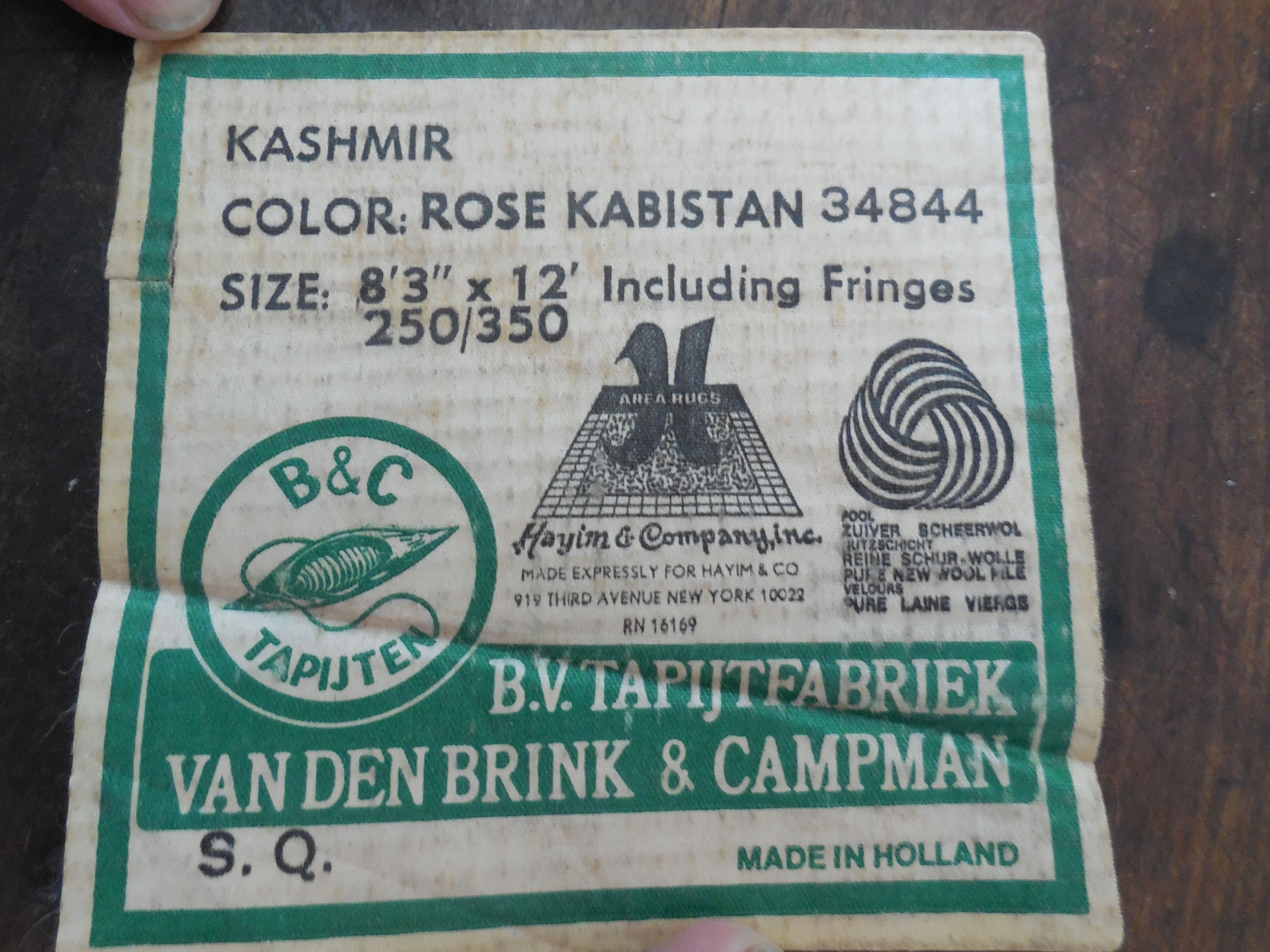 I have this same rug! My original label states it is 8' 3" by 12', Made in Holland, Rose Kabistan 244, Made expressly for Hayim & Co., Inc. 919 Third Avenue NY 10023, RN 16169, 100% Virgin Wool. My grandmother purchased it for $399 from Sloanes in NY in the '60s or '70s. How much are you selling it for? Do you have any additional info on yours?