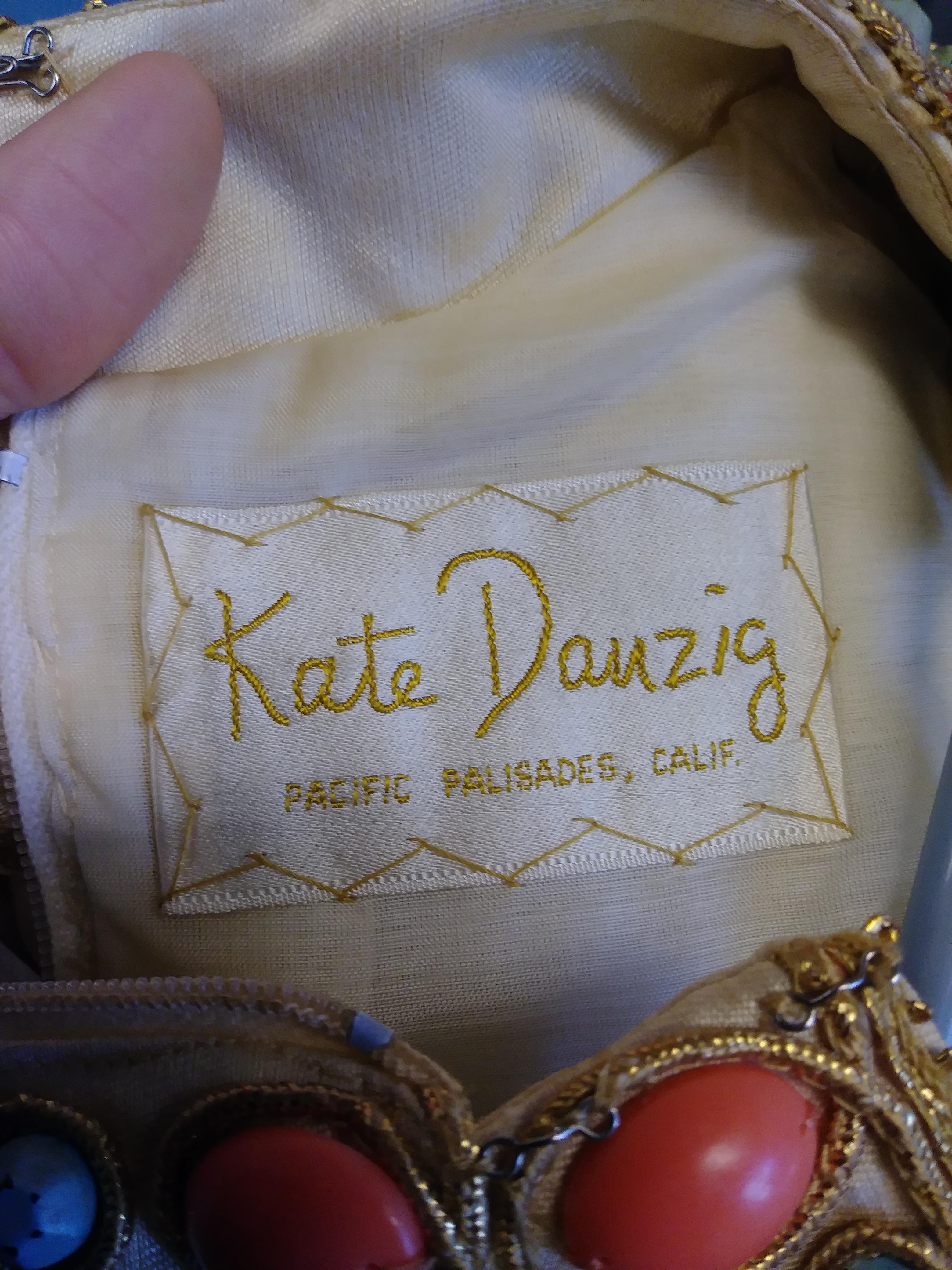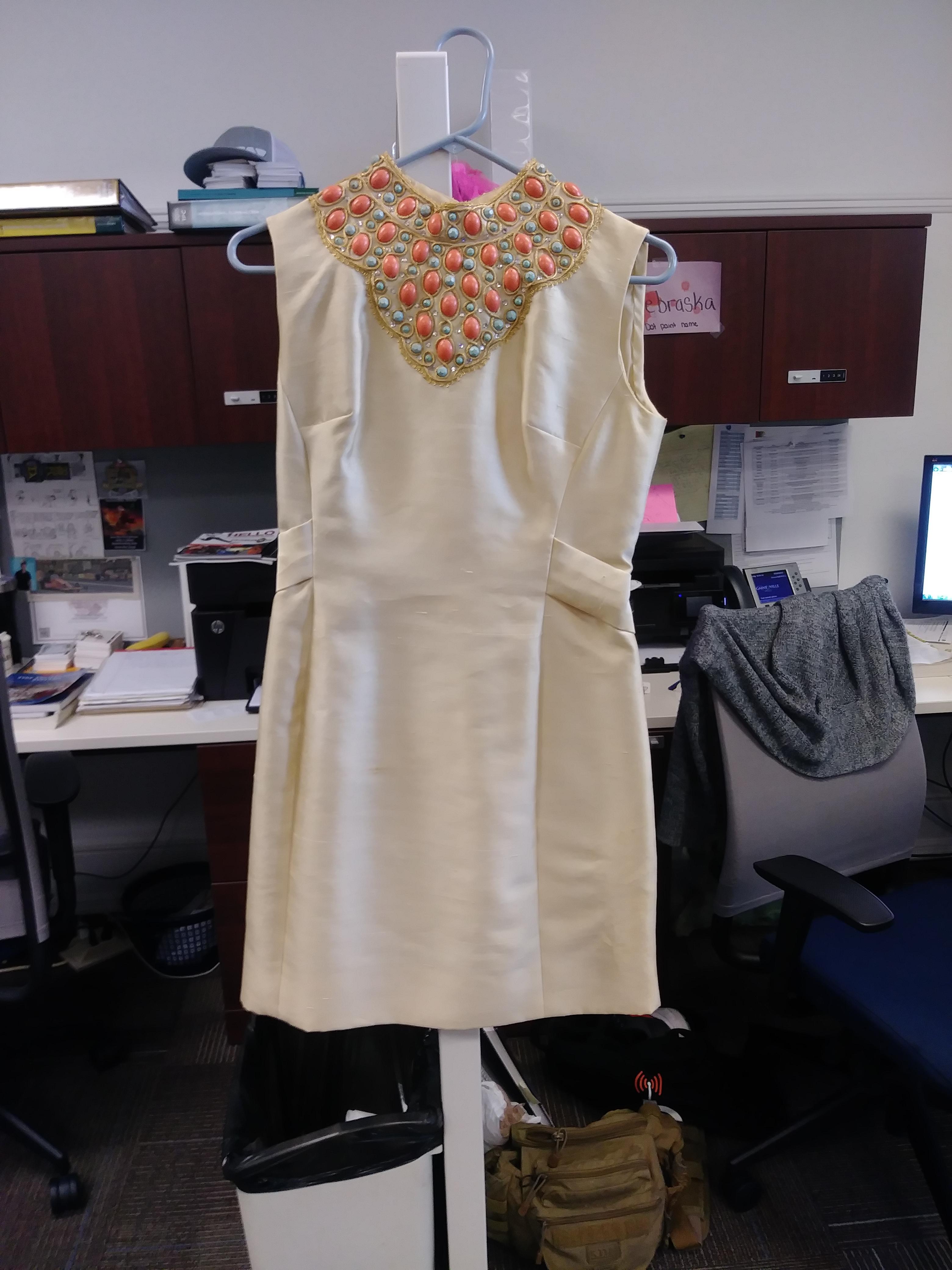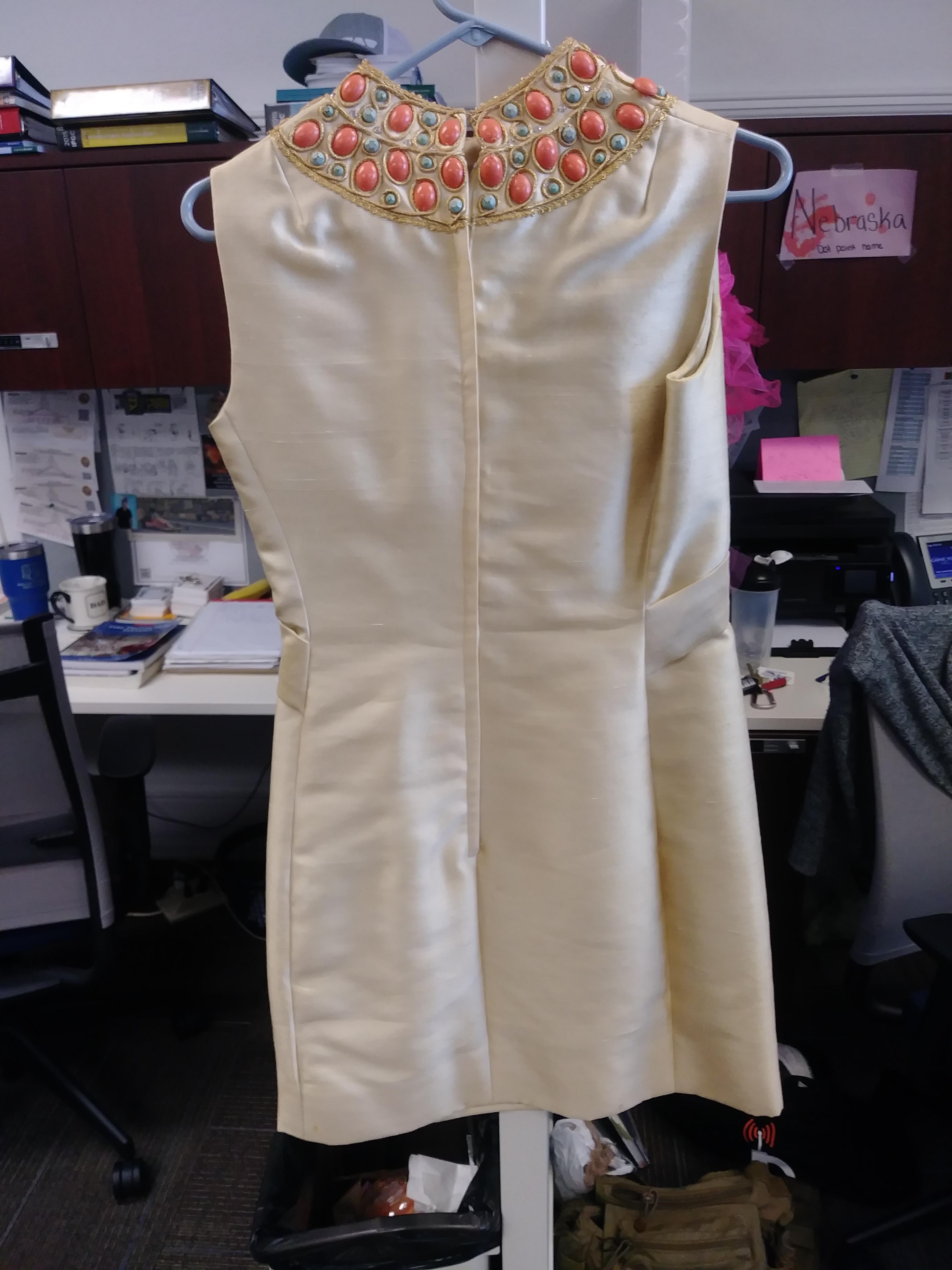 Golden, knee length, rough silk, sleeveless, dress. Neckline adorned with orange and topaz colored beads.