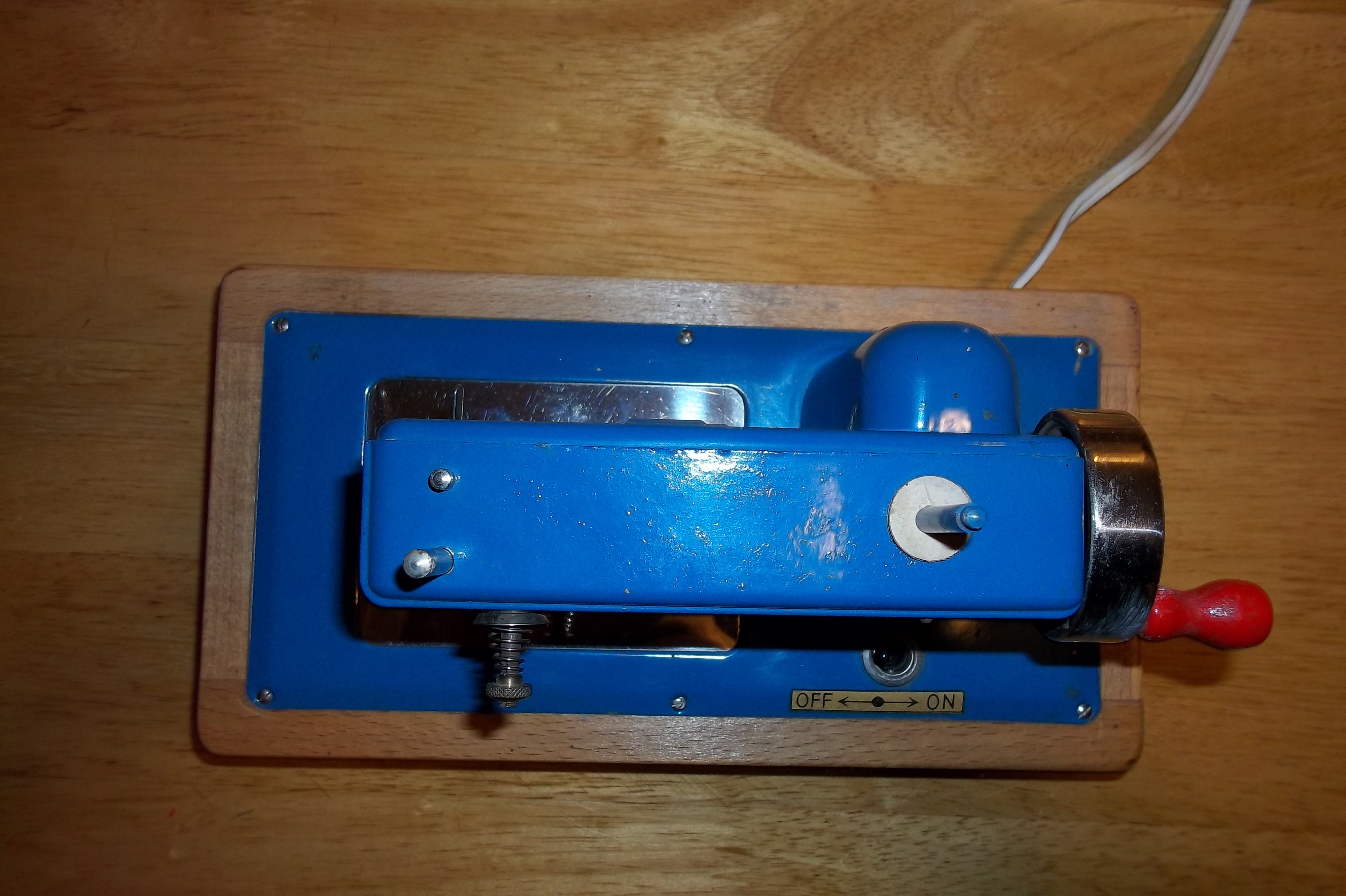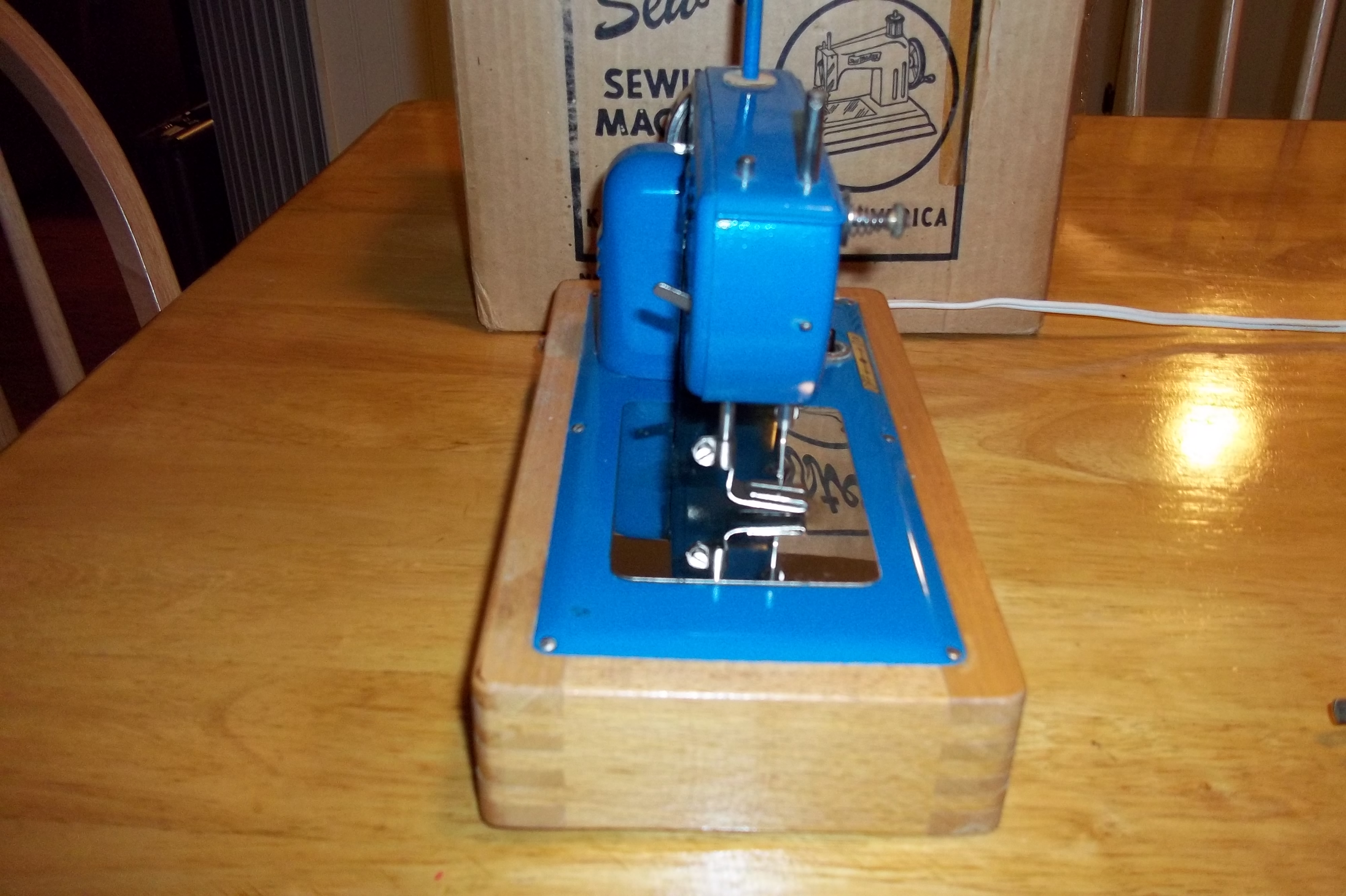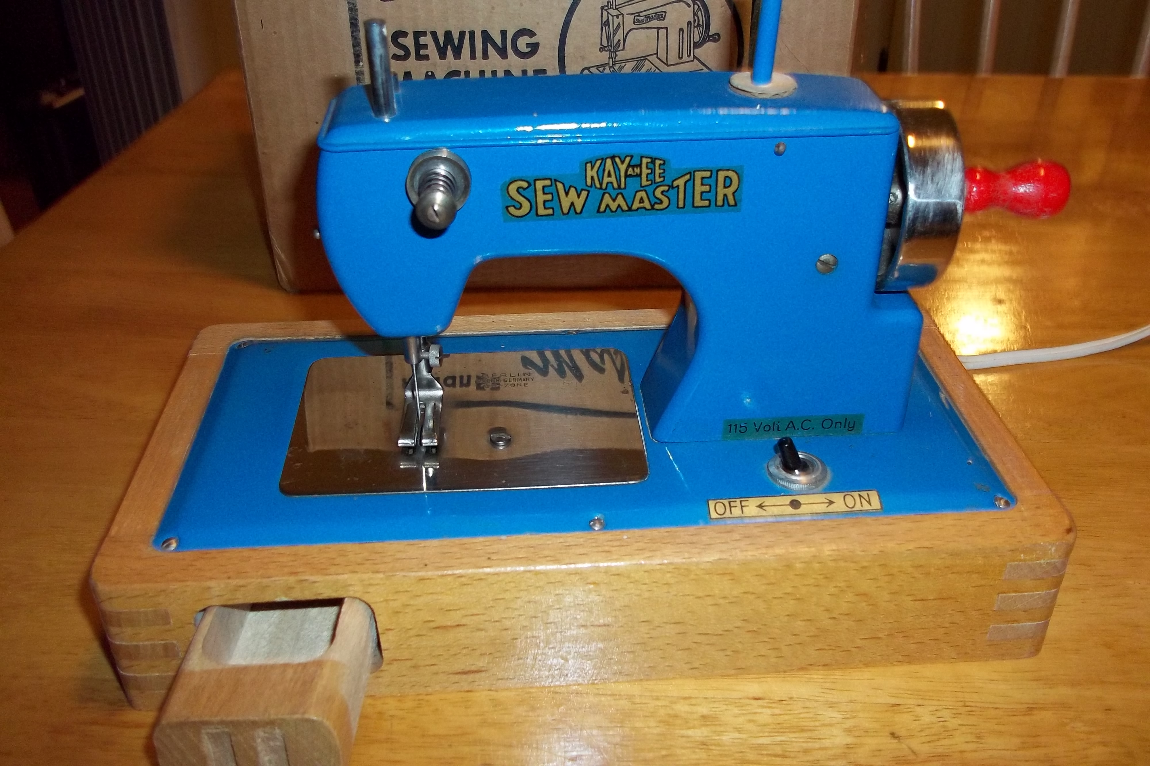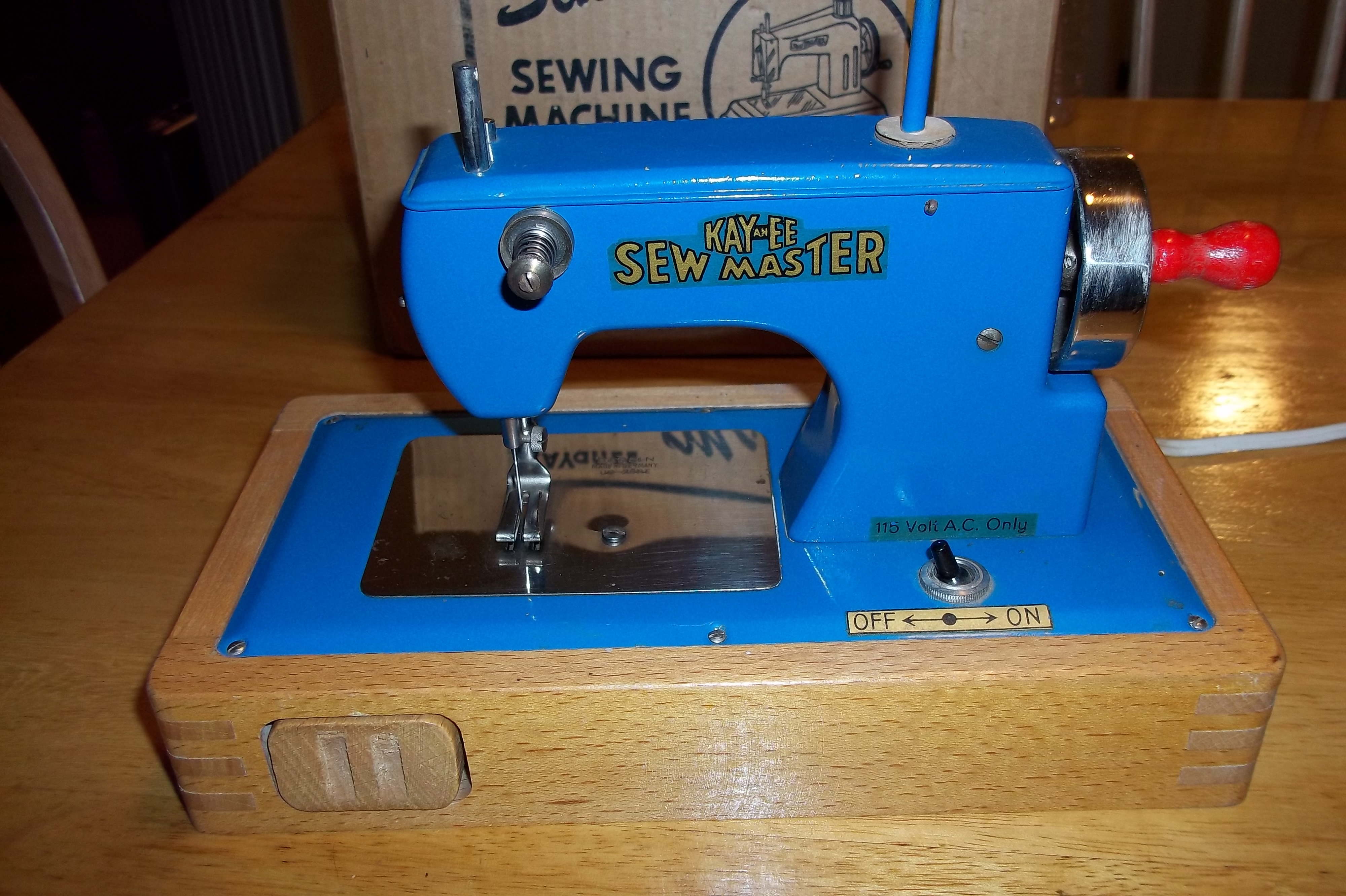 This machine is electric, has a drawer in the base. Has metal plate cover on bottom. Has minor surface scratches. This machine does work and has the needle with it. I have all the paperwork and the box is in fair condition.