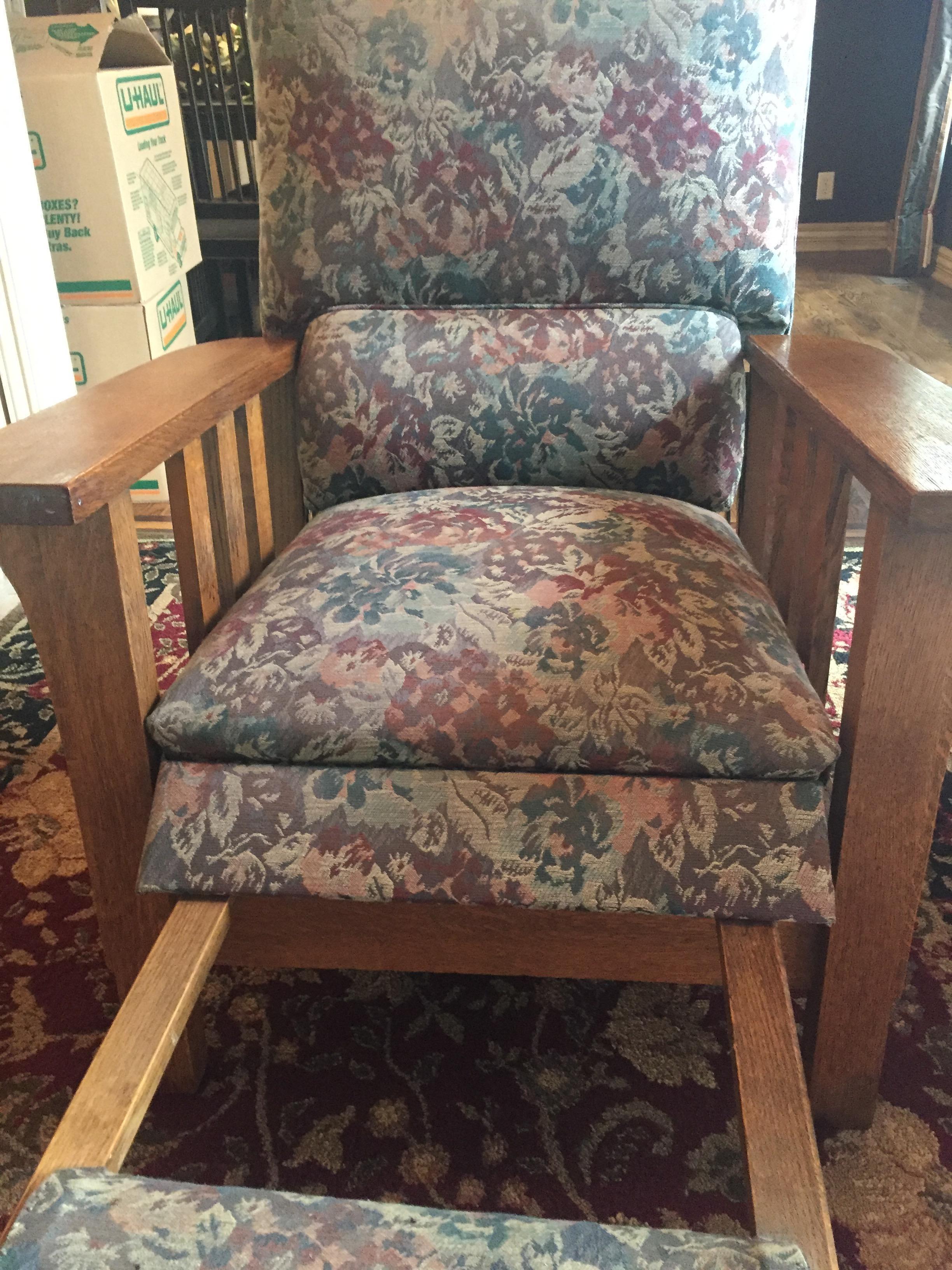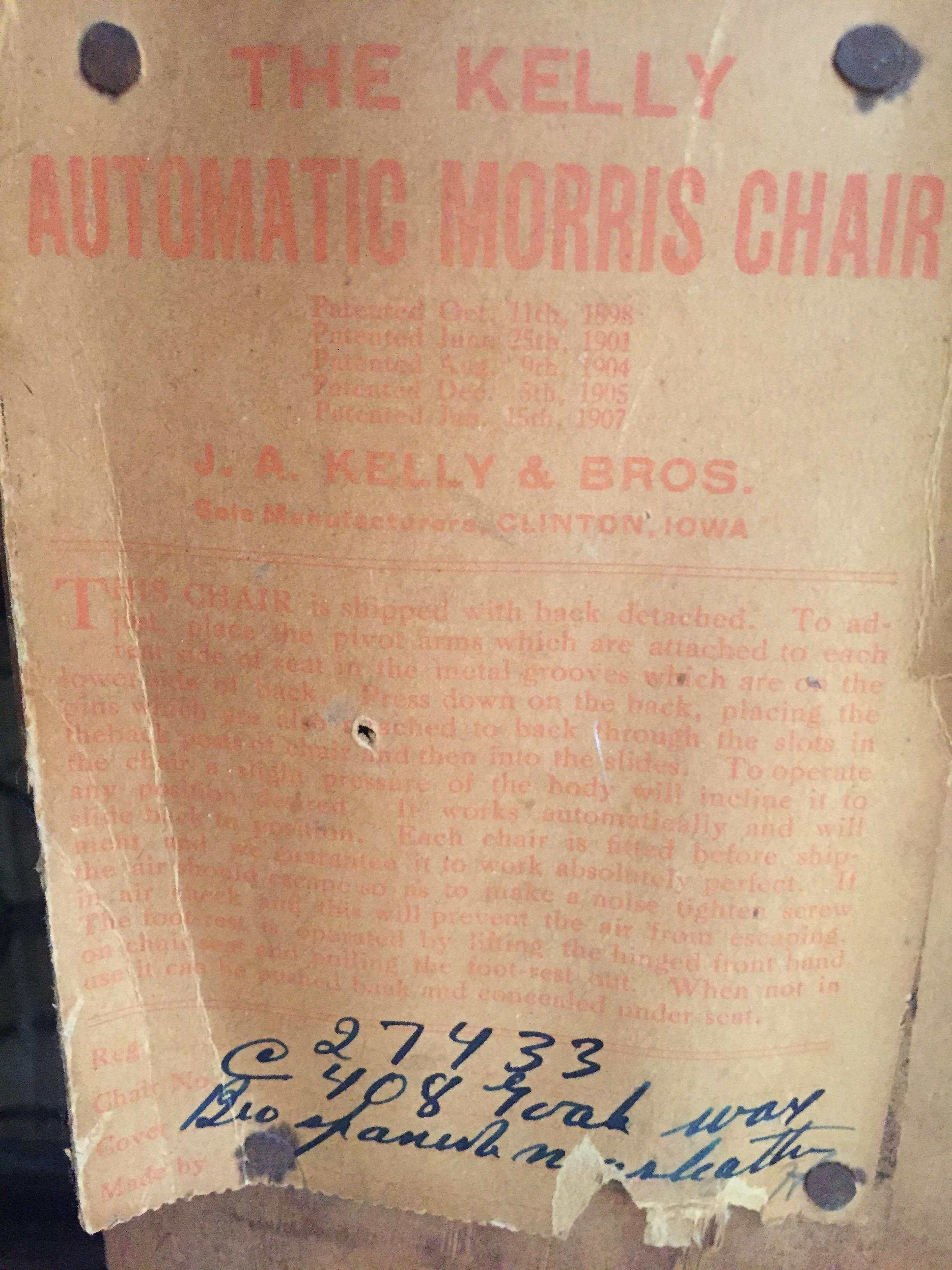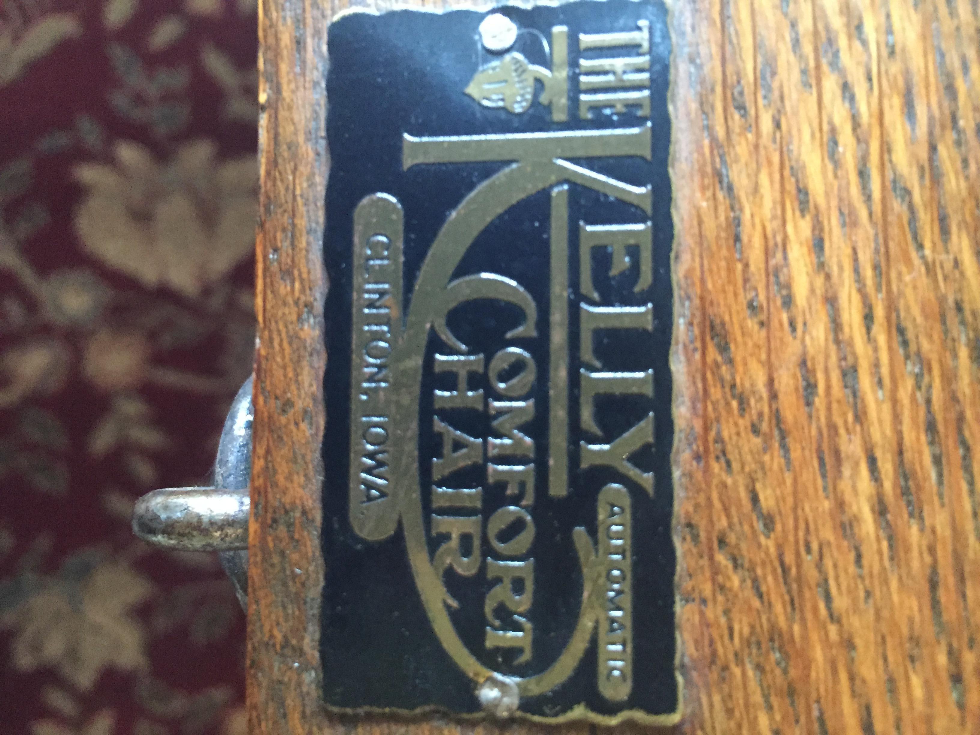 Kelly Comfort Chair manufactured in Clinton, IA in the late 1800's through early 1900's. Chair has been reupholstered, automatic function works, and pull out foot rest is intact and in good shape.