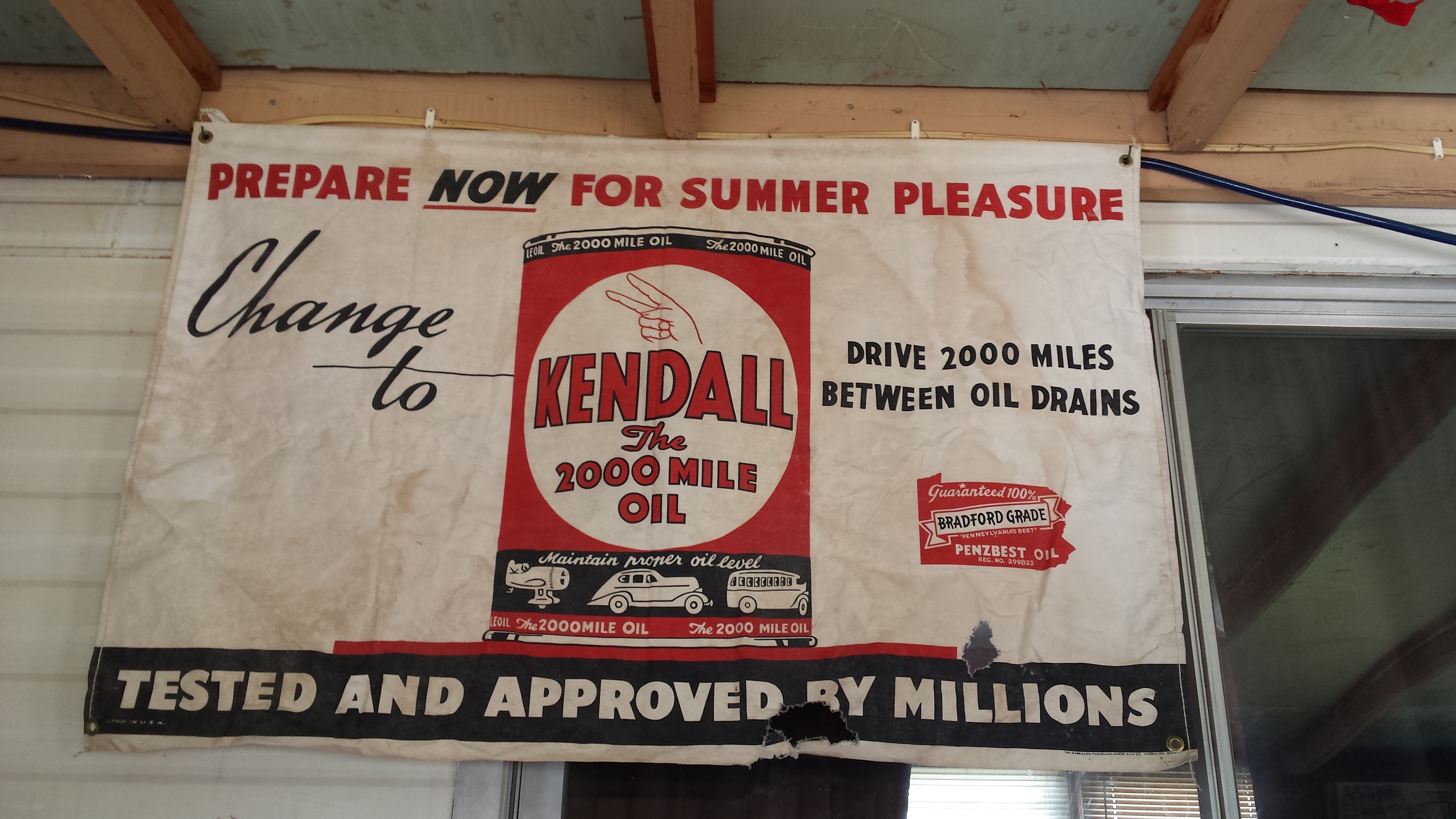 I've been told this is a 1930's Kendall Motor Oil banner. It is in great shape except for the two holes and the dirt. The colors are still vibrant.