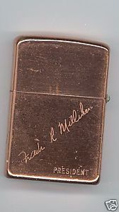 WORKING IN GOOOD CONDITION,KENNECOTT ZIPPO COPPER LIGHTER/PRESIDENT STAMPED IN LOWER RIGHT CORNER IN FRONT CASE WITH FRANK R. MILLIKAN SIGNATURE ENGRAVED ACROSS FRONT CASE.
