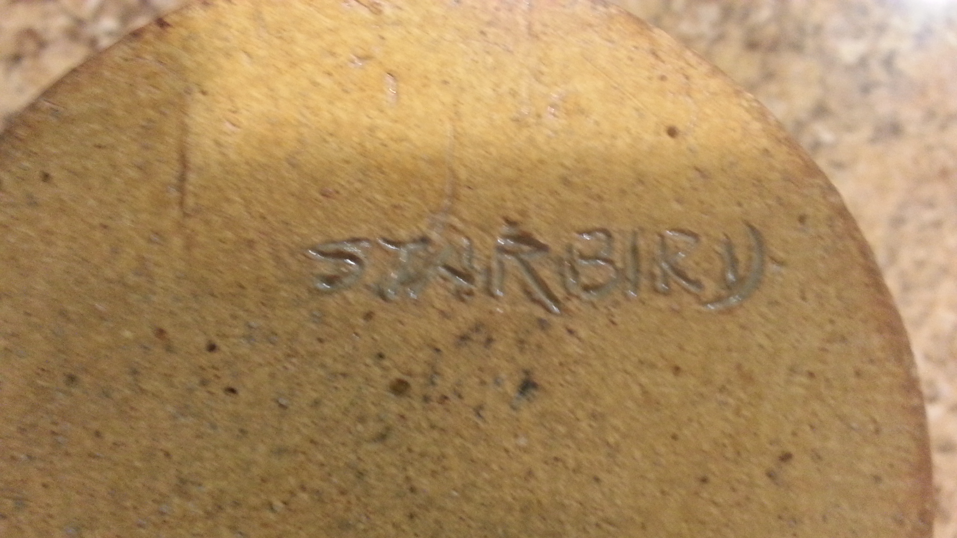 This is pottery by Kenneth Starbird who worked in California. He passed away on July 6th 2014. Through email, I contacted his wife who met him in 2002. She verified that it looked like his signature and work from the 1060's. She also sent me pictures of work that was very similar to it from the 60's. He had a long career in art and has works in the Pasadena art mueseum. I am looking to sell this, but have no experience in doing so.