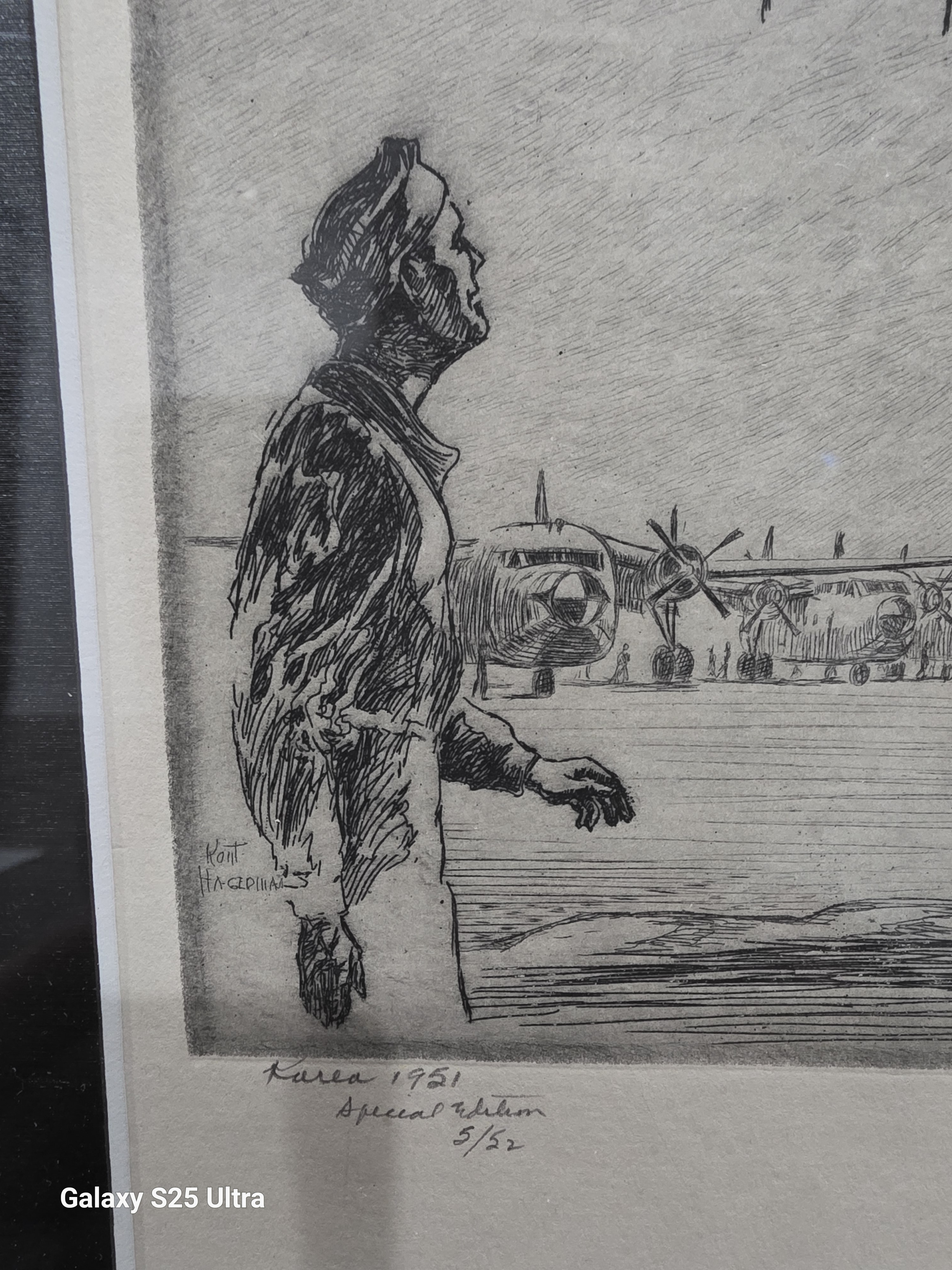 Historical Context: Kent Hagerman was an American artist known for his depictions of aviation and military themes, particularly during the mid-20th century. This etching reflects the historical context of the Korean War (1950-1953), capturing the essence of military aviation during that time.