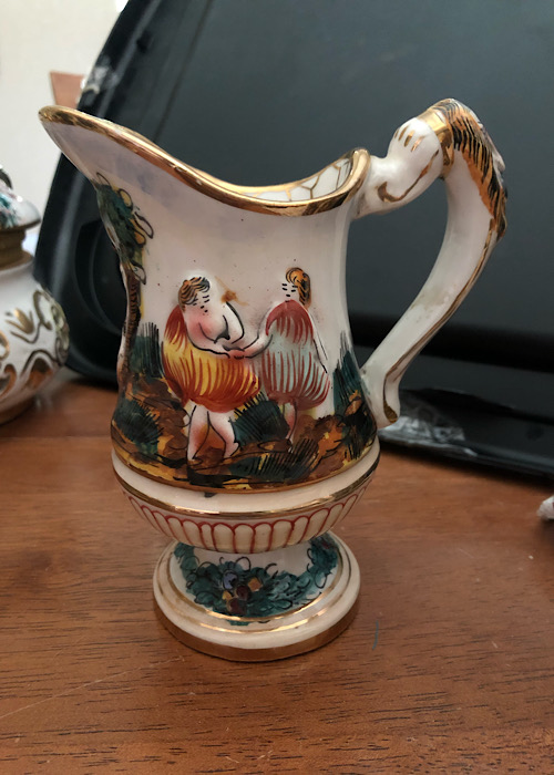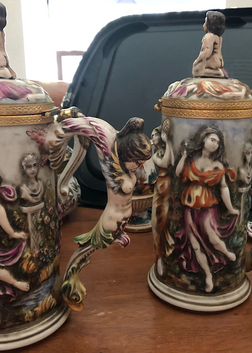I inherited this tea set. The markings are in gold and is as follows: Keramos, underneath that is an N with a crown, underneath that is R. Capodimonte Italy, and the pieces are numbered. There are 13 pieces - Angelic in nature. 2 pitchers: on the handle is a naked angel with a dragon head underneath her, a cherub sitting on top, pictures of women dancing, one picture has a woman nearing with a naked man (covered with some leaves). 4 tea cups with 4 saucers (child angels), 1 sugar container, 1 cream container, and I believe a candy container.