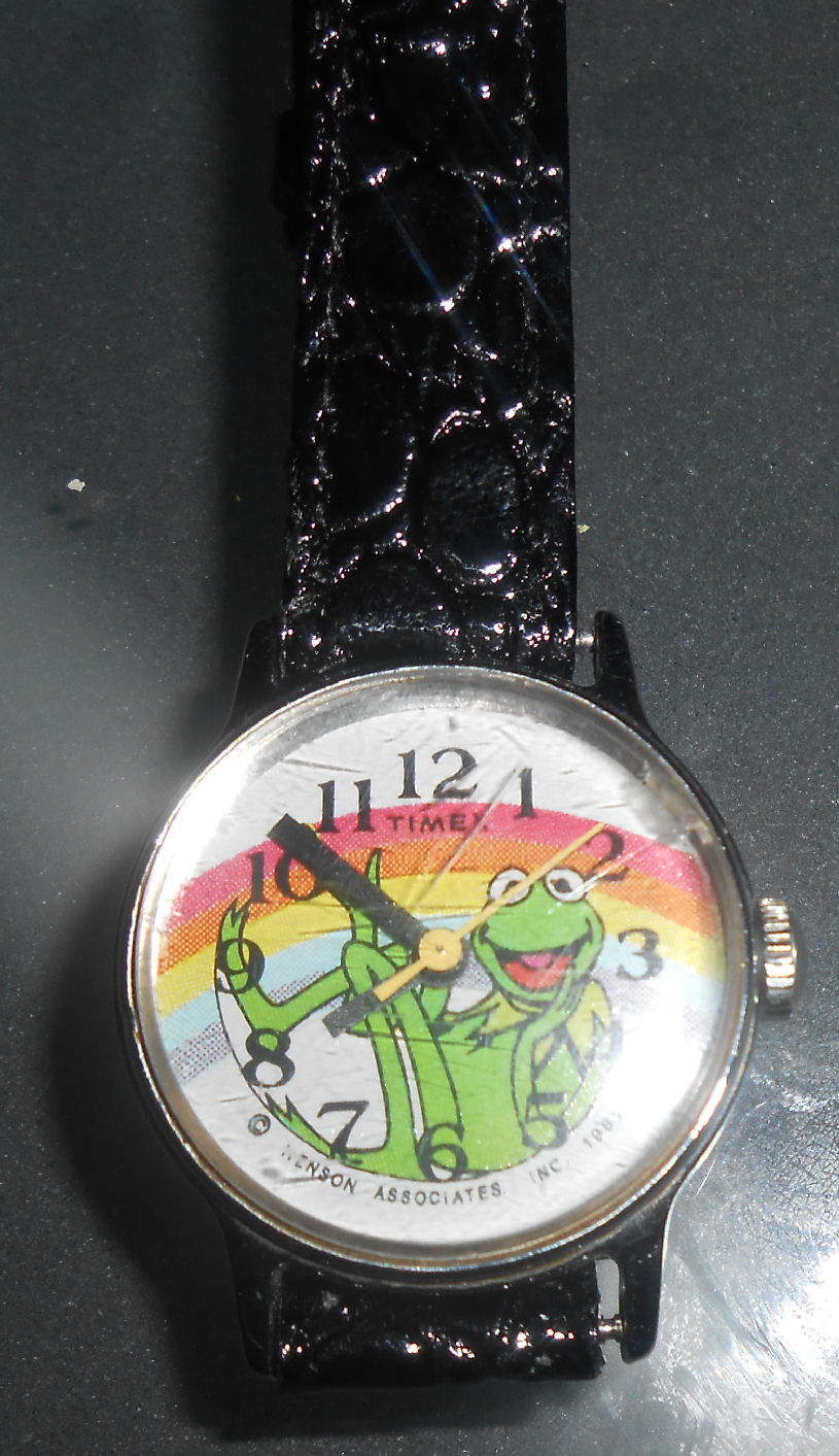 The watch has Kermit the Frog on it & it says: Timex.    Henson Associates Inc. 198?