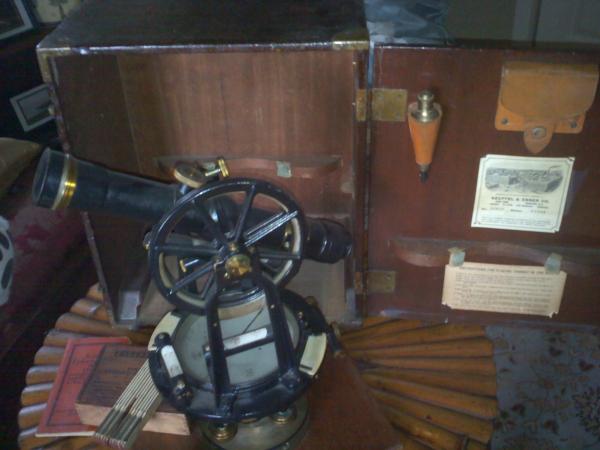 Keuffel & Esser Transit Model # 5060F, Serial # 63448. Includes wooden carry case with K & E labels. Transit is on a wooden platform and includes some optics.