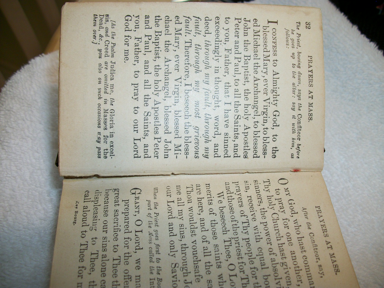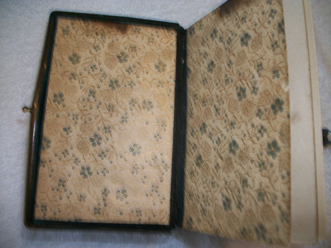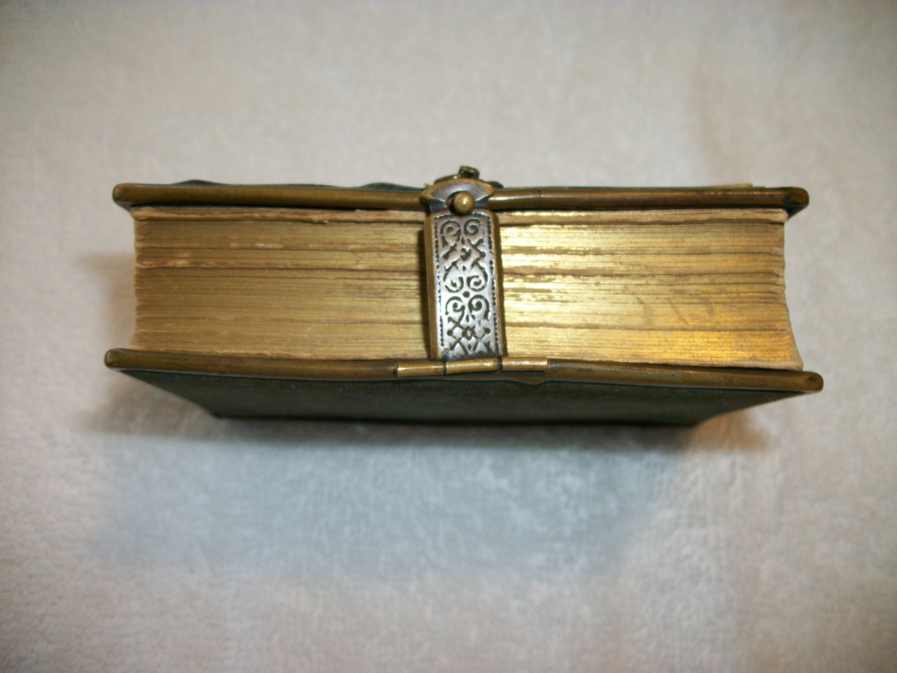 They Key of Heaven A manual of Prayer By: The Right Rev. J. Milner Published 5/8/1900 First Edition By John Bapt. Steinbrener Austria. Leather/suede bound with metal closing strap. Inlay in the front that appears to be bakilite (damage on the inlay) 2 figures keeling with cross. Some damage in binding (cracking). Slight stain on 4-5 pages. 4 pages loose from bindingOtherwise in beautiful usable condition. 2 3/4 " x 3 1/4"