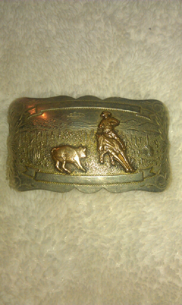 Vintage Keyston Bros. Solid German Silver belt buckle stamped with brass or gold cowboy roping cattle.