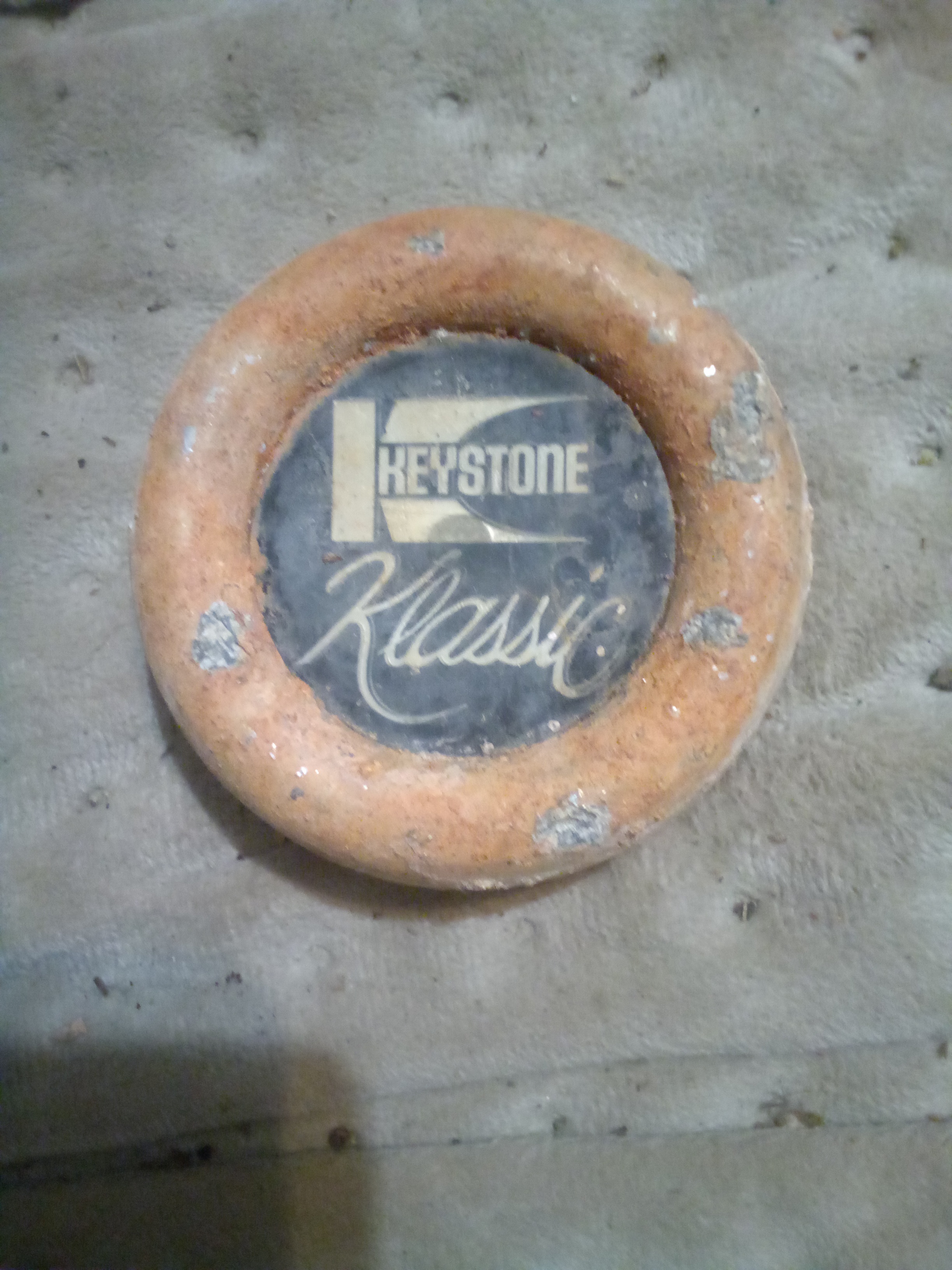 Physical Description: This is a rim cap from the Keystone Klassic series, made of aluminum. The cap is round, measuring approximately 2 inches in diameter. It features a black background with the "Keystone" logo prominently displayed, along with the word "Klassic" in a stylized script. The surface shows signs of wear, including scratches and discoloration, particularly around the edges.