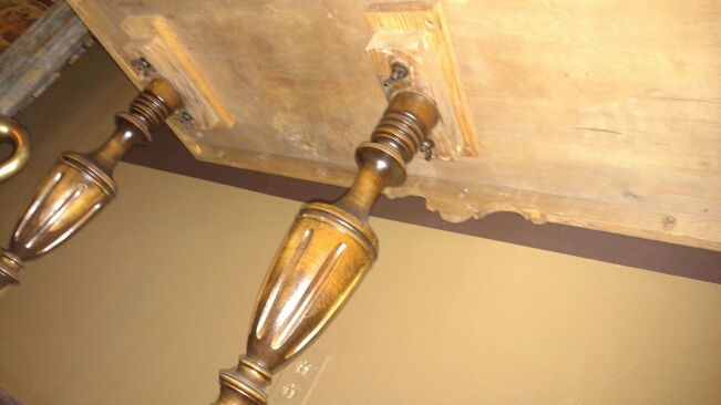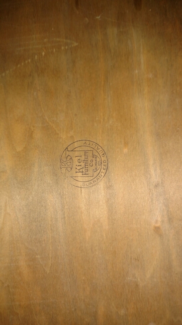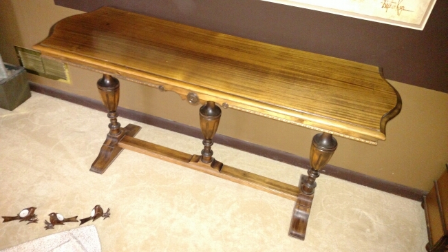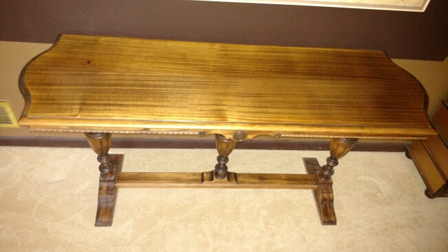 Kiel three pedestal davenport table. Family heirloom. Purchased in Minneapolis before 1930. Exact age is unknown. Very good condition.
