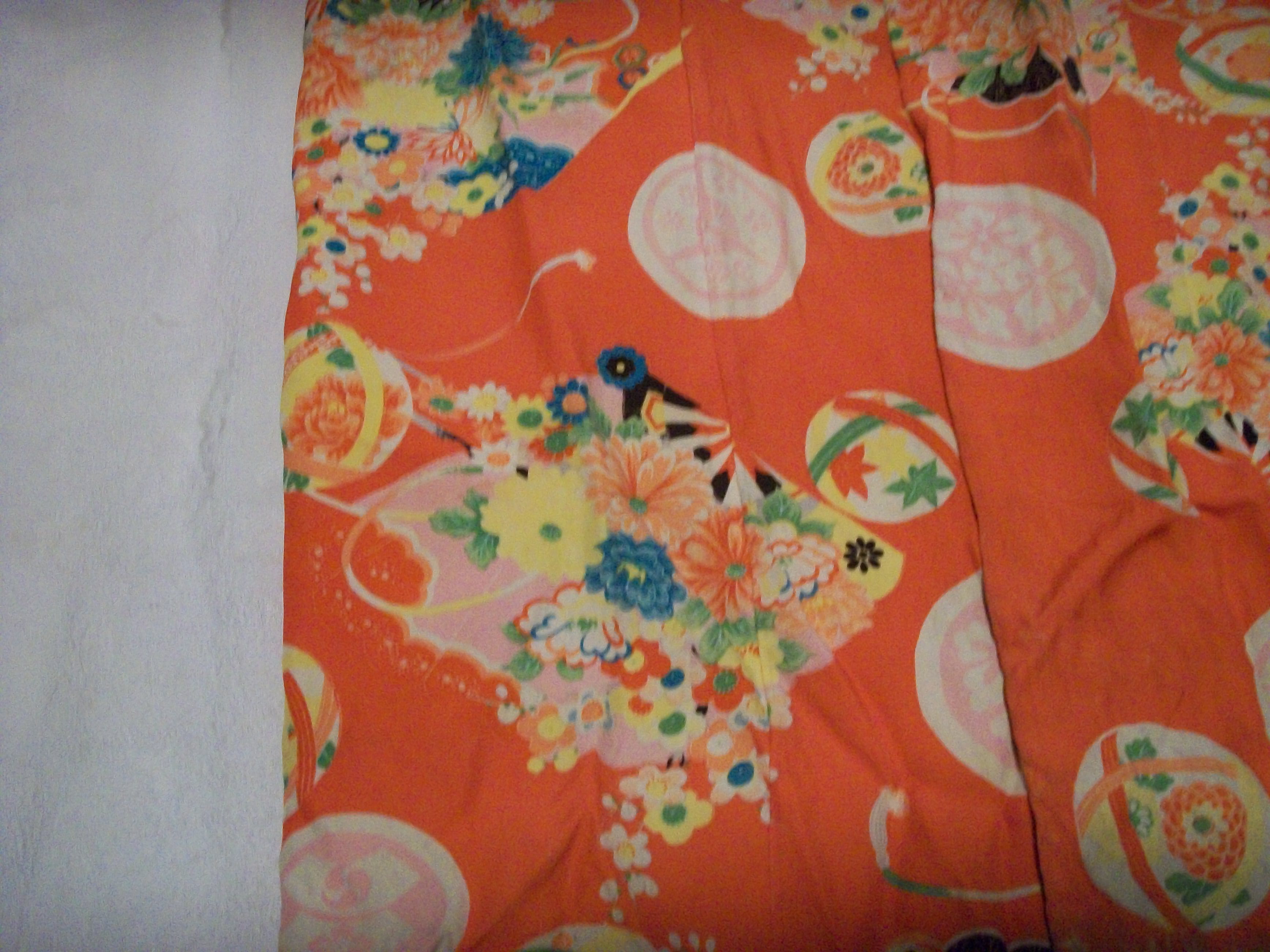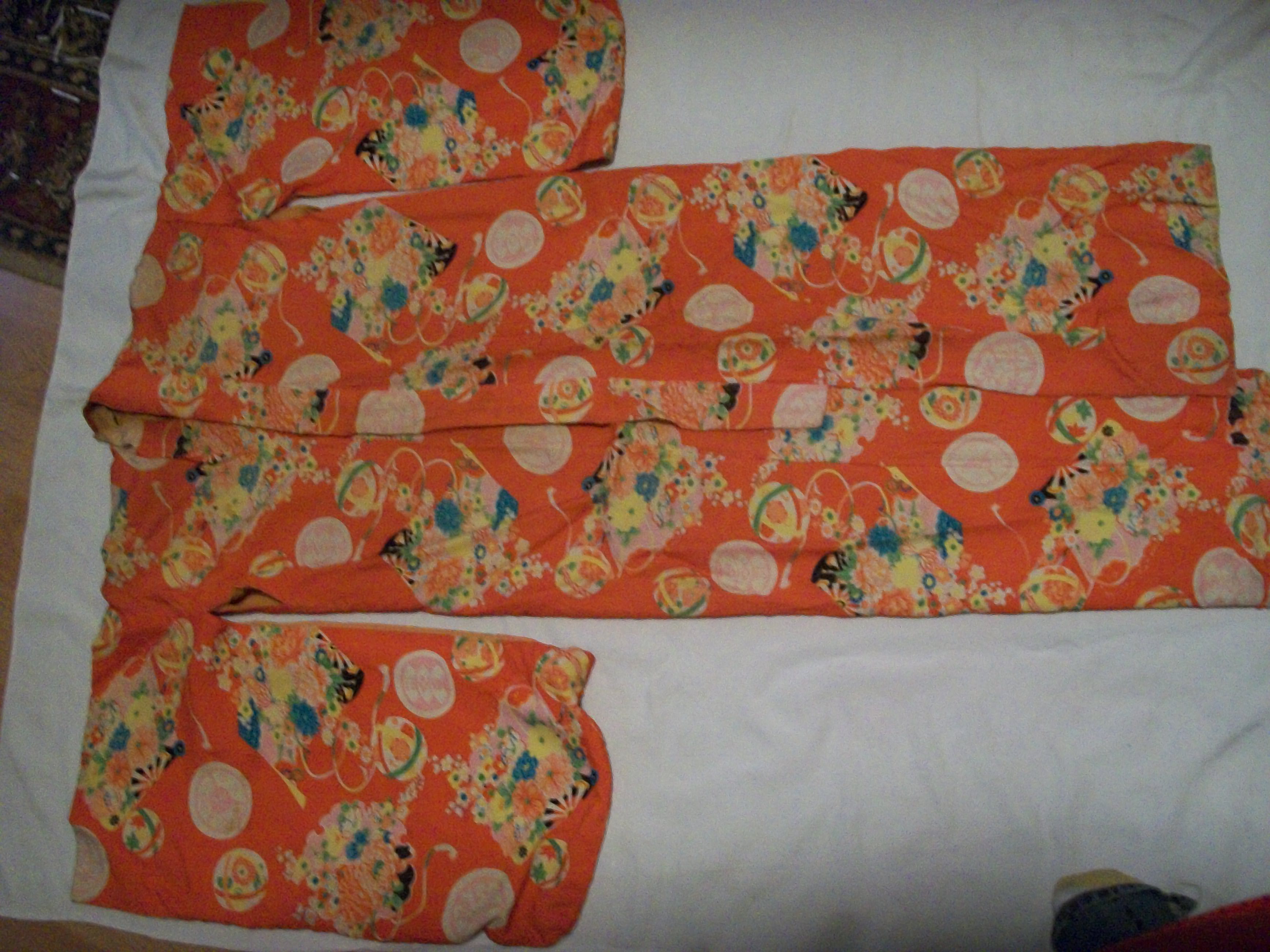 There are several stains and fraying spots due to years of 'dress up' games. It's faded, but at one point was orange.