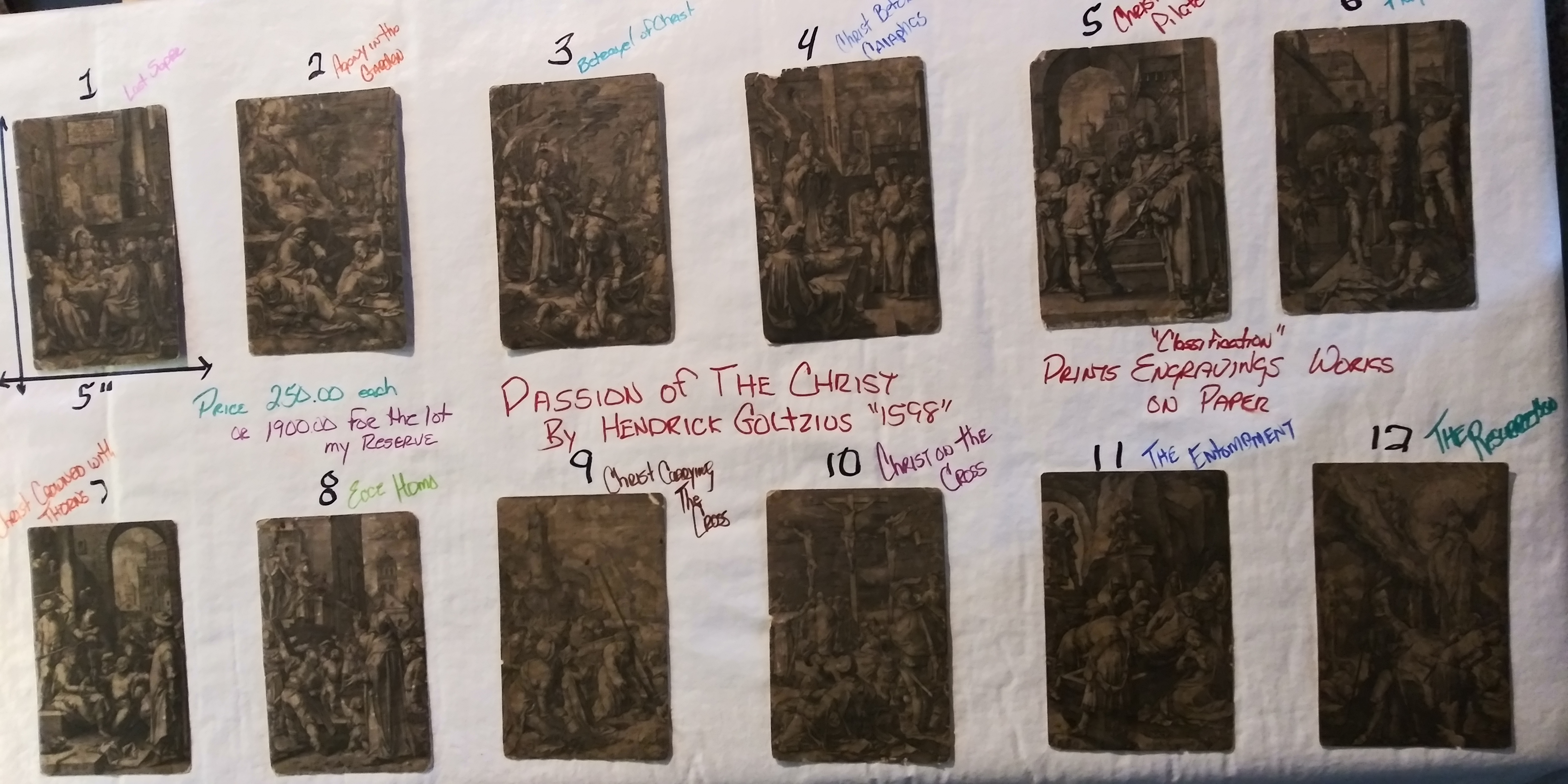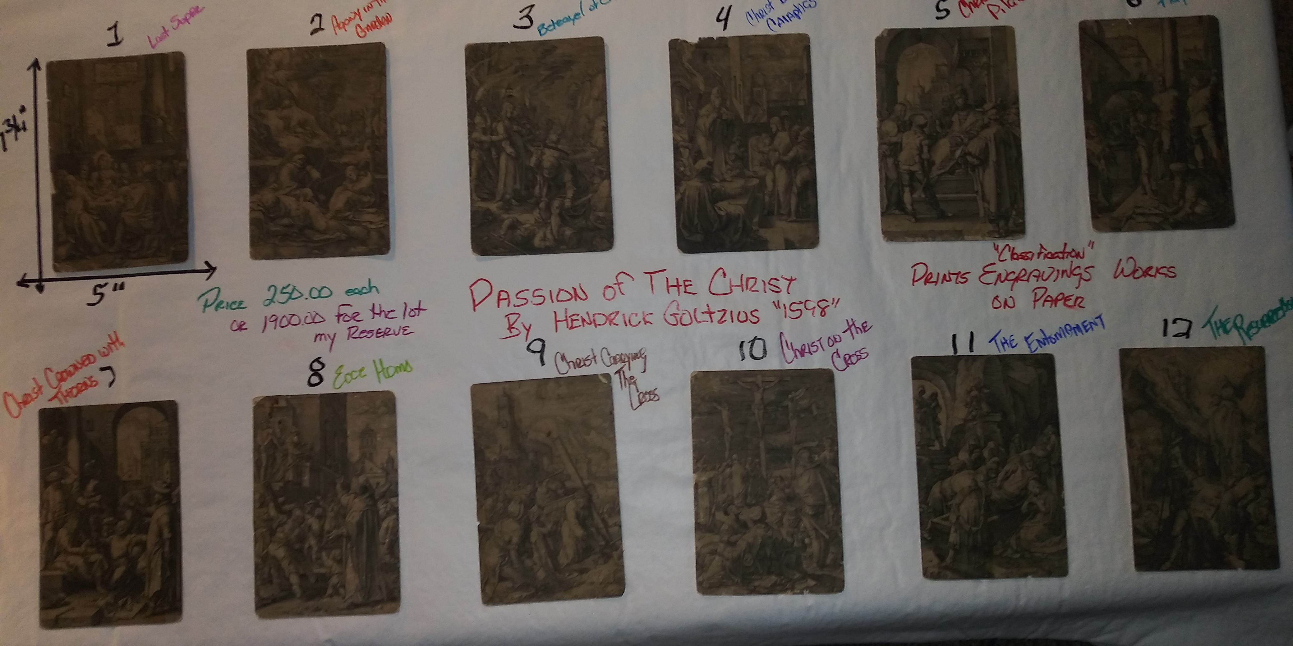 12 Etchings by Kindrick Goltzius 1598 passion of the Christ all are in stunning condition as per there age they have been well preserved on a backer board and to prevent wrinkles and wrapped in moisture proof paper