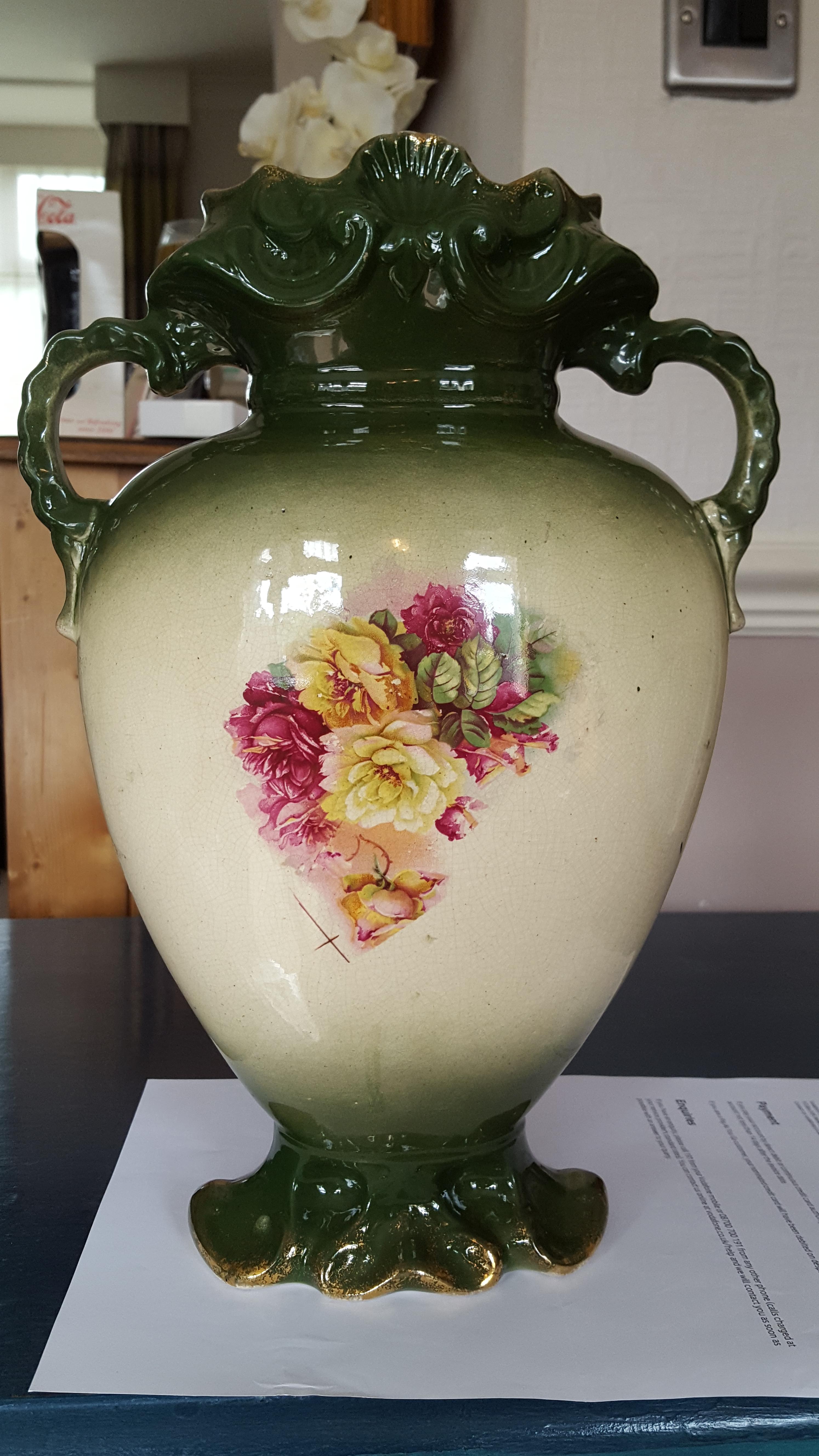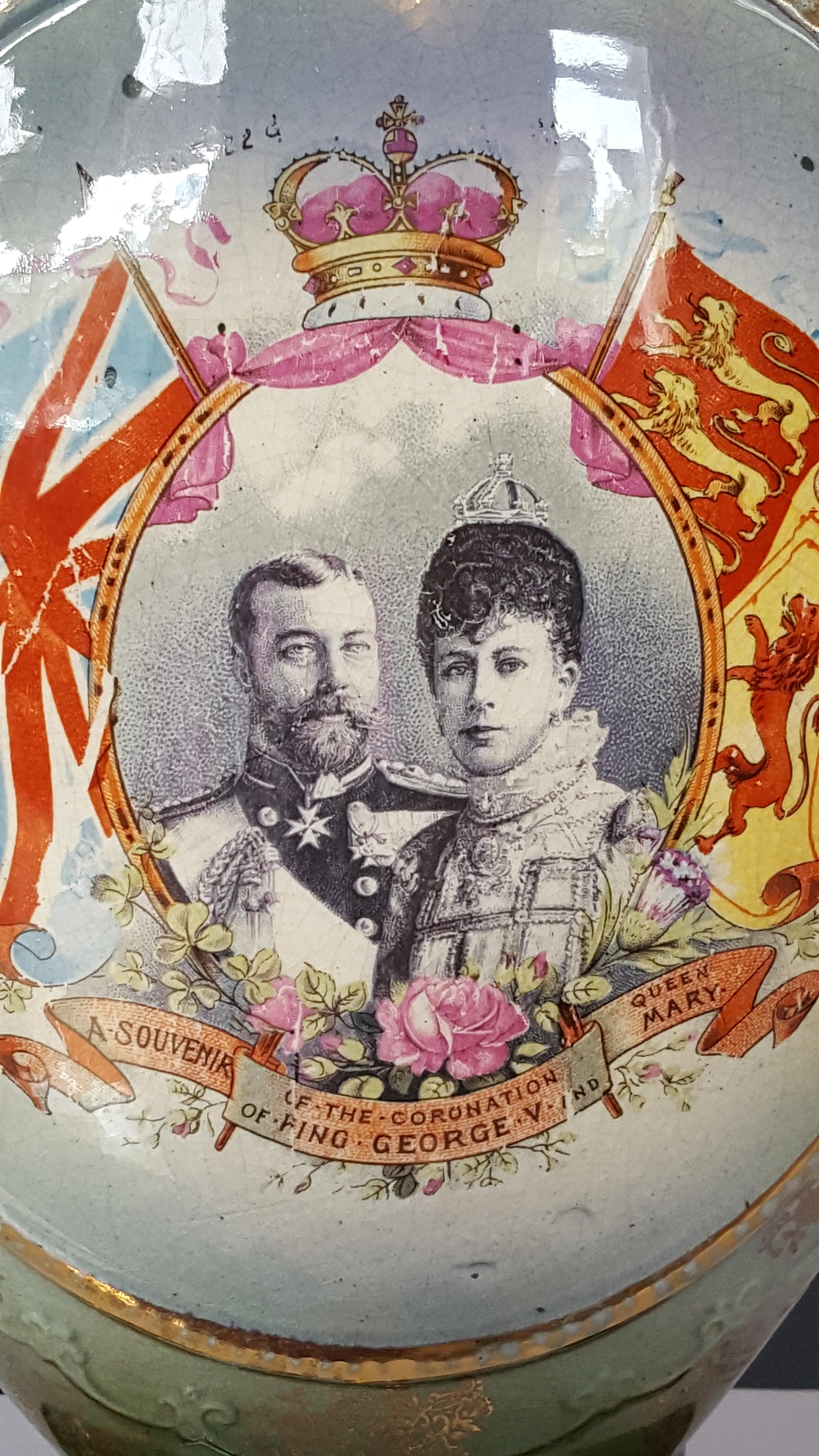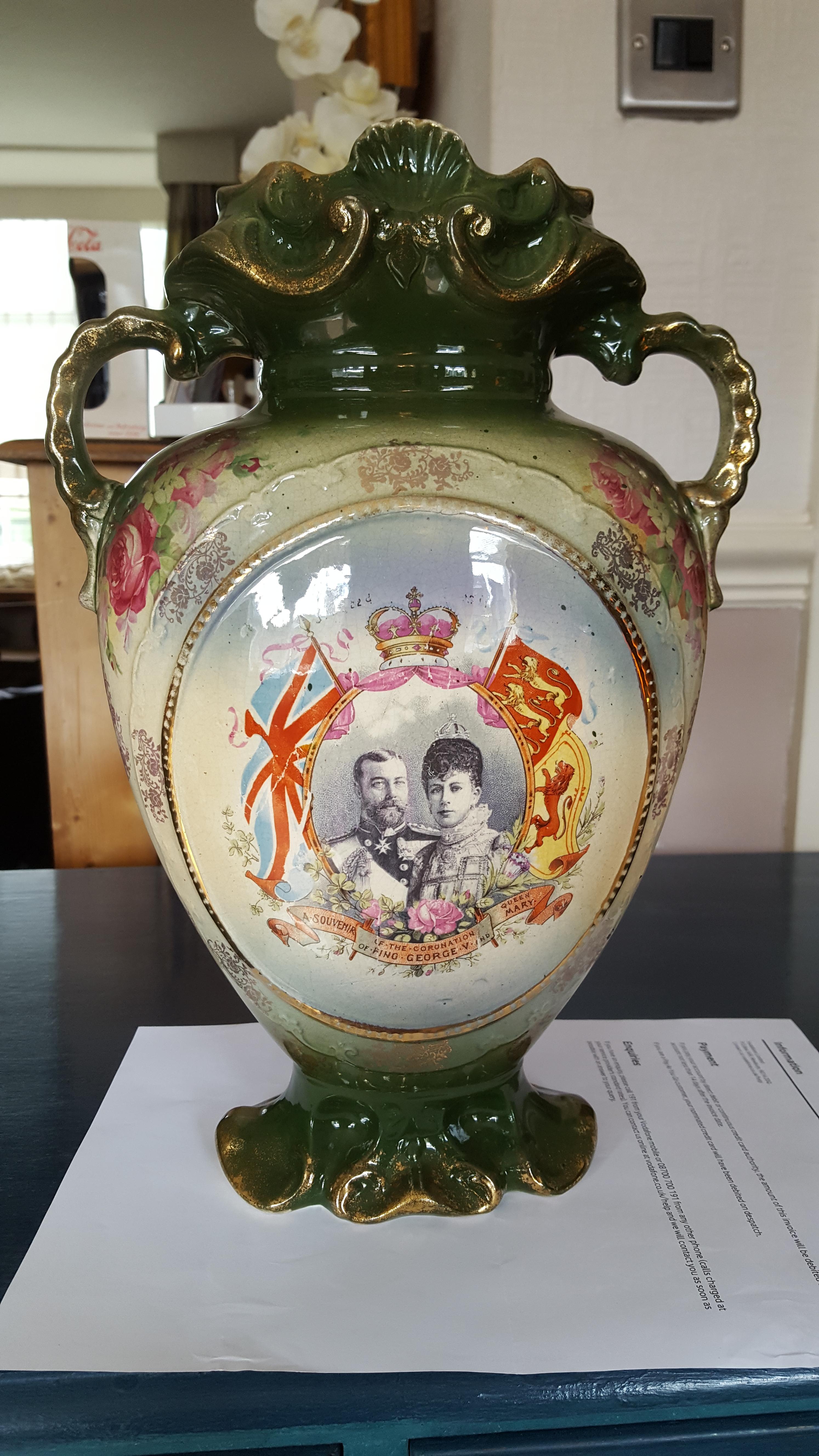 This is an ornate green and gilded vase commemorating the coronation of King George V and Queen Mary in 1911.  It reads 'A souvenir of the coronation of King George V and Quuen Mary' in the banner.  It stands approx 12in tall/30cm.