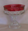 Pedastal bowl that is clear with red lining the top. it has "thumbprints"