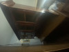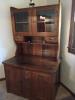 In 2 pieces; top has "old world glass" in doors. Bottom piece has backsplash with wooden spacers that you can place ceramic tiles in the frames. Two drawers with cuteold hardware & large storage & shelf behind double doors. Dimensions: 6 1/2' tall; 18" deep; 44" wide. Color is muted gray-green with naturally distressed finish.