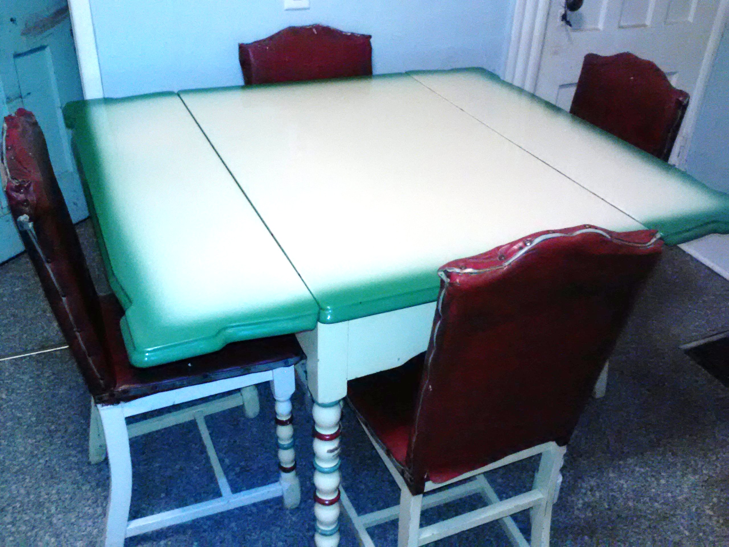 1940's- 1950's porcelain kitchen table & 4 chairs. Table includes drawer & drop leaves. yellow w/green trim