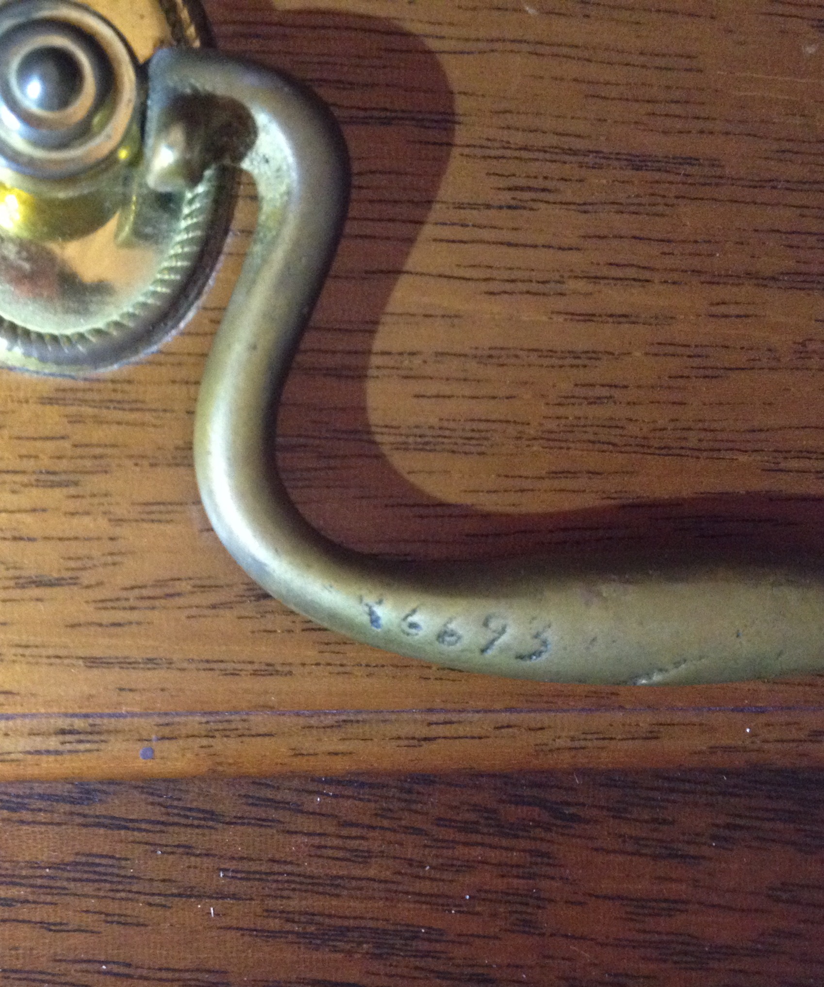 Medium Wood with brass hardware. Boards on back of the dresser are held in place by nails. Drawers are assembled using dove tails for the joints.