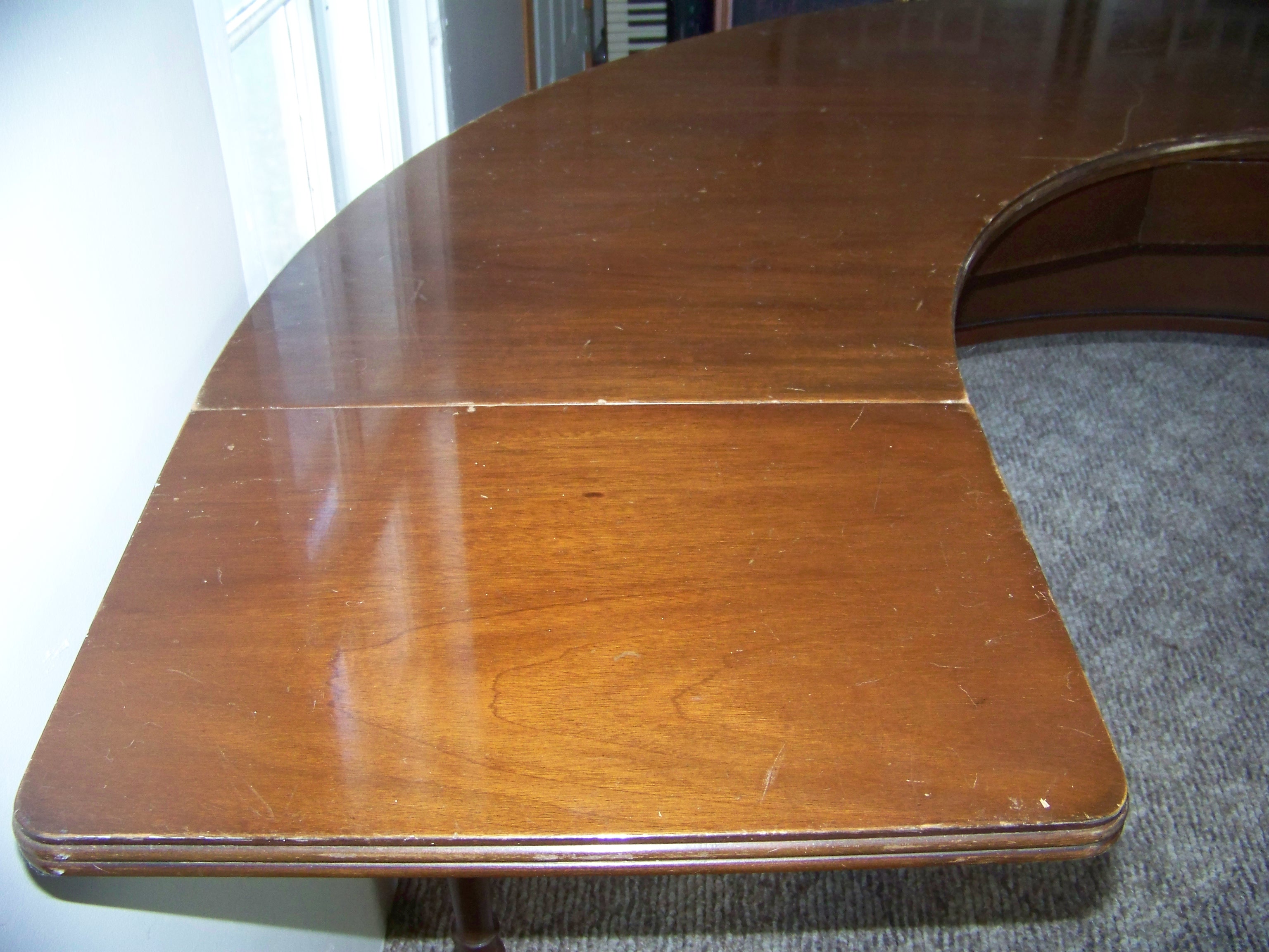 This is a mahogony Kittinger half circle desk with run-off or typing extension. It has one center drawer, a small extension that drops down on the left (12") and a typing extension (36" long and 26" high) on the right. There are brass wheels on the legs. Inside the drawer is a brass plate that reads; Kittinger, Furniture Craftsmen since 1866,