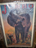 There are two orange elephants holding a banner in the middle, the box is brown on two opposite corners and cream w/ orange stripes on the other two corners.