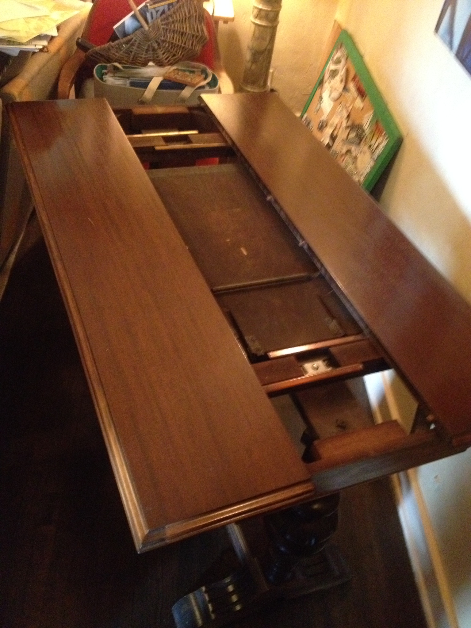 The table is in extremely good condition, it unfolds easily and the extention piece is pristine. the wood is dark and the legs are beautifully carved and extremely sturdy. I would say this table weighs between 50 - 55 pounds. I can lift the table by myself and move it.