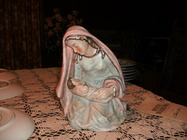Mary is kneeling with baby in her arms. She has a pink shawl over her head no halo, pale blue dress. Baby's head in on her right arm, and she is looking down at him!