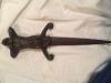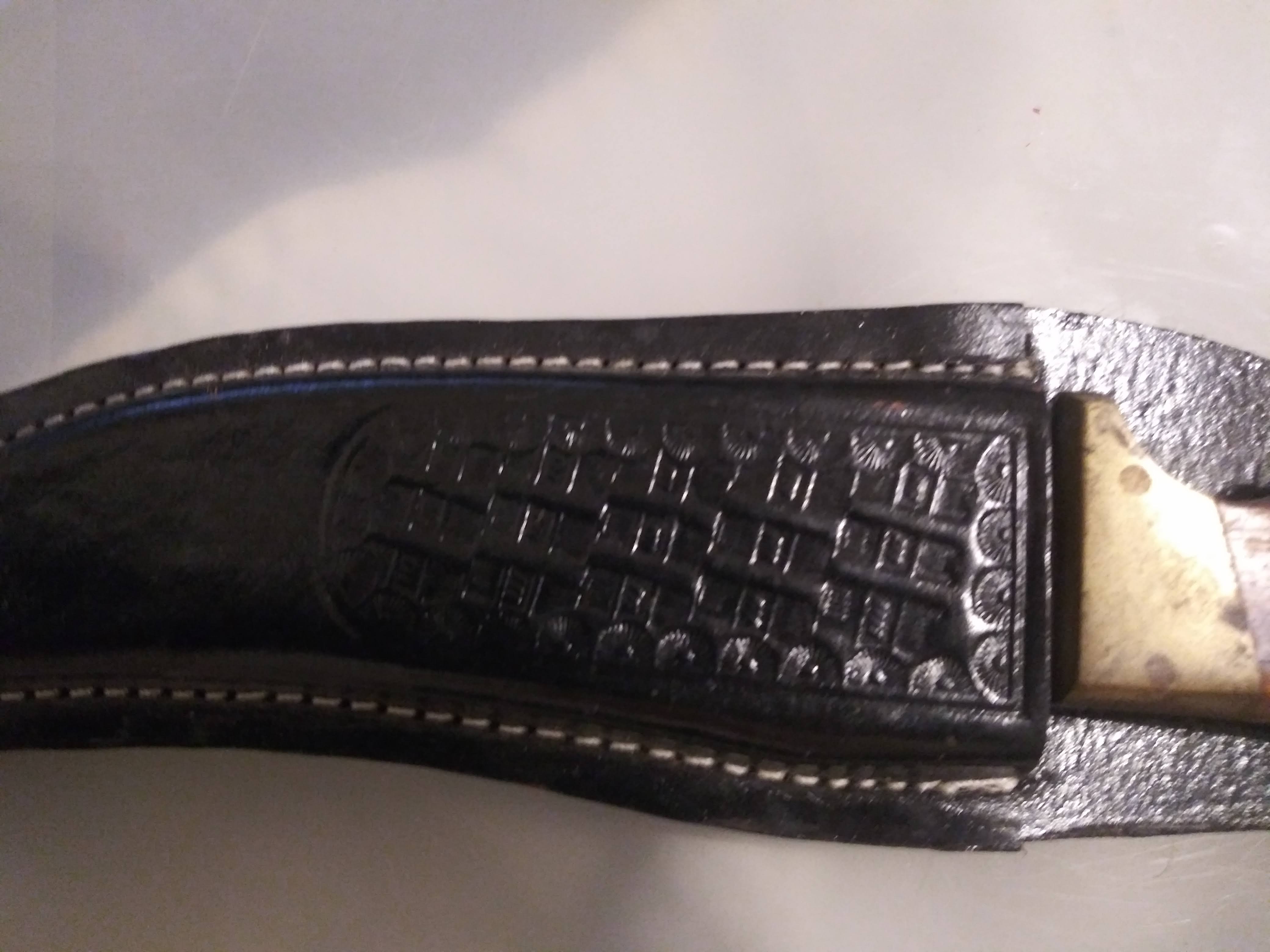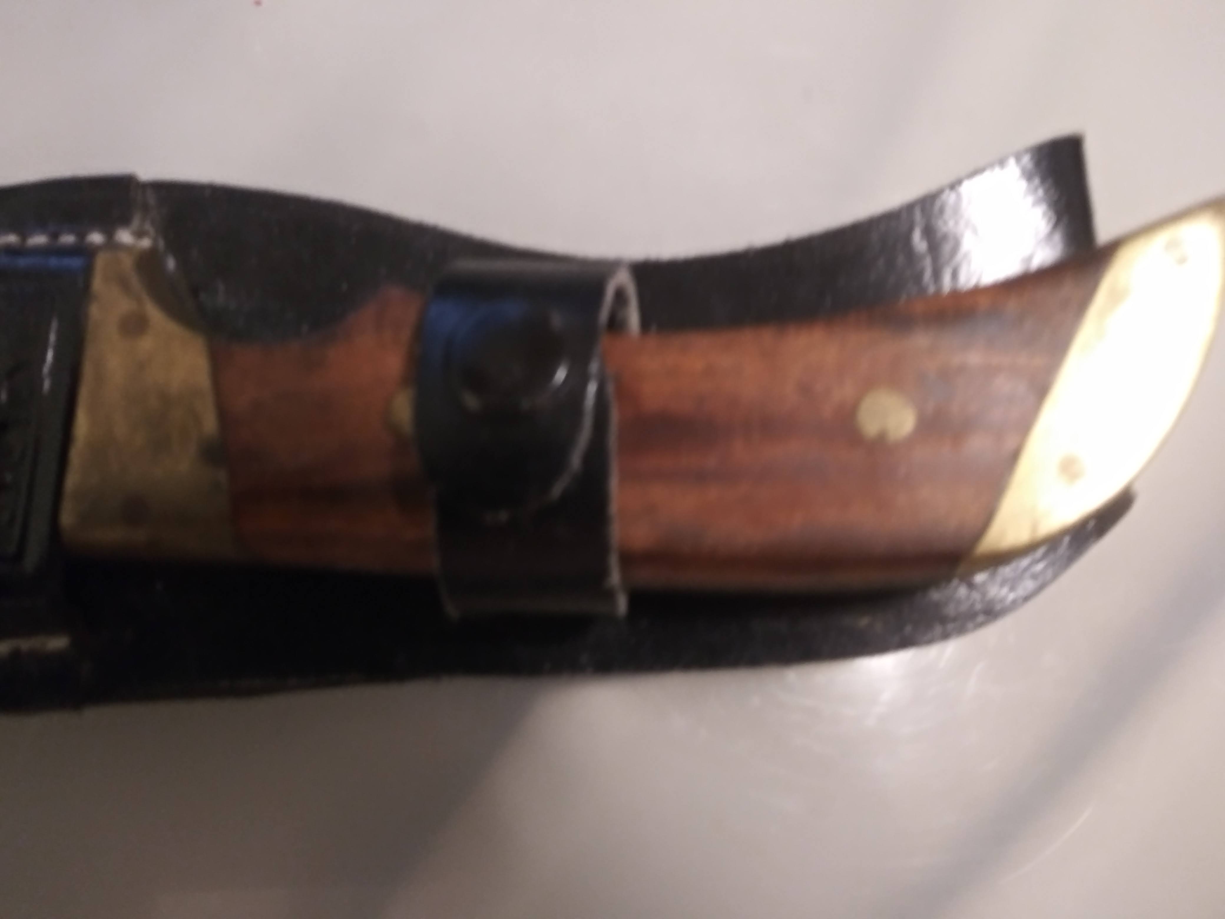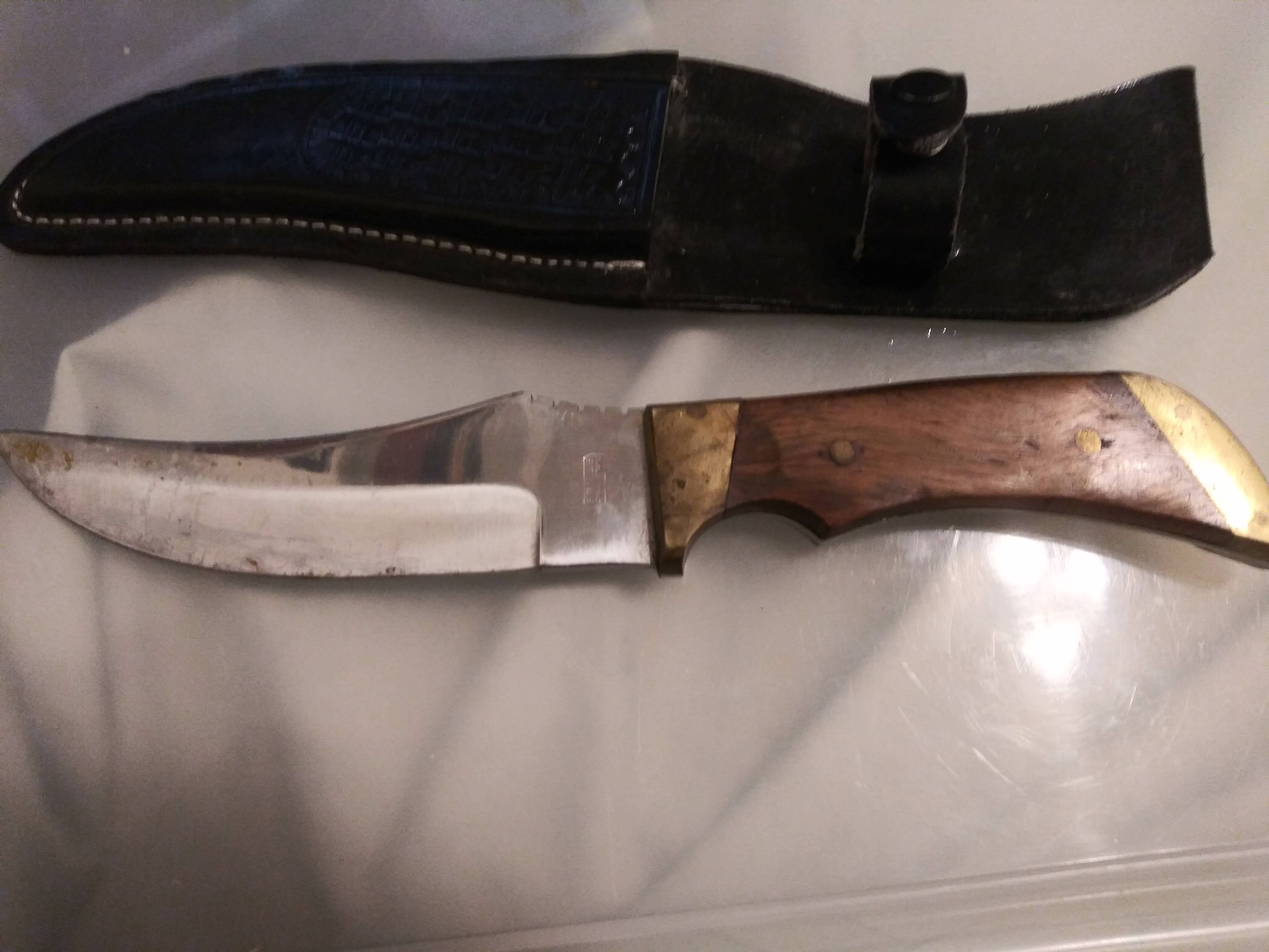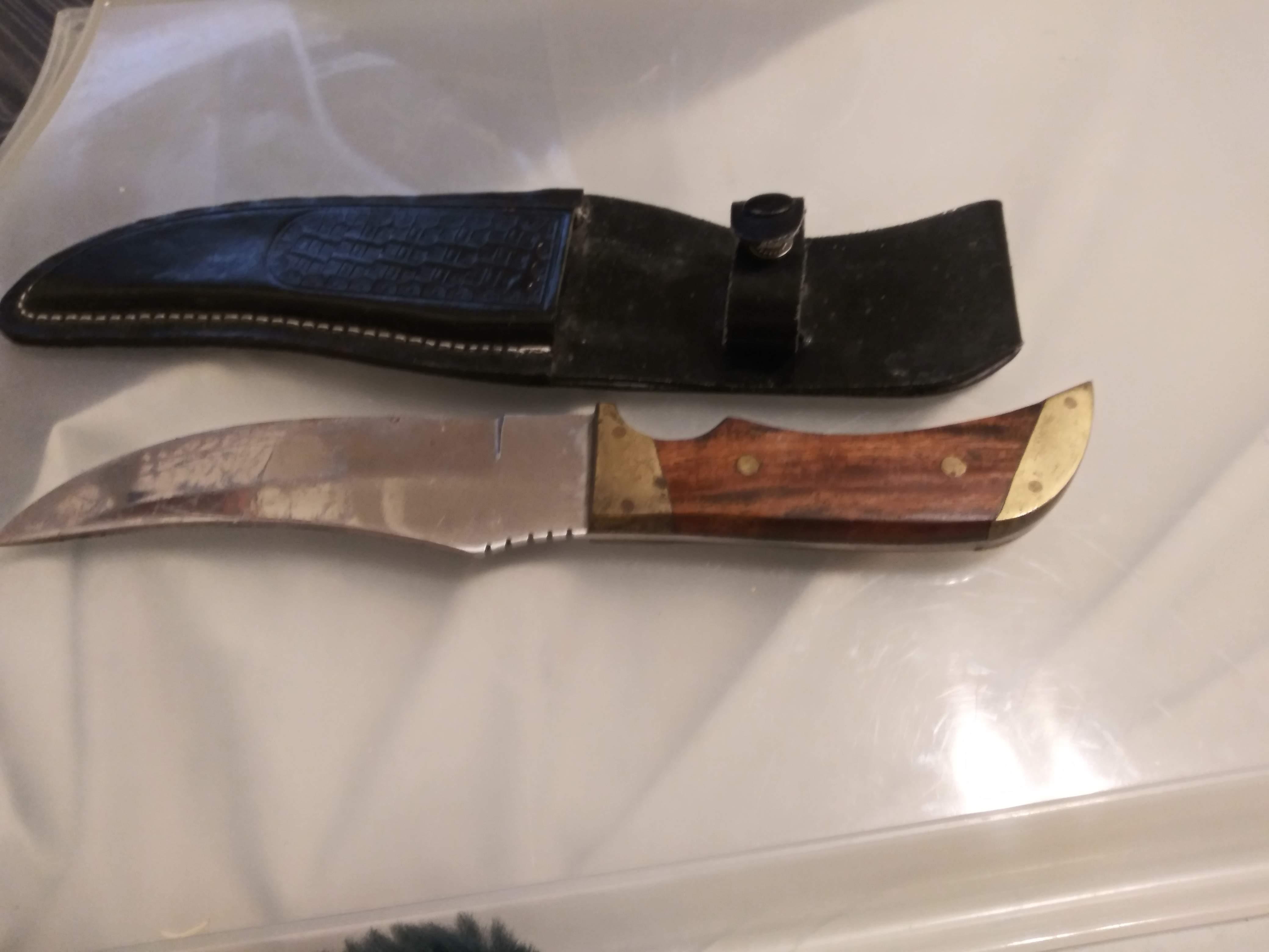 About 12" with "Stainless Pakistan" engraved on knife. The sheath appears to be leather and the handle is wood with some metal inlaid.