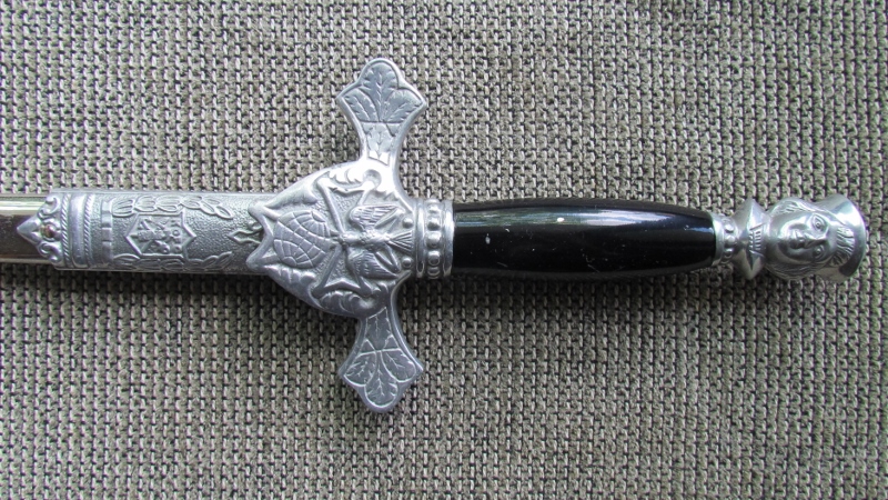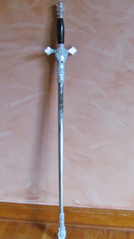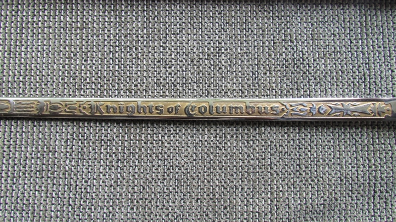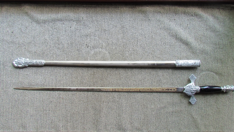 Sword is in excellent condition. It is of the newest generation of these swords. Hilt and decorative sheath ends are made of nickle-plated aluminum, and the blade made of base metal coated in chrome. "Knights of Columbus" is etched into the blade. Ceremonial sword worn by knights of the fourth degree.
