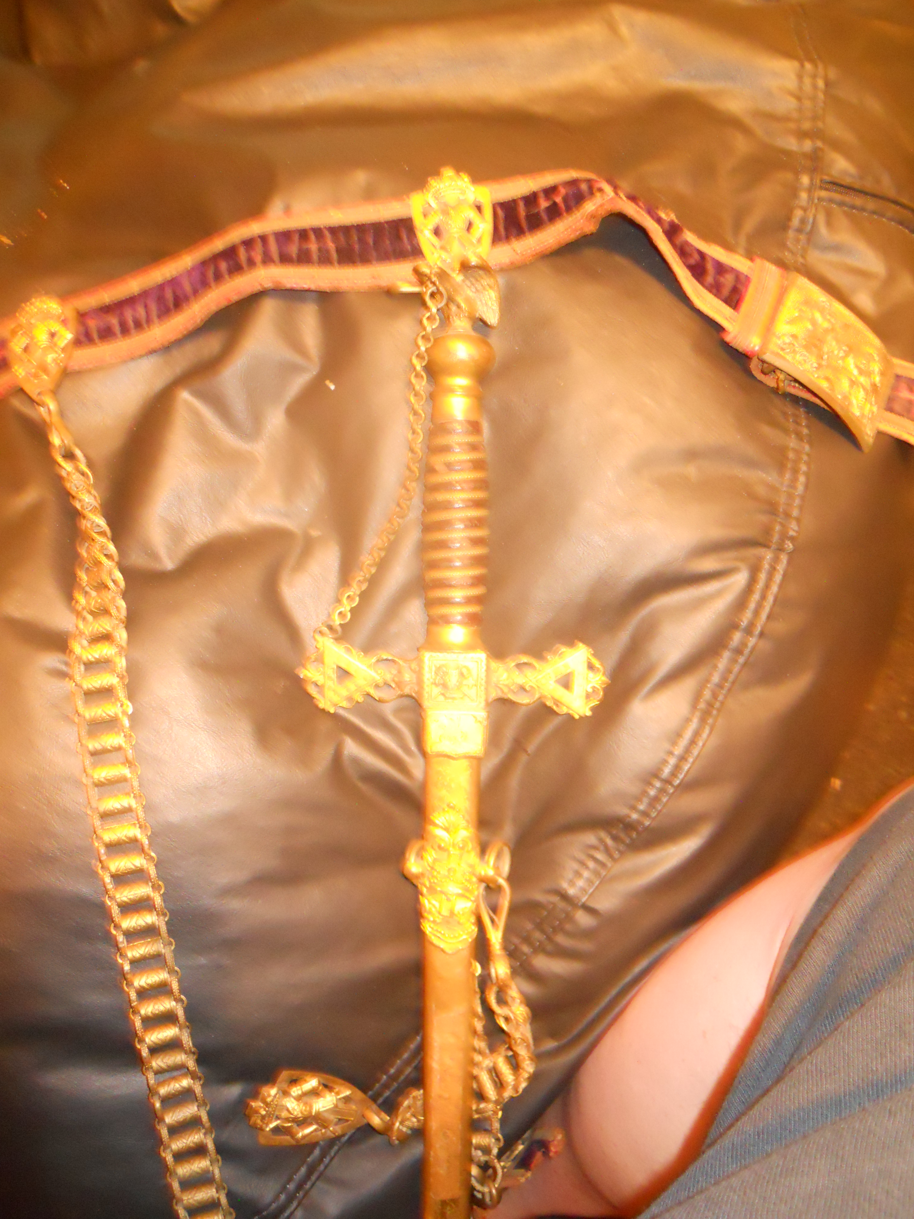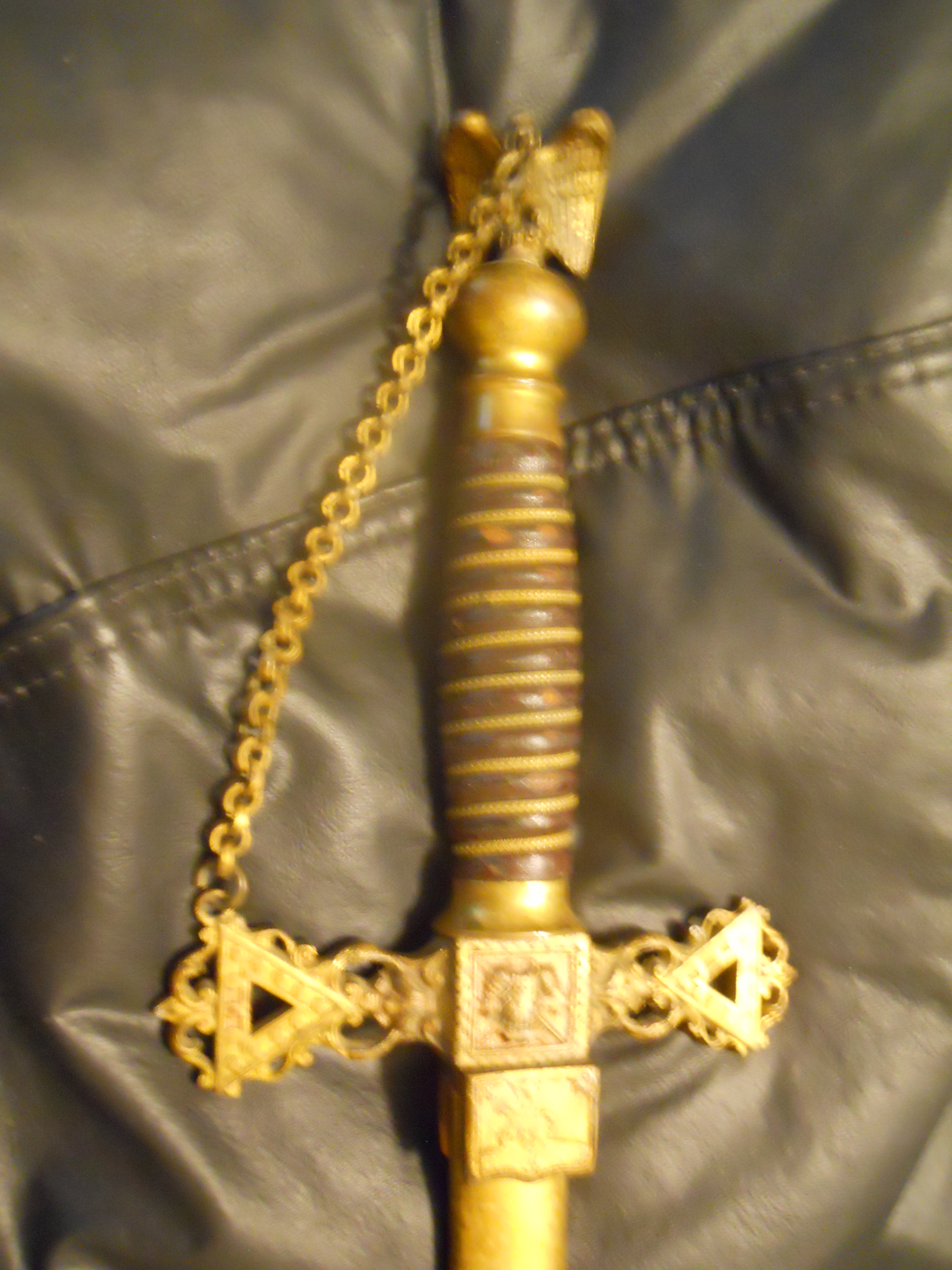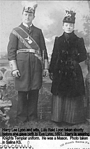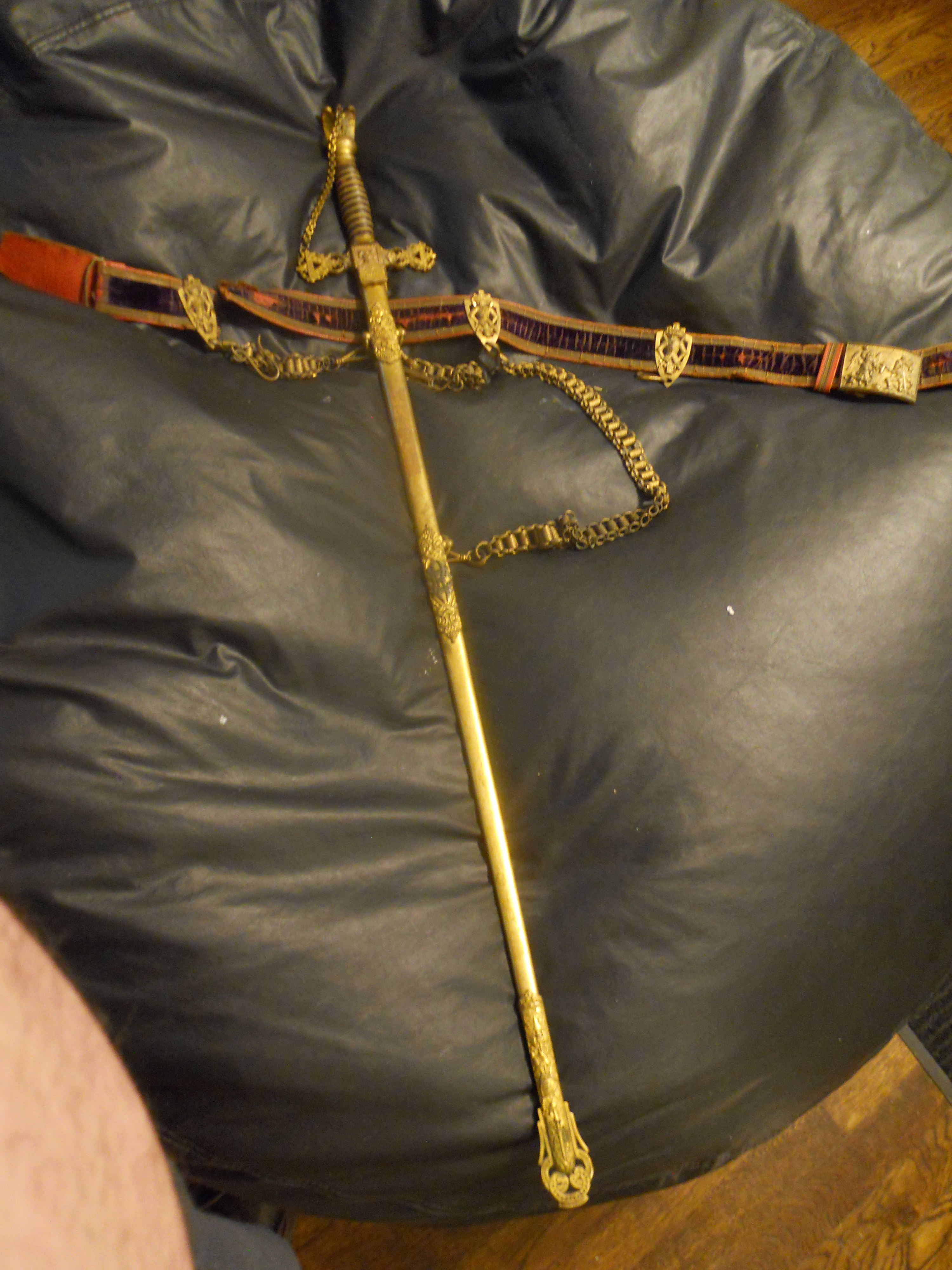 Knights of the Golden Eagle, ceremonial sword, with Harry Lyon printed on the blade. Picture of Harry Lyon, wearing sword, taken 1891 or slightly earlier, in Salina, KS. Tip of sword broken off, resharpened by my father sometime around 1962.